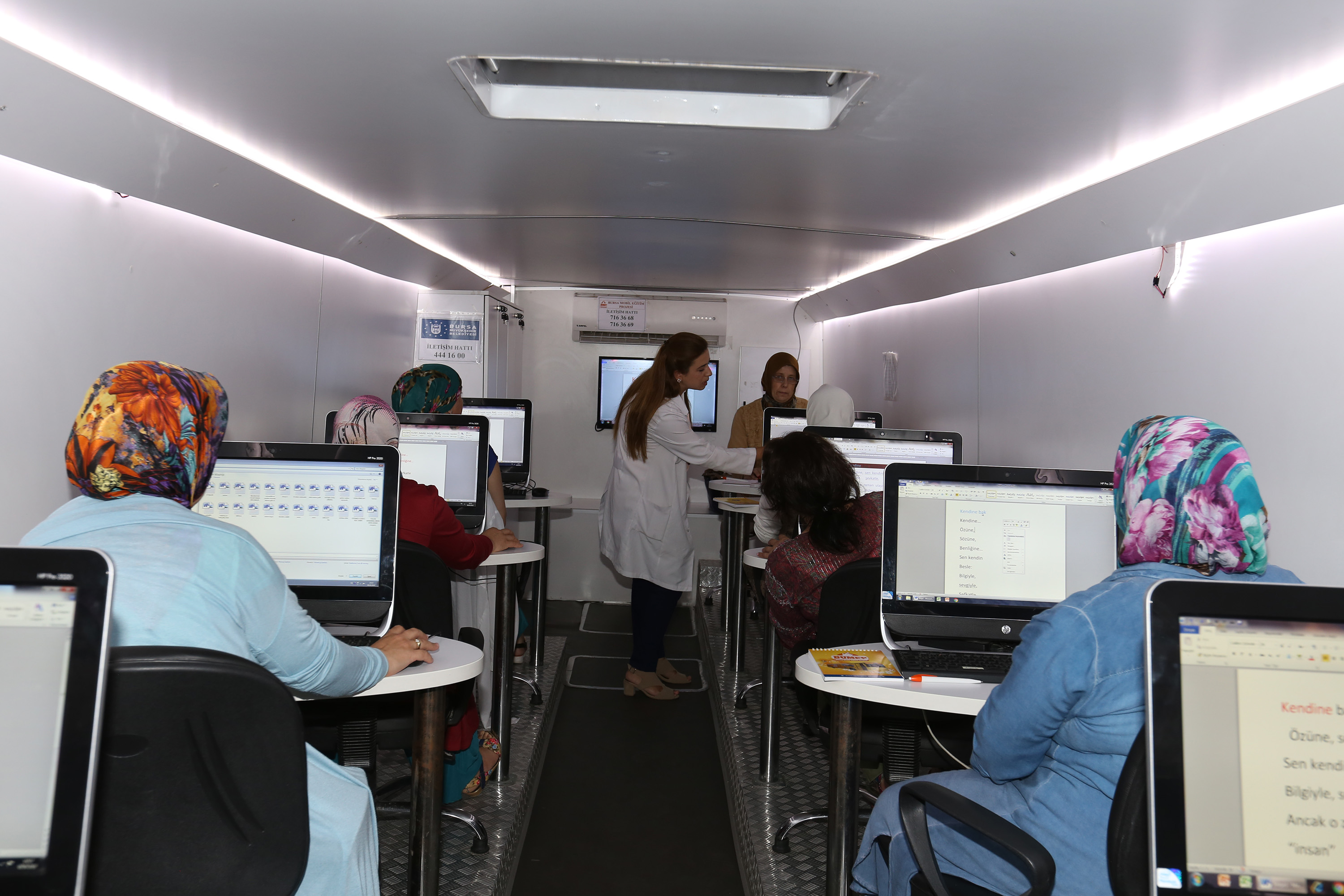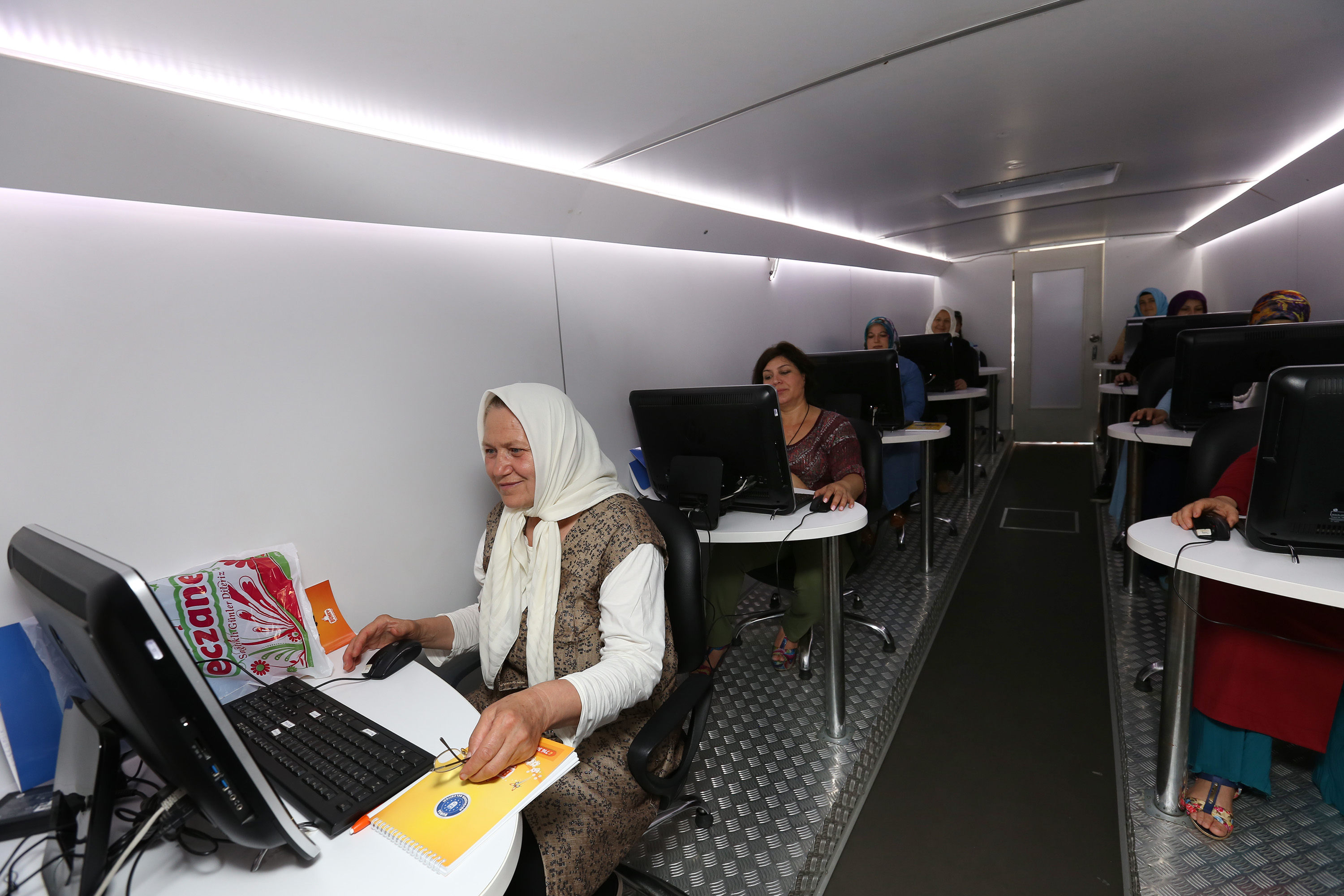 Bursa’da 16 yaşını doldurmuş kadınların sosyal, ekonomik, kültürel ve siyasal yaşamdaki konumlarını güçlendirmek hak, fırsat ve imkânlardan eşit bir biçimde faydalanmalarını sağlamak amacıyla hayata geçirilen projeye vatandaşlar büyük ilgi gösteriyor. Aile bireylerinin yetiştirilmesinde aileye destek olmayı, gelişen teknolojiyi yakından izlemeyi, çocuklarının eğitimlerine katkıda bulunmayı hedefleyen proje kapsamında özel bilgisayar dersliği haline getirilmiş, ferah ve kullanışlı otobüslerde, uzman eğitmenler aracılığıyla, mahallelerde kadınlara ücretsiz bilgisayar ve internet eğitimleri veriliyor. Hafta boyunca her mahallede 8 farklı grupta 80 kişiye eğitim verilen projede, ilk eğitimlerin başladığı 2011 yılından bugüne dek yaklaşık 26 bin vatandaşa ulaştı.