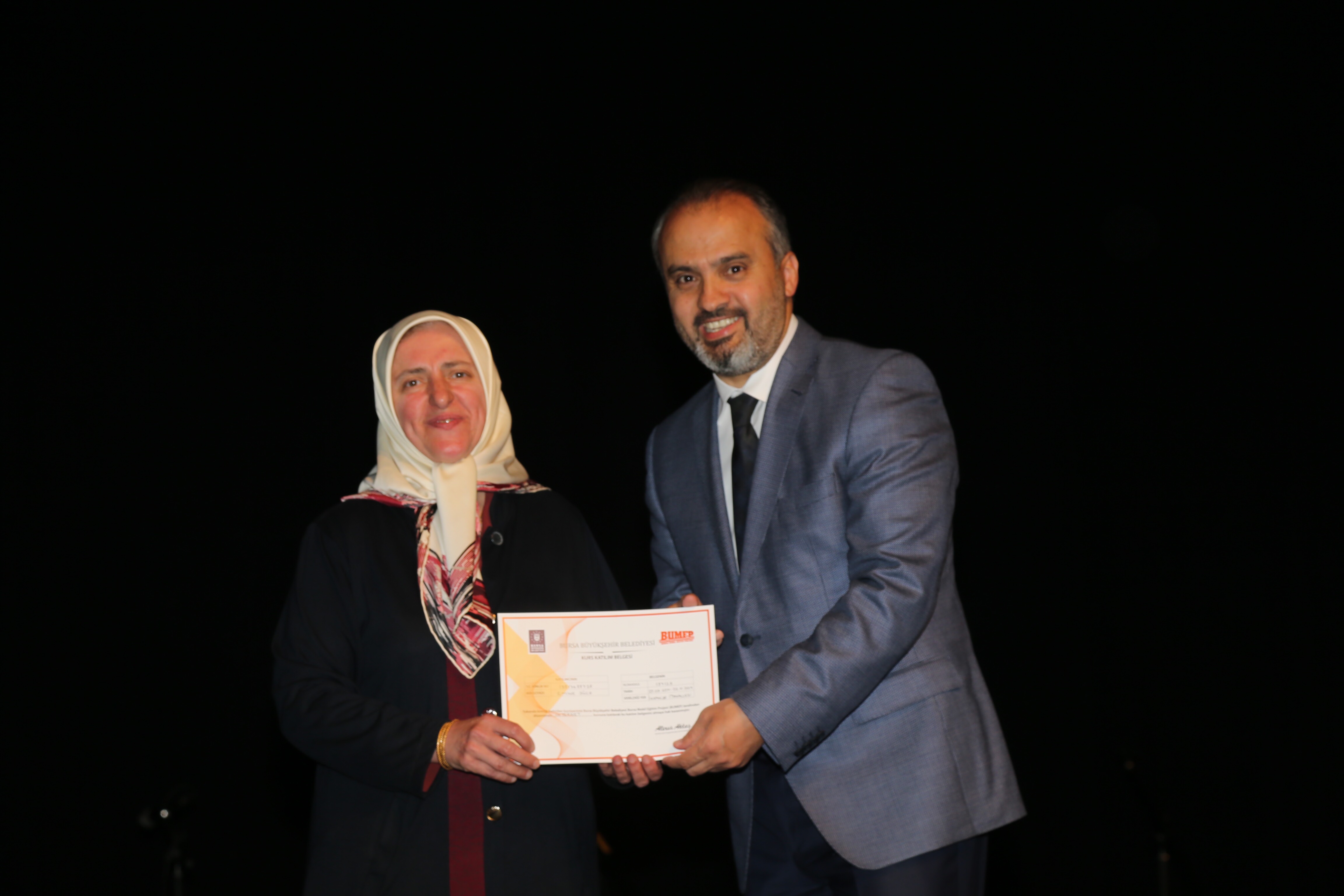 Konuşmasının ardından Başkan Aktaş, BUMEP ve BENMEP kursiyerlerine katılım belgelerini verdi. BUMEP kurslarına 3 nesil birlikte katılan anneanne Türkan Parkan ile kızı ve torunu Müjgan ve Bihter Uzel, törenin en ilgi çeken isimlerindendi. BUMEP kursiyerlerinden Çiğdem Sarıbal ve BENMEP kursiyerlerinden Esra Dündar ile kursların verildiği mahallerden biri olan Yavuz Selim Mahallesi Muhtarı Atilla Yaşar, vatandaşların sosyal yaşamlarına büyük katkı sağlayan eğitimlerden dolayı Başkan Aktaş’a teşekkür etti.