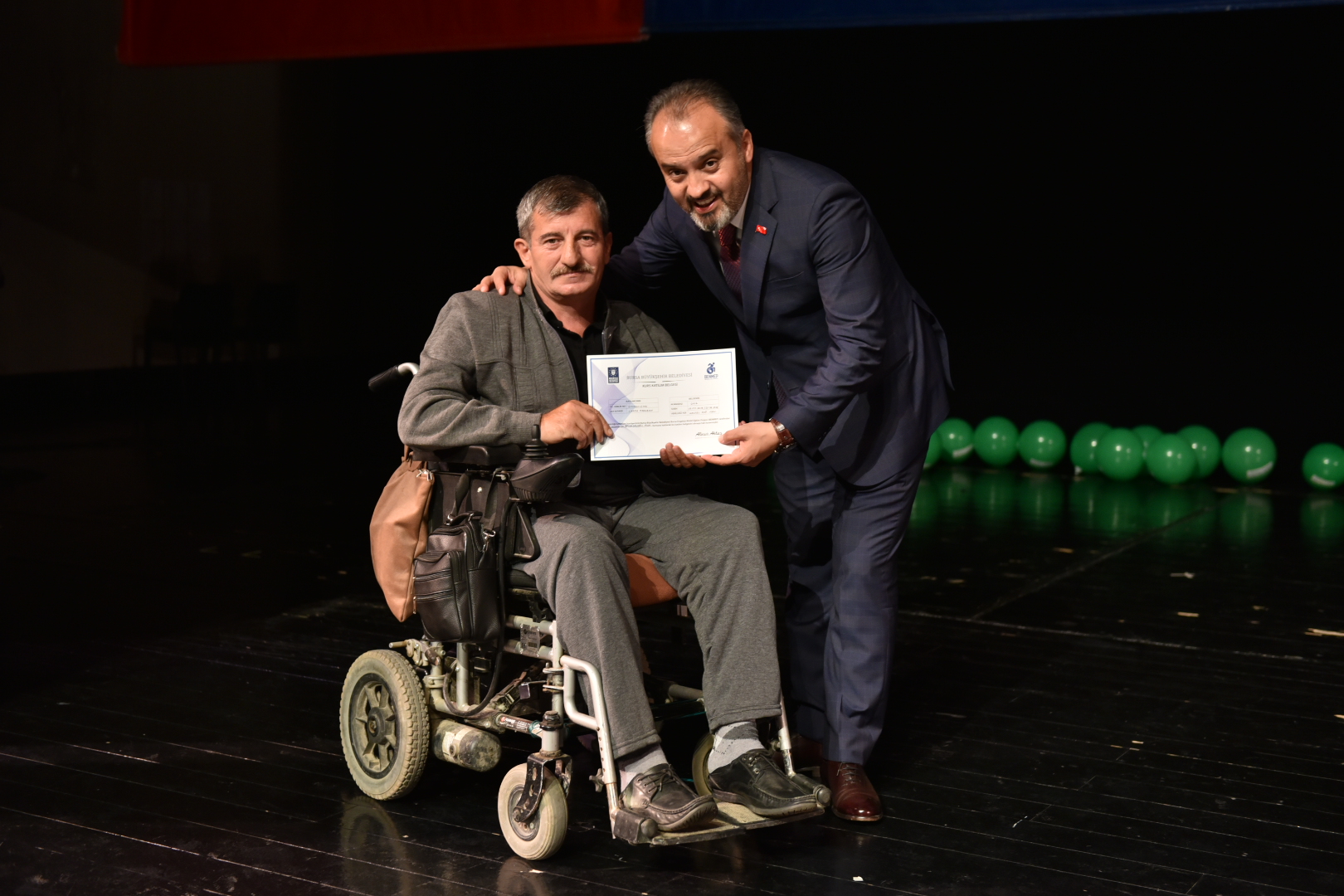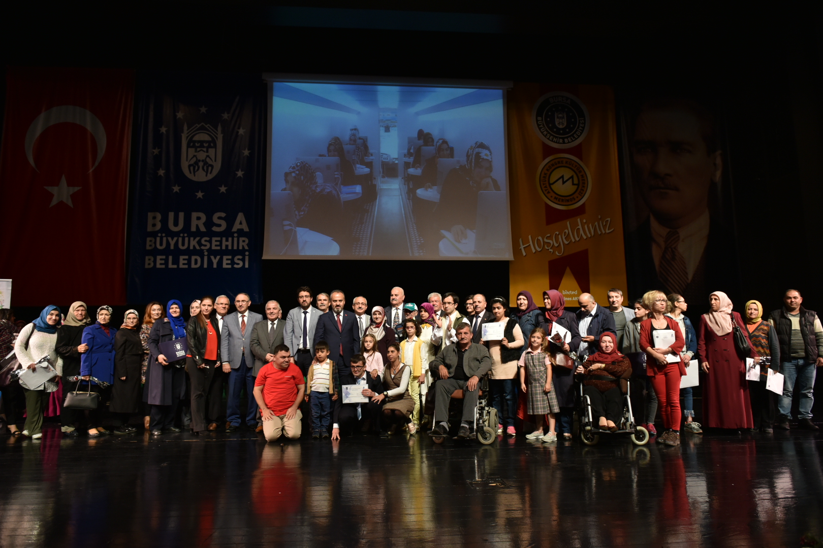 Eğitim yolculuğuna 2013 yılında başlayan BENMEP projesiyle de Bursa genelinde 16 bin 37 vatandaşa ulaşıldığını hatırlatan Başkan Aktaş, 2013-2018 yılları arasında 13 farklı ilçe 82 farklı eğitim noktasında toplam 2 bin 757 engelli vatandaşın mezun edildiğini kaydetti. 2017-2018 döneminin 3 eğitim noktasında devam ettiğini anlatan Başkan Aktaş, “Bursa Engelsiz Mobil Eğitim Projesi’yle bugüne kadar Osmangazi, Yıldırım, Orhangazi, Gemlik, Mudanya, Kestel, Gürsu, Nilüfer, Mustafakemalpaşa, İnegöl, Karacabey, Yenişehir ve İznik ilçelerinde eğitimler verildi. Bu faaliyetlerde temel bilgisayar eğitimi dışında bilgisayarlı muhasebe alanında eta, logo, mikro programları ve grafik tasarım programları anlatıldı. Projemizin eğitim vermeyi planladığı ilçeler arasında Keles, Orhaneli, Büyükorhan ve Harmancık da bulunuyor. Bugün eğitimlerini tamamlayan 338 kursiyerimize belgelerini takdim ediyoruz. Her birinizi tebrik ediyorum” diye konuştu.