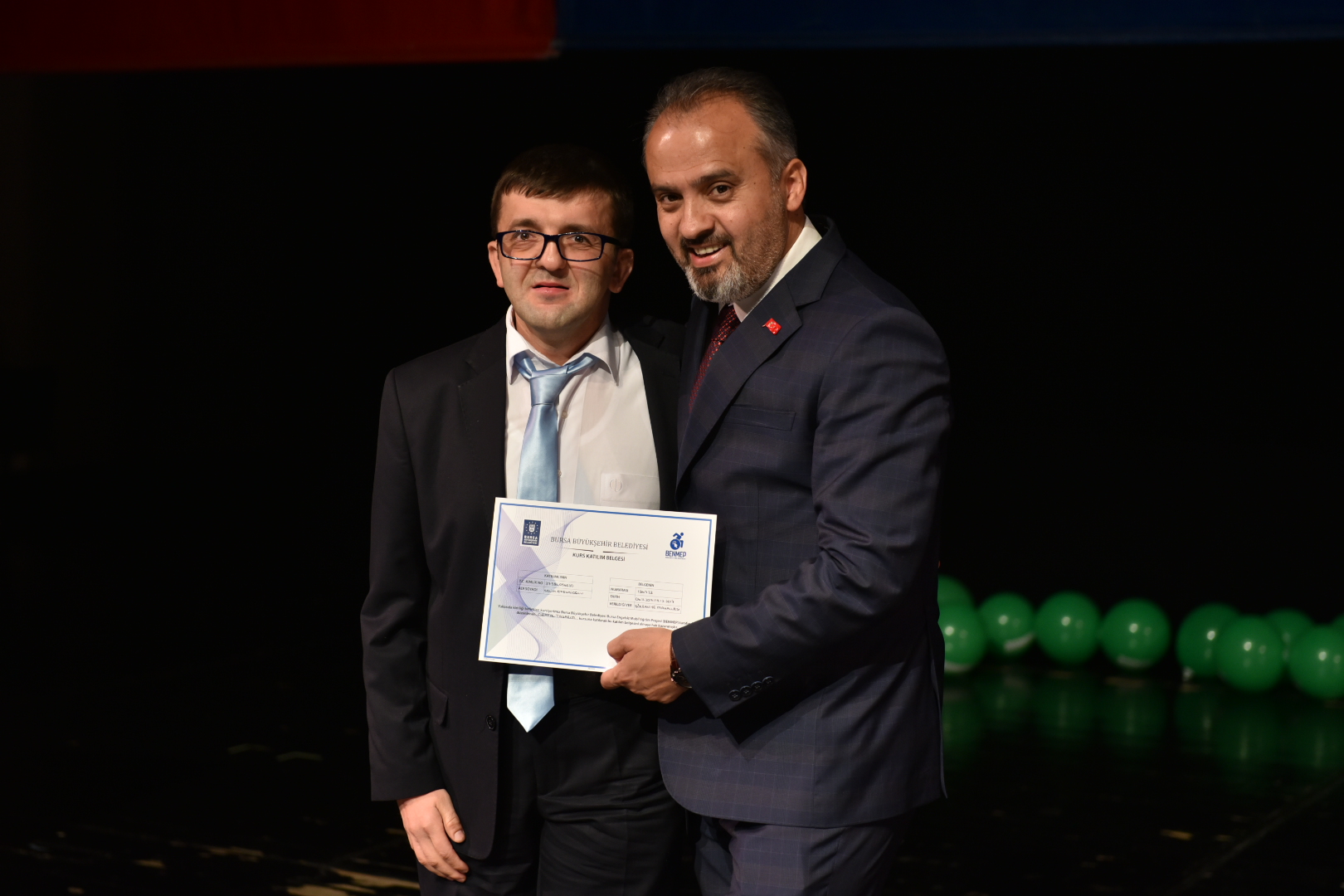 Büyükşehir Belediyesi’nin sosyal sorumluluk odaklı hizmetlerinden Bursa Mobil Eğitim Projesi (BUMEP) ve Bursa Engelsiz Mobil Eğitim Projesi (BENMEP), binlerce insana nitelikli iş gücü kazandırmaya devam ediyor. Özellikle ev hanımlarının bilgiye daha rahat ulaşmaları ve çocuklarının eğitimine katkı sağlayabilmeleri hedefiyle gerçekleştirilen BUMEP eğitimlerinden faydalanan 2 bin 338 kursiyer ile Türkiye’de ilk kez engelli vatandaşlara yönelik olarak gerçekleştirilen BENMEP eğitimlerine katılan 338 kursiyer, törenle katılım belgelerine kavuştu. Bursa Büyükşehir Belediyesi Sosyal İşler Şube Müdürlüğü koordinasyonunda sürdürülen Bursa Mobil Eğitim Projesi’nin (BUMEP-BENMEP) 2017-2018 eğitim dönemi son dönem katılım belgeleri dağıtım töreni Atatürk Kongre Kültür Merkezi (Merinos AKKM) Osmangazi Salonu’nda yapıldı. Program, BUMEP ve BENMEP projesinin tanıtım filminin gösterimiyle başladı. Törende BUMEP kapsamında 10 kişi, BENMEP kapsamında da 6 kişi, temsili olarak Büyükşehir Belediye Başkanı Alinur Aktaş’ın elinden belge aldı.