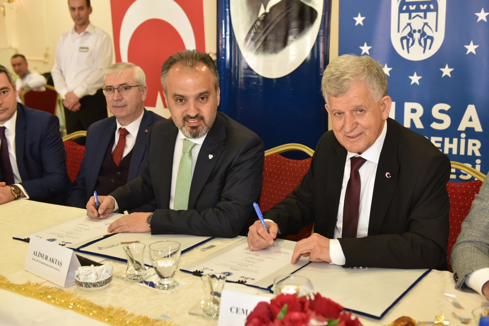 BURSA - Çalışanların maaş ve sosyal haklarında önemli iyileştirmeler getiren sözleşmeye; Büyükşehir Belediyesi adına Başkan Alinur Aktaş, TOLEYİS sendikası adına da Genel Başkan Cemail Bakındı imza attı.