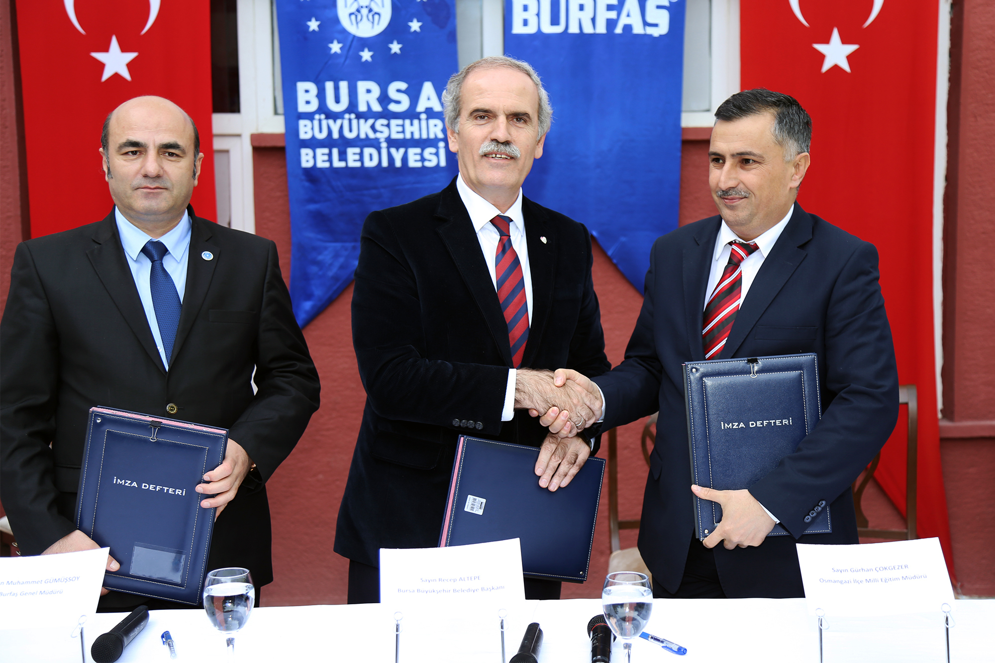 - OSMANGAZİ SINIRLARI İÇERİSİNDEKİ TURİZM OTELCİLİK MESLEK LİSELERİNDE OKUYAN ÖĞRENCİLERİN BURFAŞ TESİSLERİNDE STAJ YAPMASINA İMKAN TANIYAN PROTOKOL, BÜYÜKŞEHİR BELEDİYE BAŞKANI RECEP ALTEPE İLE İLÇE MİLLİ EĞİTİM MÜDÜRÜ GÜRHAN ÇOKGEZER ARASINDA İMZALANDI.