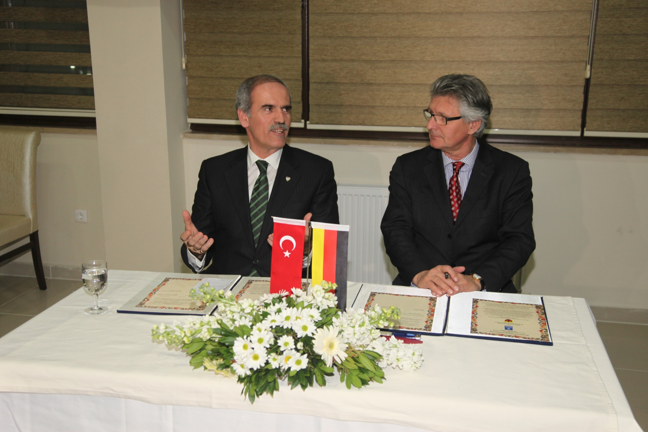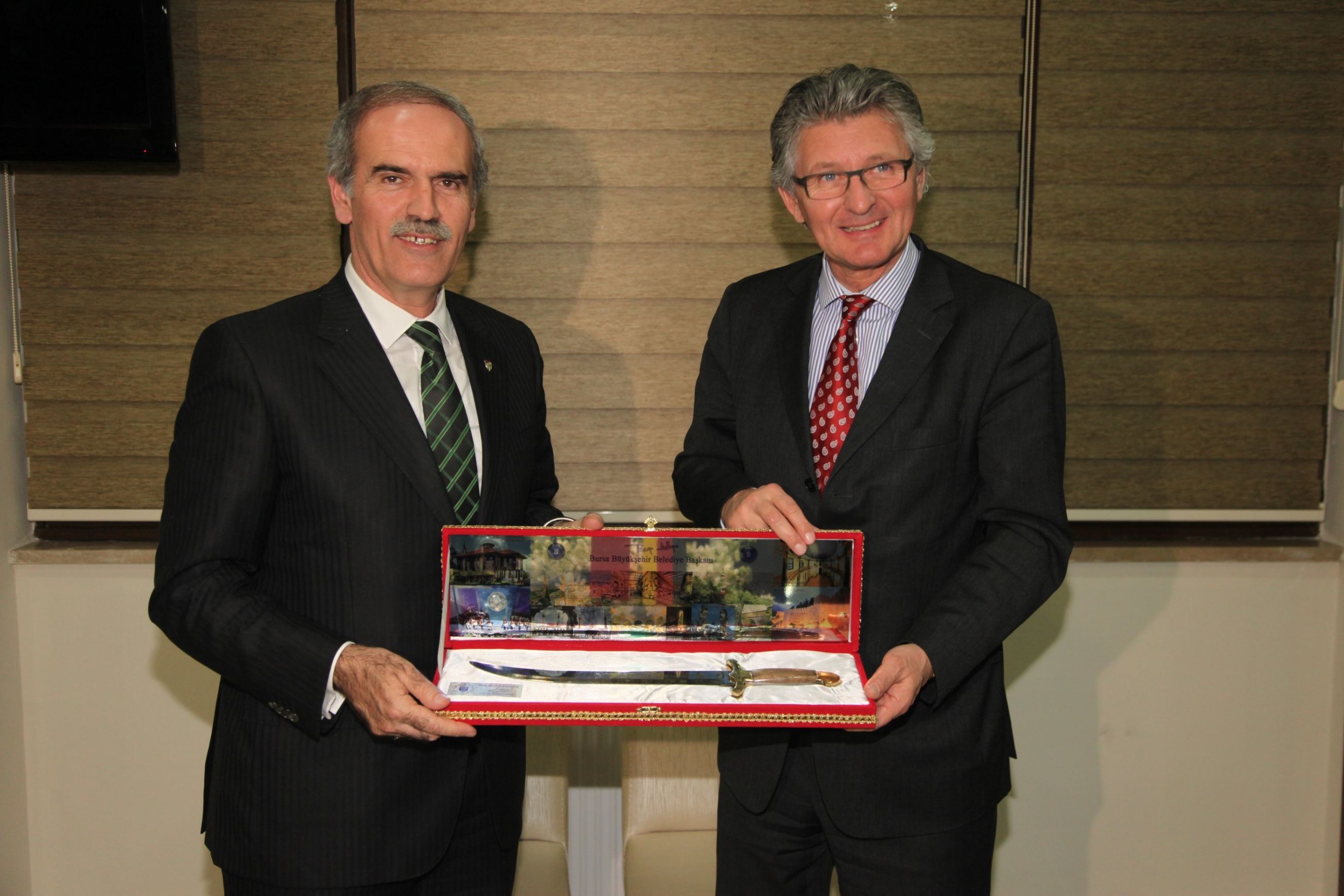 Konuşmaların ardından iki başkan arasında işbirliği protokolü imzalanırken, Büyükşehir Belediye Başkanı Recep Altepe, konuk başkana el yapımı Bursa bıçağı hediye etti.