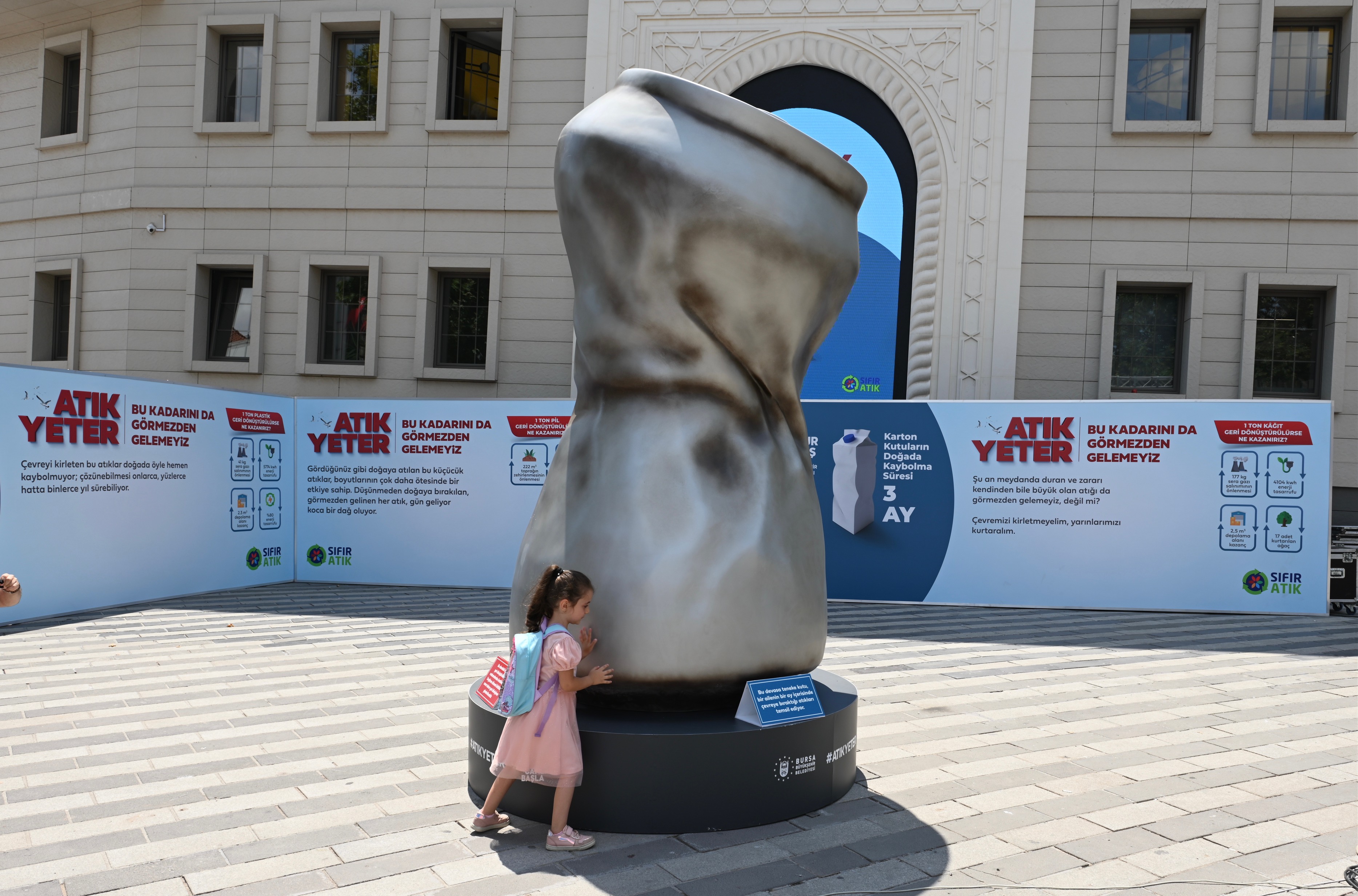 Küresel ısınma ve iklim değişiklikleri, hava, su ve toprak kirliliği gibi çevresel faktörlerle mücadele noktasında önemli altyapı projelerini hayata geçiren Bursa Büyükşehir Belediyesi, diğer taraftan çevre konusunda farkındalık oluşturacak etkinliklere de imza atıyor. Şehrin altyapısının yenilenmesi, yenilenebilir enerji kaynaklarının kullanımı, sıfır atık ve atıkların kaynağında ayrıştırılması amacıyla birçok projeyi devreye alan Büyükşehir Belediyesi, sıfır atık hareketini destekleyerek, farkındalık oluşturmak için ‘Atık Yeter’ Açık Hava Farkındalık Uygulaması başlattı. Bu kapsamında 15 Temmuz Demokrasi Meydanı’na ‘geri dönüşüm ve atıkların çevreye verdiği zararlarla ilgili bilgilerin yer aldığı’ panolar yerleştirildi. Alanın tam ortasına da Türkiye’de dört kişilik bir ailenin aylık ortalama 137,5 kilogram olan atık miktarını temsil eden dev teneke kutu konuldu.