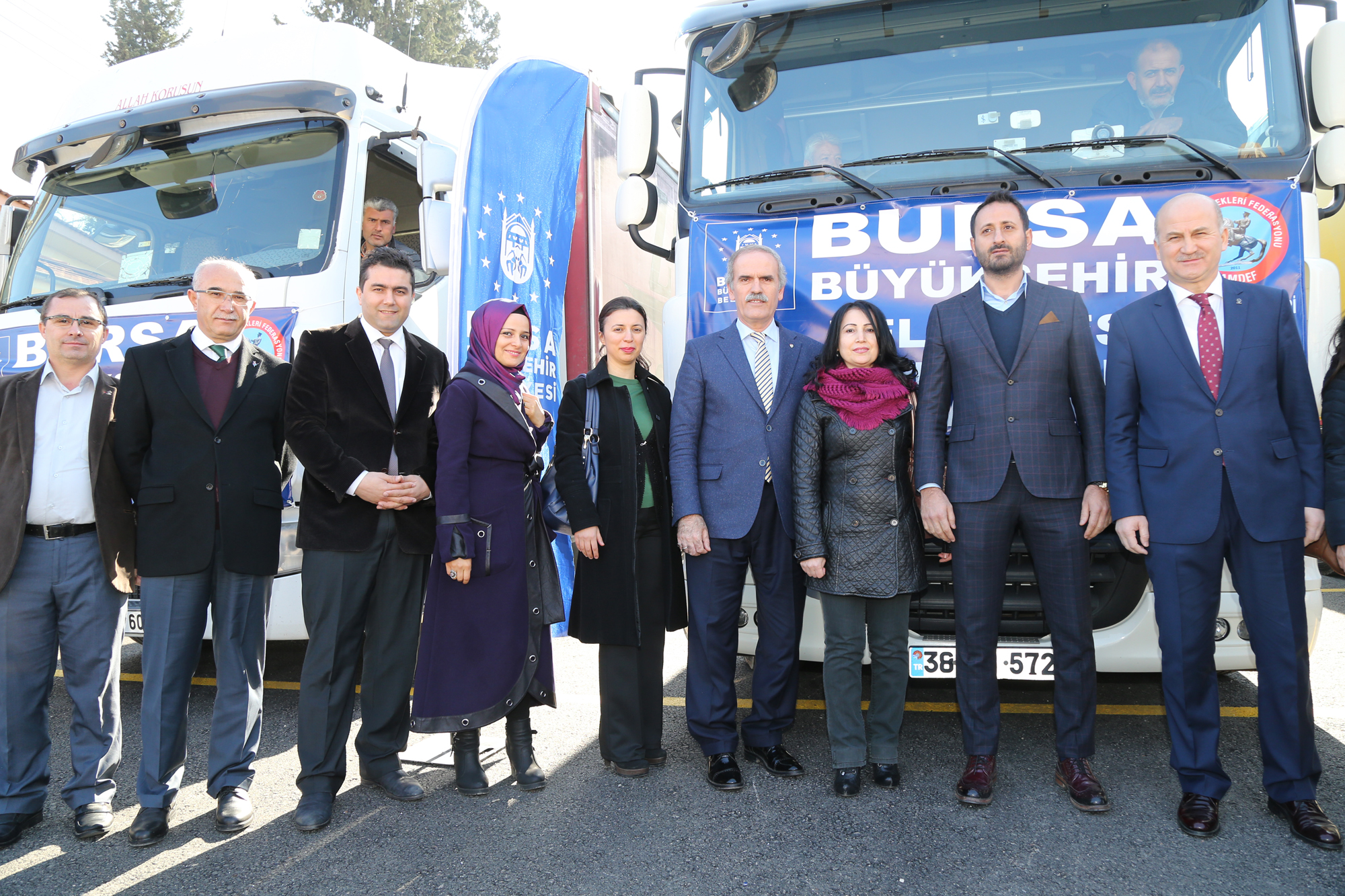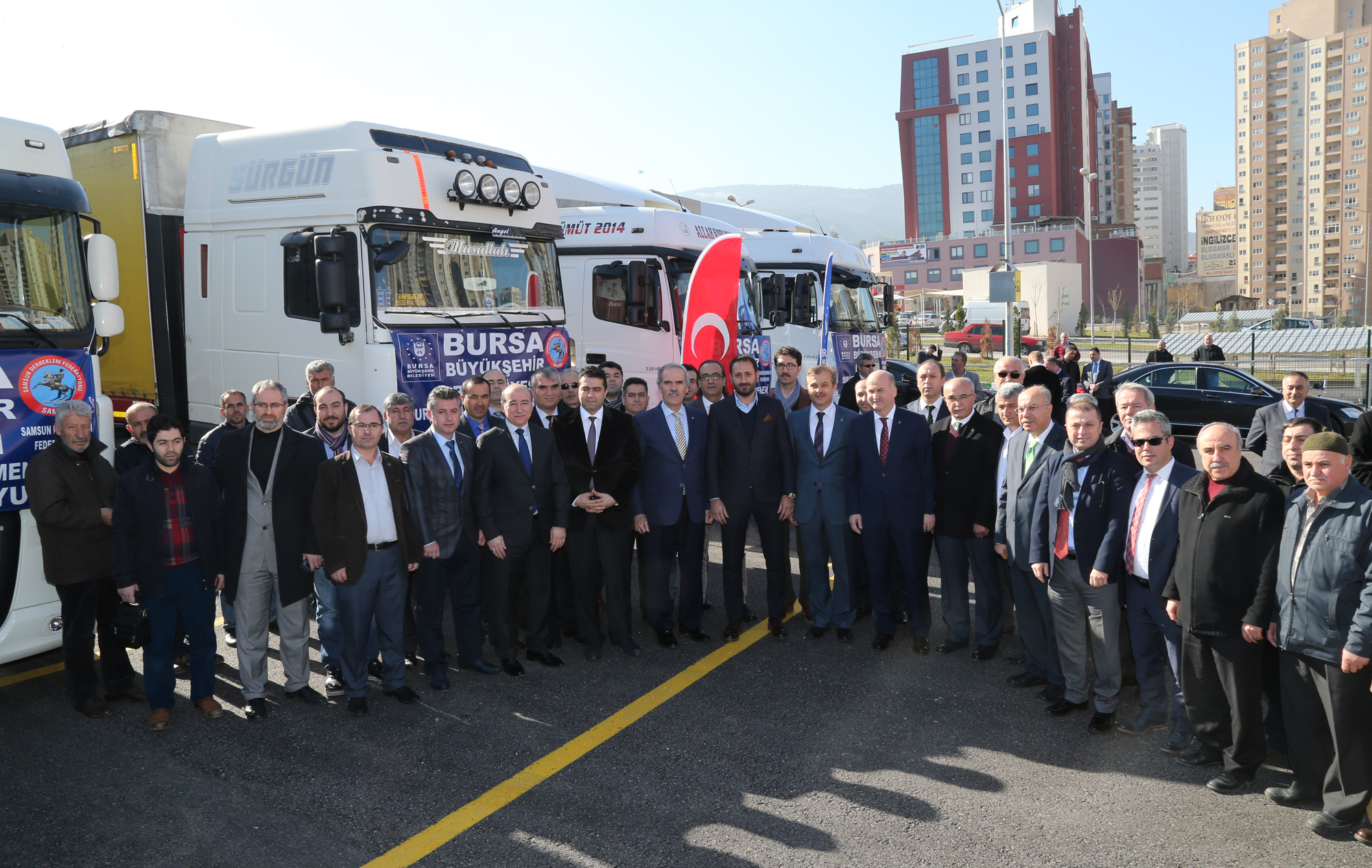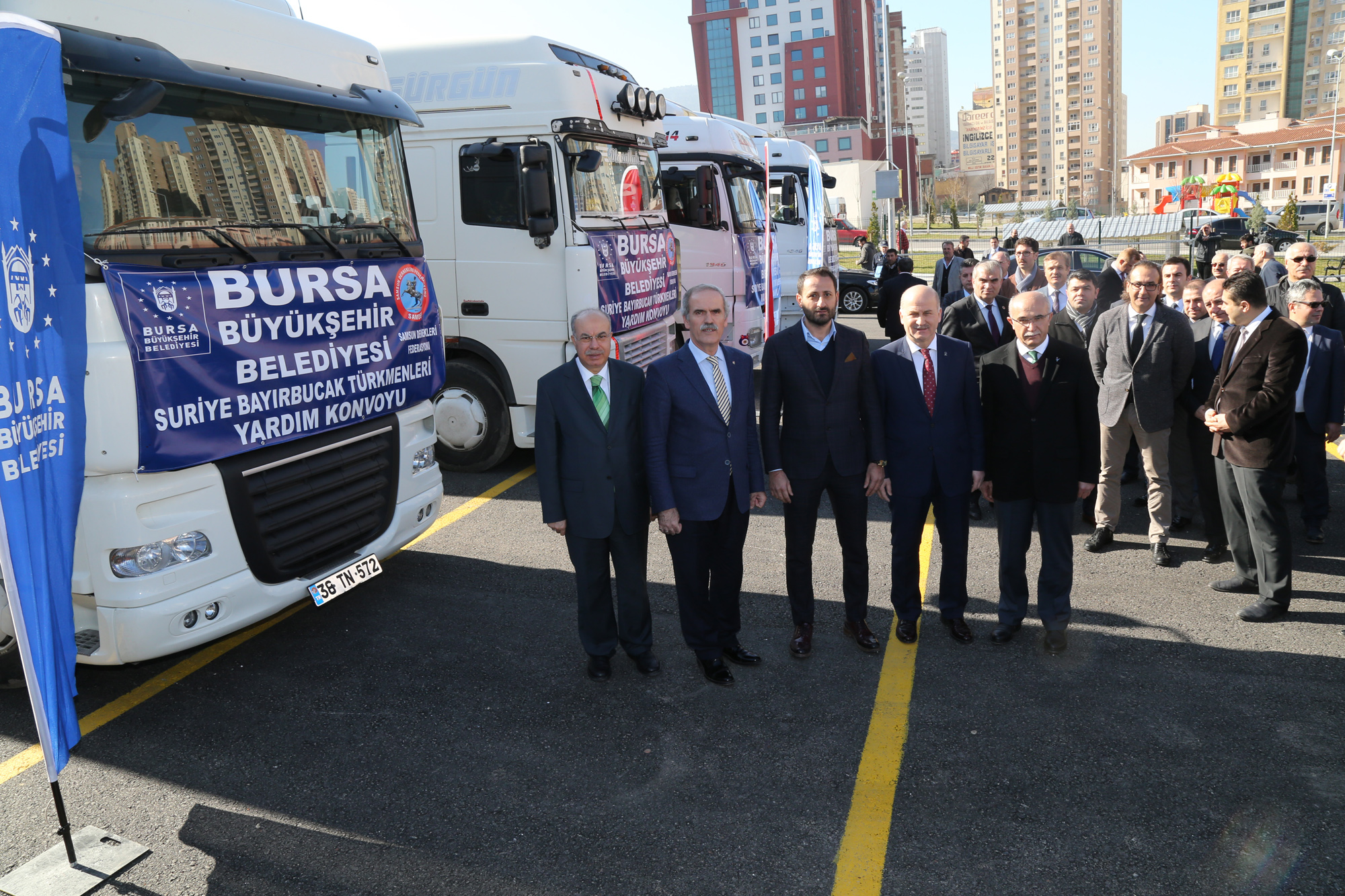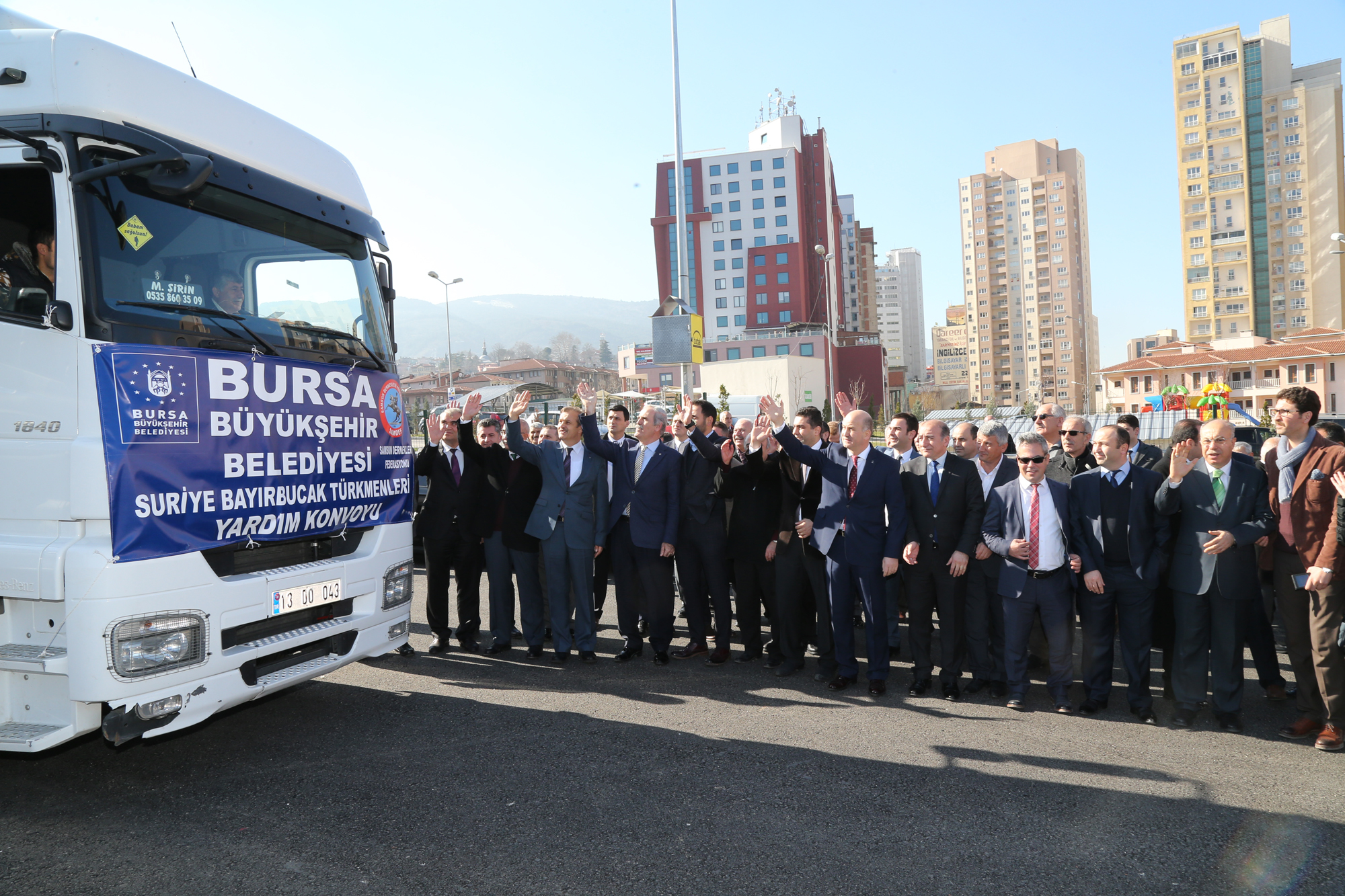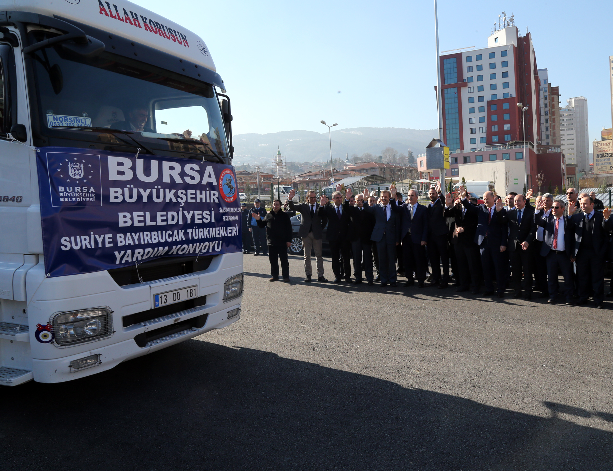 Suriyeli mazlumlara destek olmak amacıyla savaşın ilk günlerinden itibaren Bursa’da başlatılan yardım seferberliği, Büyükşehir Belediyesi’nin de destekleriyle çığ gibi büyüyor. Büyükşehir Belediyesi, işadamları, sivil toplum örgütleri ve vatandaşlardan sağlanan yardımlarla doldurulan 200’ü aşkın TIR, bölge halkının yaralarını sararken, daha önce bölgeye 3 Tır gıda malzemesi gönderen Bursa Samsunlular Federasyonu, Bayırbucak’a ulaştırılmak üzere 5 Tır malzemeyi daha yola çıkardı. Yardım tırları Büyükşehir Belediyesi’nin Doğanbey Otoparkı’nda düzenlenen törenle bölgeye uğurlanırken, Büyükşehir Belediye Başkanı Recep Altepe, bölgeye huzur gelinceye kadar yardımların devam edeceğini söyledi.