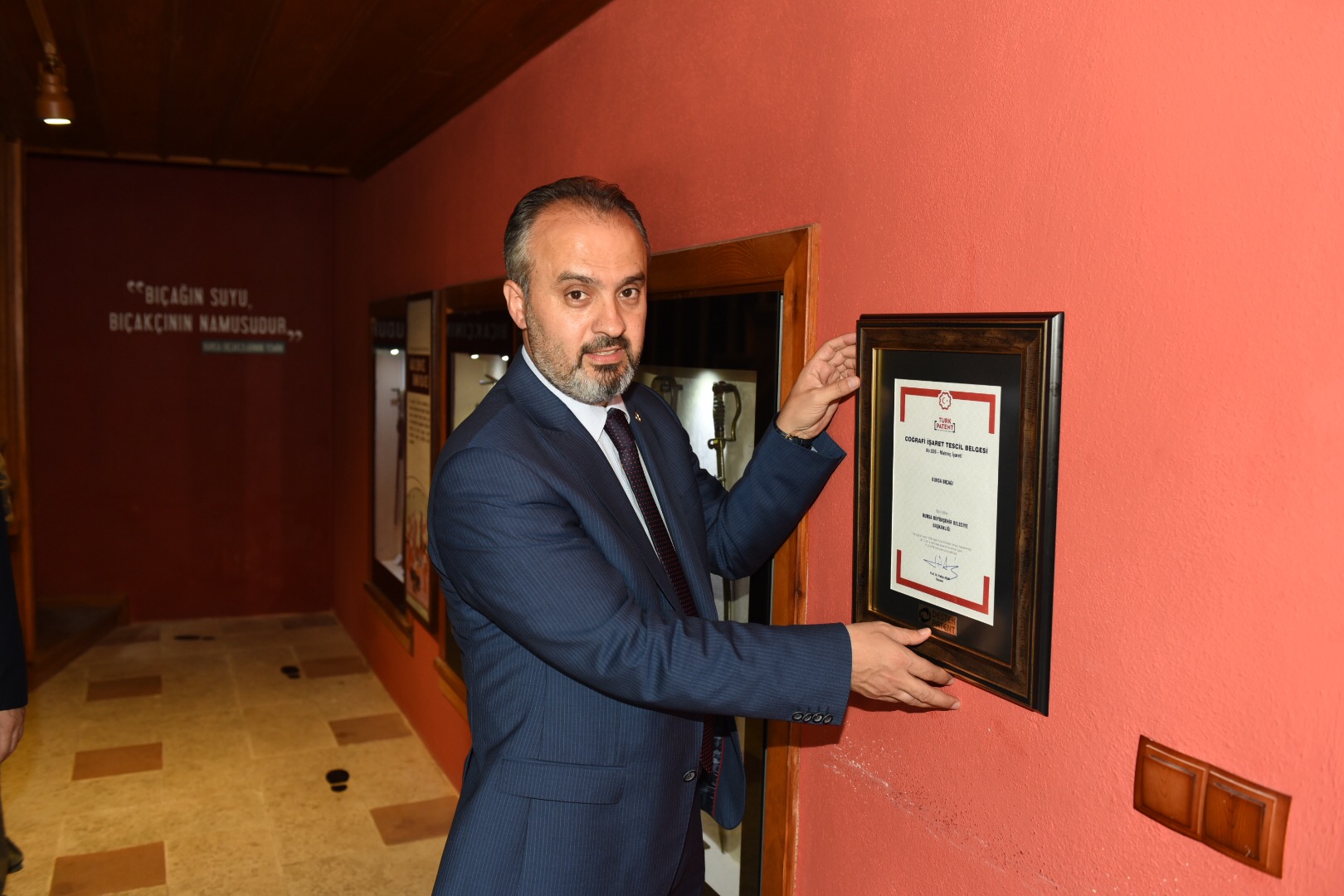 Başkan Aktaş, incelemenin ardından Bursa Bıçağı’nın tescil belgesini müze girişine astı.