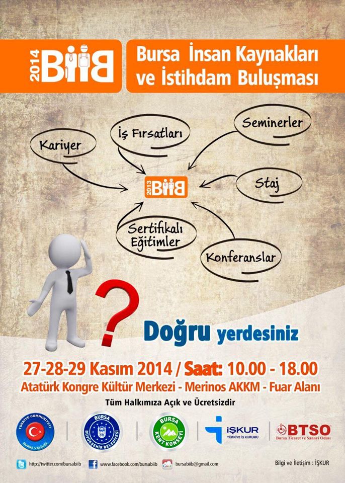 BURSA – Bursa Valiliği, Bursa Büyükşehir Belediyesi (BBB), Bursa Kent Konseyi (BKK), Türkiye İş Kurumu (İŞKUR) ve Bursa Ticaret ve Sanayi Odası’nın (BTSO) ortaklığıyla organize edilen ‘Bursa İnsan Kaynakları ve İstihdam Buluşması (BİİB), bu yıl 27-28-29 Kasım 2014 tarihlerinde işverenler ile iş arayanları 3. kez bir araya getirecek.