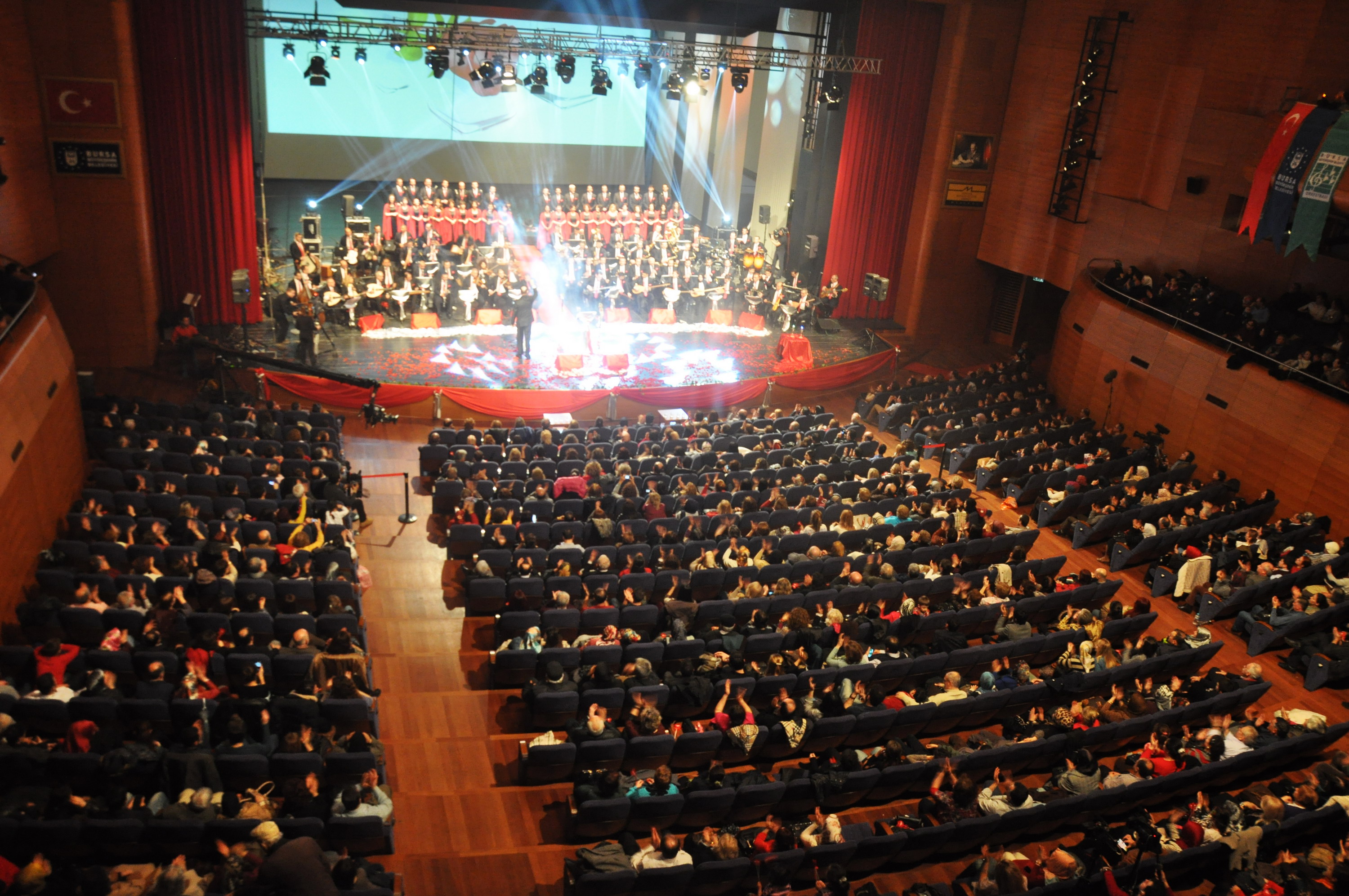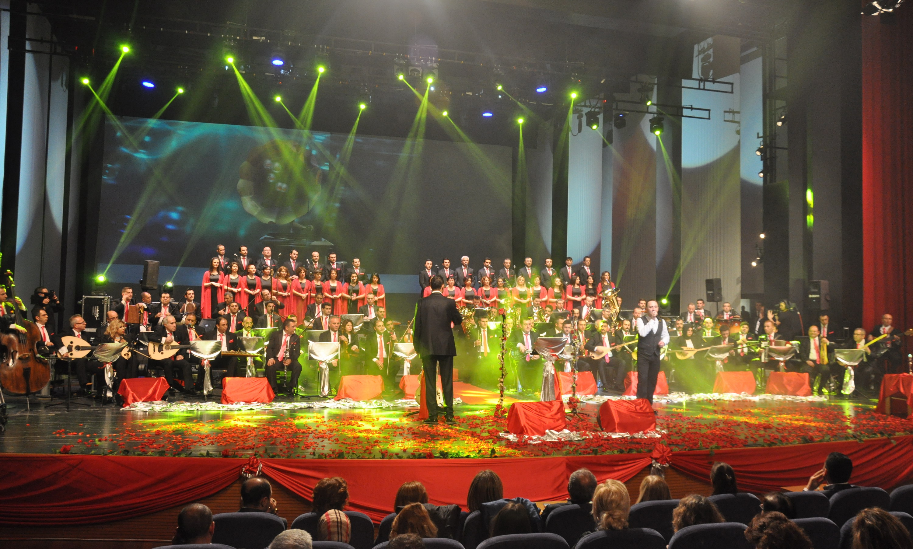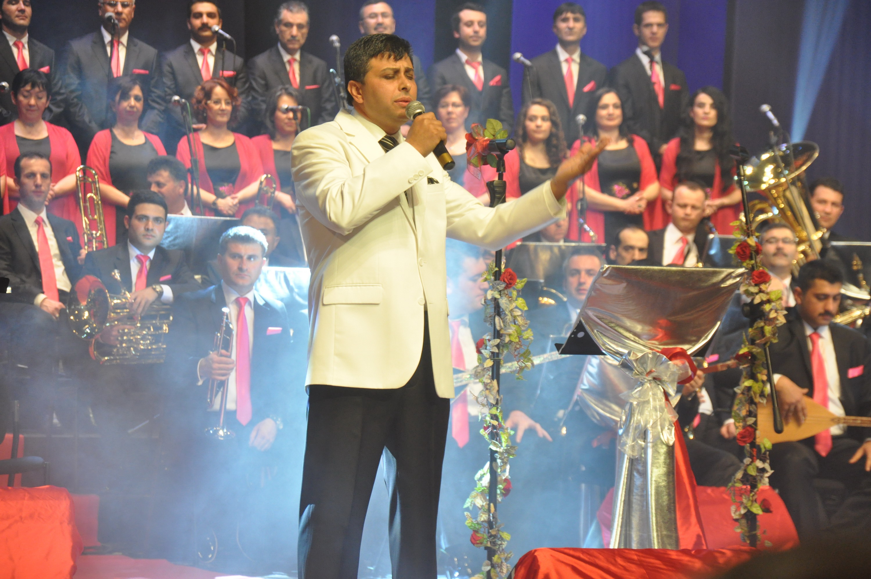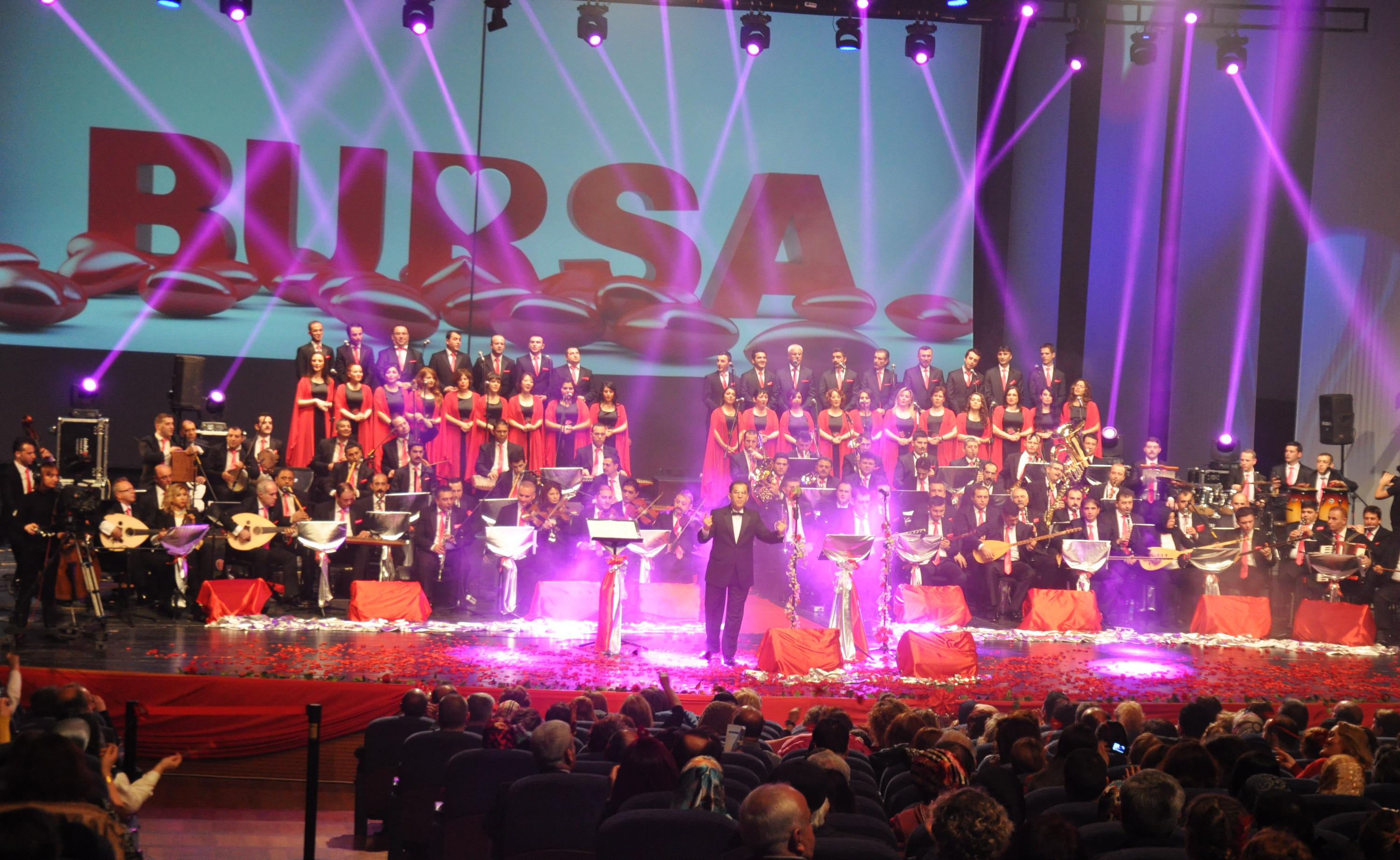 Bursa Büyükşehir Belediyesi Orkestra Şube Müdürlüğü’nün Türk Sanat Müziği, Türk Halk Müziği, Bando bölümleri ile Çalgıcı Mektebi Roman Orkestrası’ndan oluşan 130 kişilik dev kadro, 14 Şubat Sevgililer Günü dolayısıyla Atatürk Kongre Kültür Merkezi (Merinos AKKM) Osmangazi Salonu’nda özel bir konser verdi. Sanatçıların, aşkın rengi kabul edilen kırmızı ton ağırlıklı sahne aldığı geceye, Bursalılar ilgi gösterdi. TRT’den canlı yayınlanan ve eserlerin solo ve koro olarak seslendirildiği konserde, ağırlıklı olarak romantik parçalar okundu. Gecede dinleyicileri kimi zaman hüzünlendiren sanatçılar, kimi zaman da eğlenceli şarkılarla coşturdu. ‘Aşkın kanunu yazsam yeniden’ şarkısıyla konseri bitiren 130 kişilik dev kadro, sanatseverlerden büyük alkış aldı.