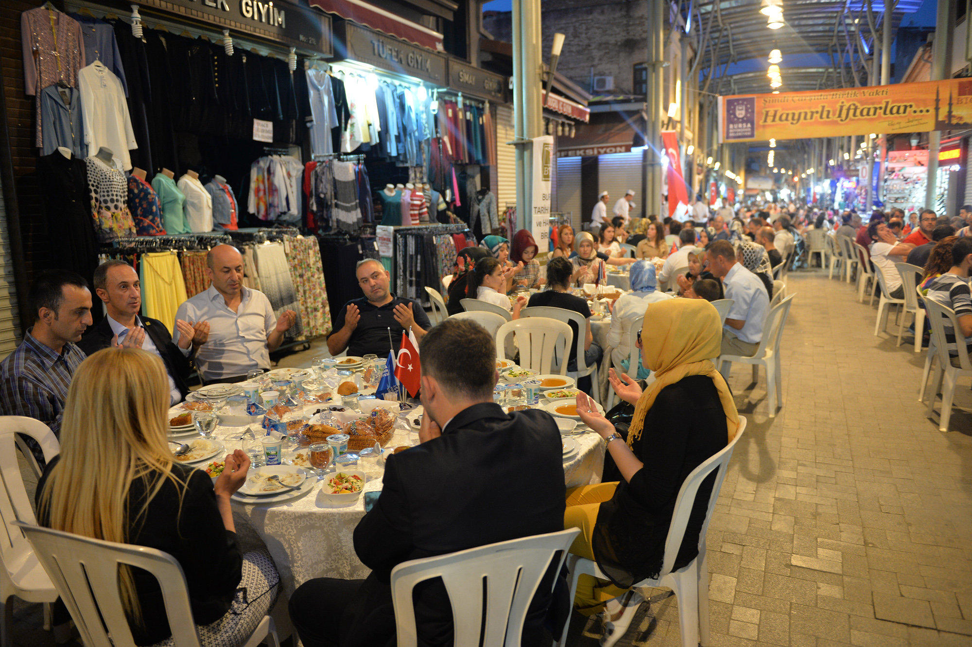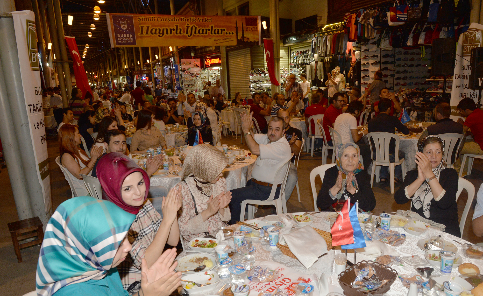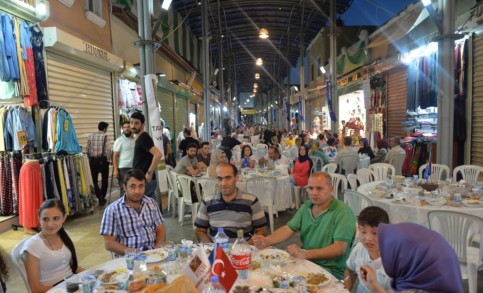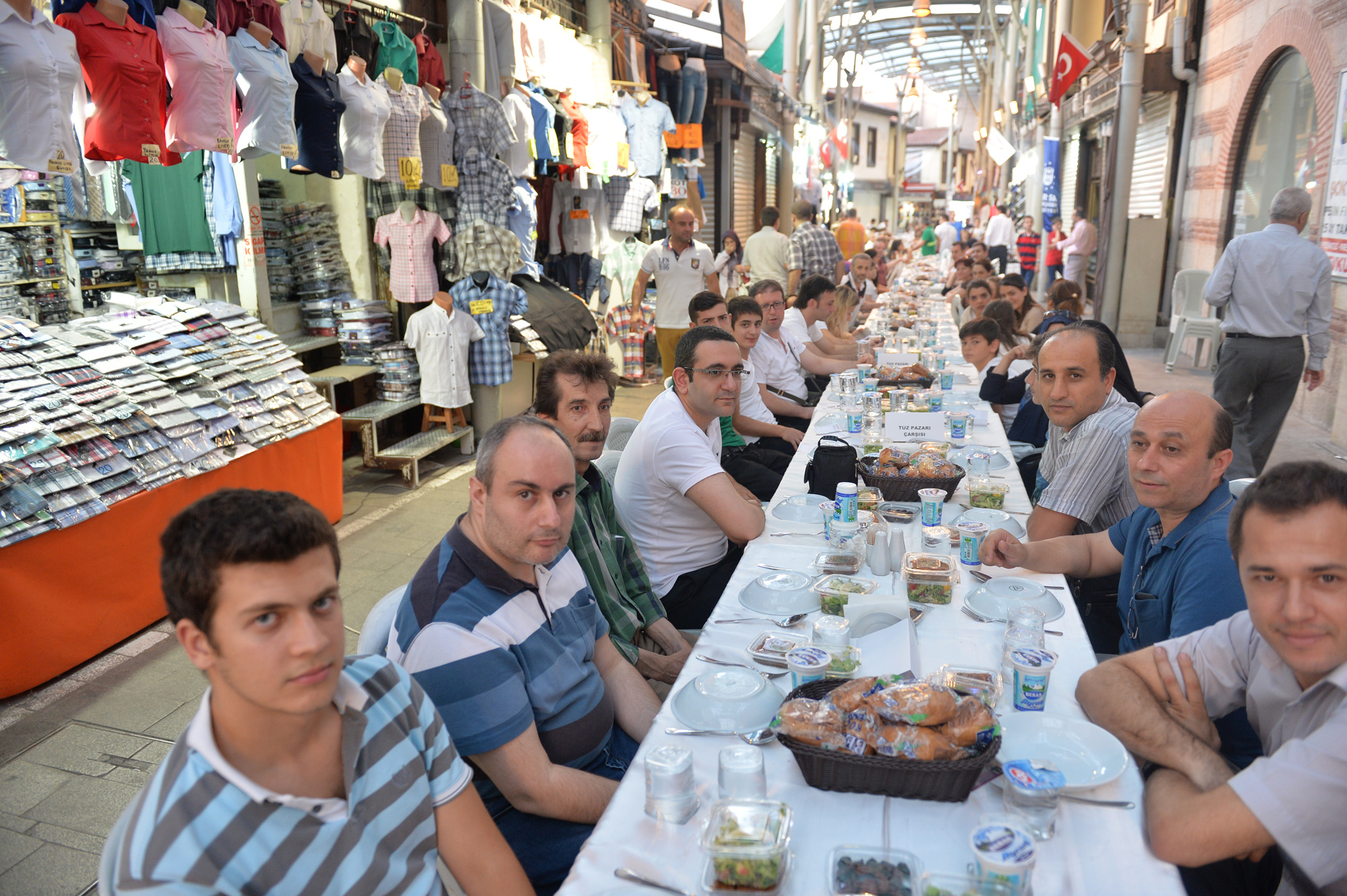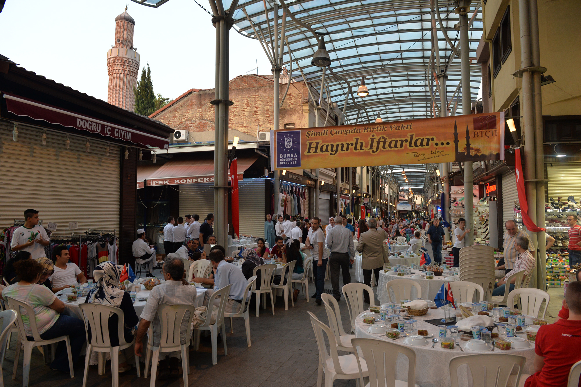 - Büyükşehir Belediyesi ve Bursa Tarihi Çarşı ve Hanlar Bölgesi Birliği tarafından Bursa Çarsısı’nda; Okçular, Uzun Çarşı, Tuz Pazarı, Kapalı Çarşı ve Bakırcılar Çarşısı’nın bulunduğu 750 metrelik hat boyunca düzenlenen iftara, 40 çarşının esnafı ve vatandaşlar olmak üzere yaklaşık 6 bin kişi katıldı.