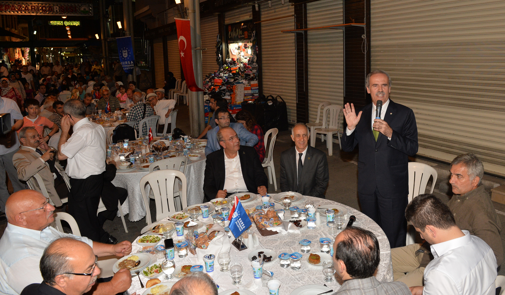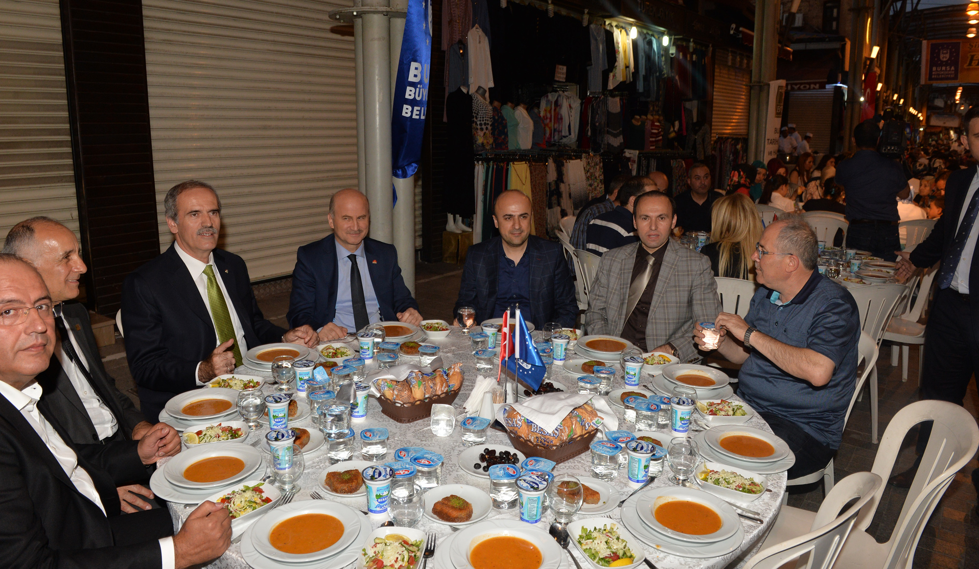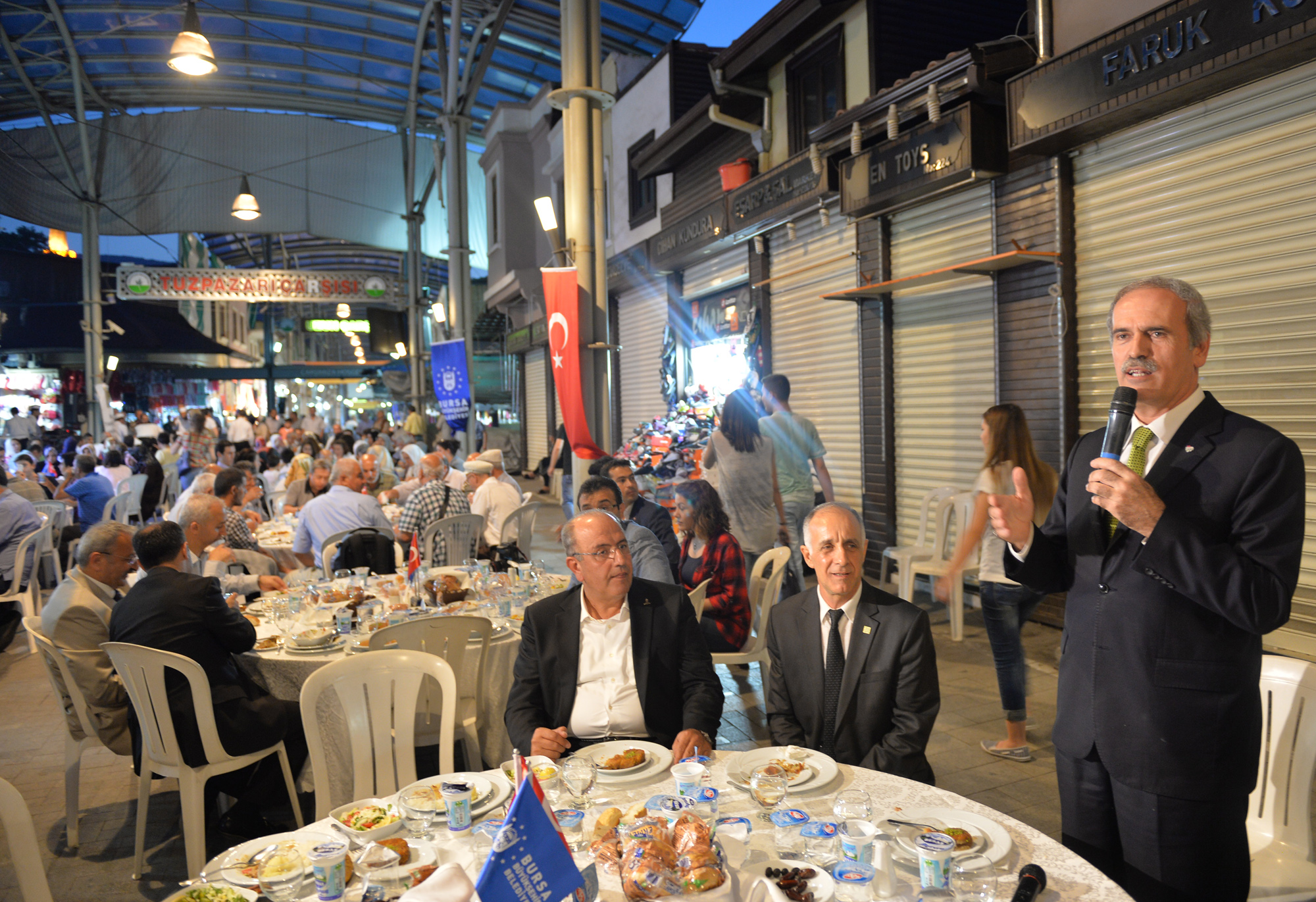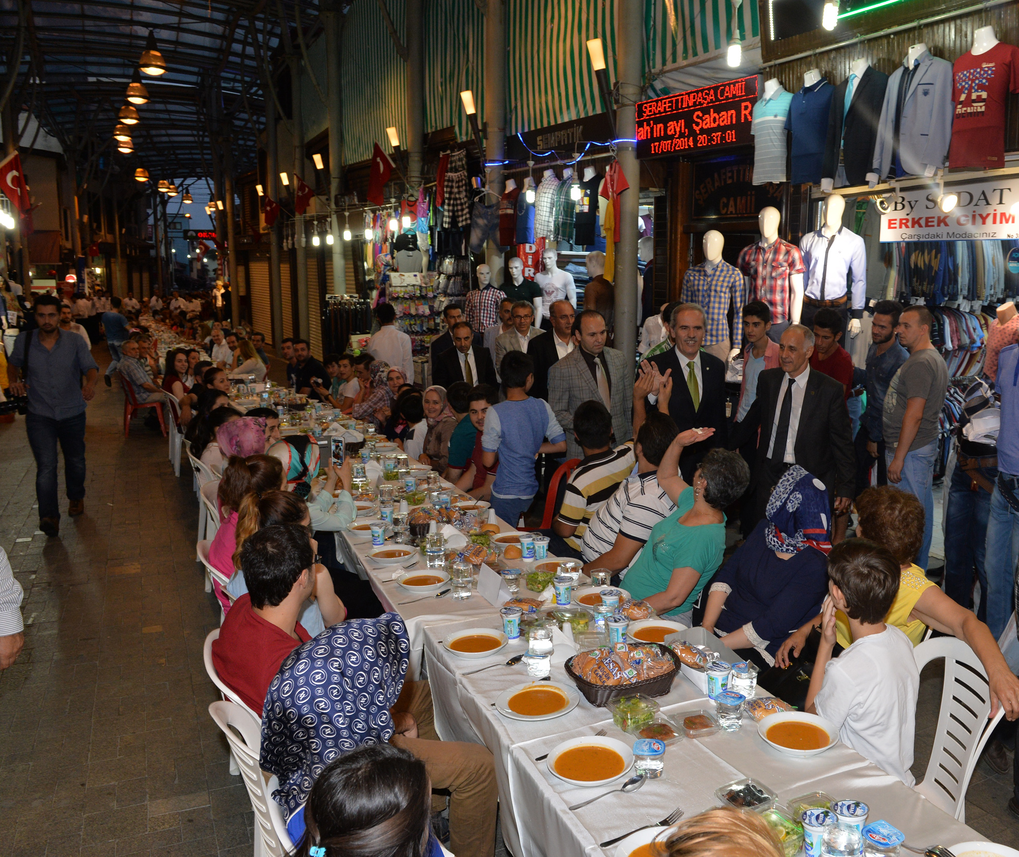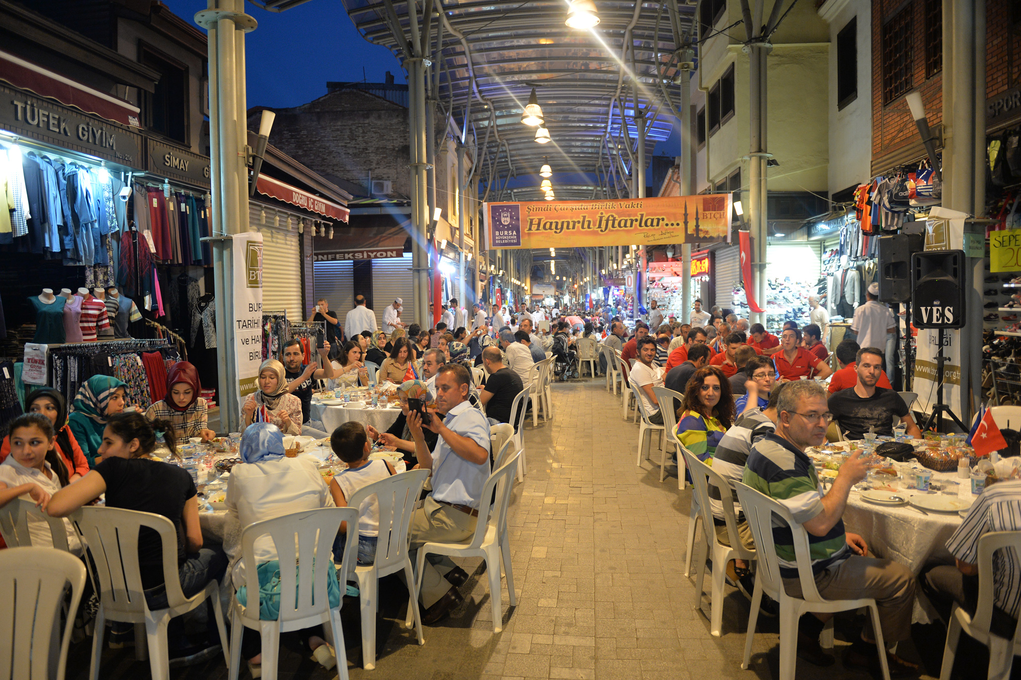 - Büyükşehir Belediyesi ve Bursa Tarihi Çarşı ve Hanlar Bölgesi Birliği tarafından Bursa Çarsısı’nda; Okçular, Uzun Çarşı, Tuz Pazarı, Kapalı Çarşı ve Bakırcılar Çarşısı’nın bulunduğu 750 metrelik hat boyunca düzenlenen iftara, 40 çarşının esnafı ve vatandaşlar olmak üzere yaklaşık 6 bin kişi katıldı.
