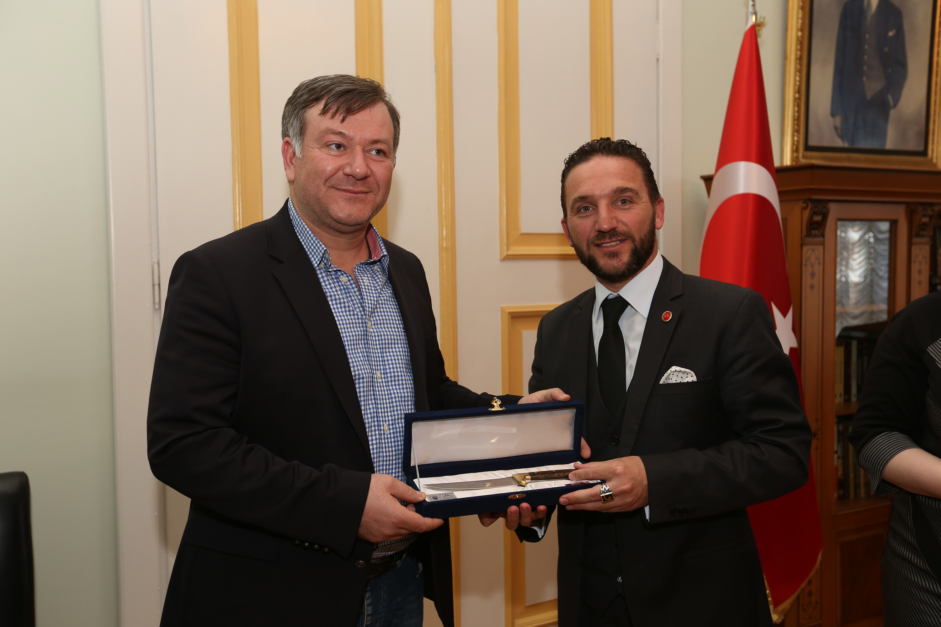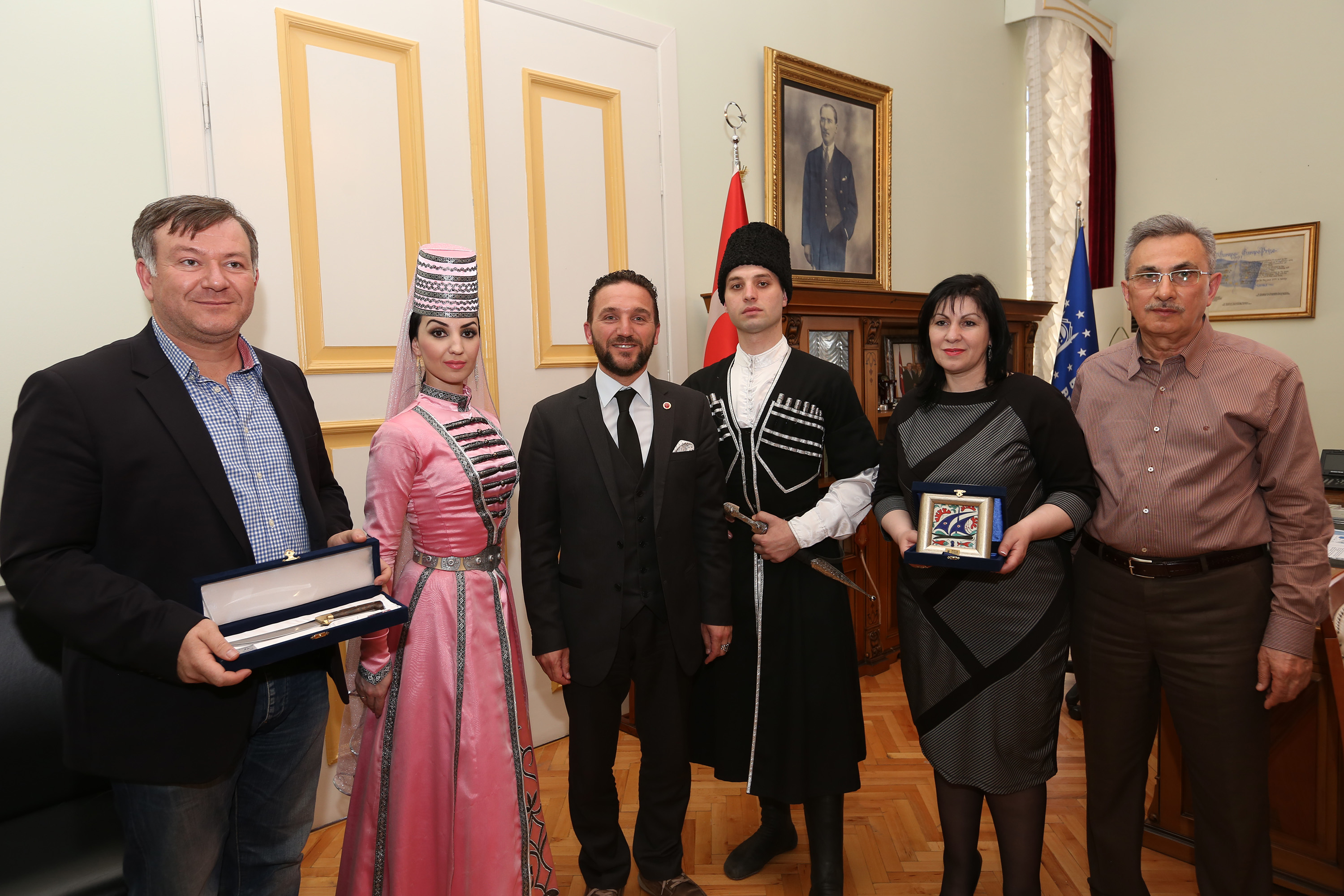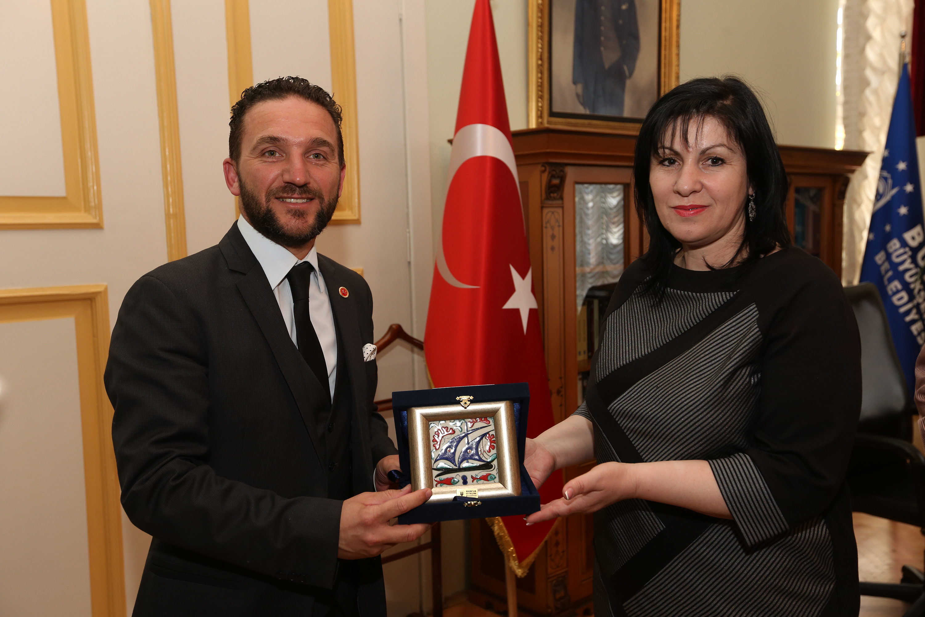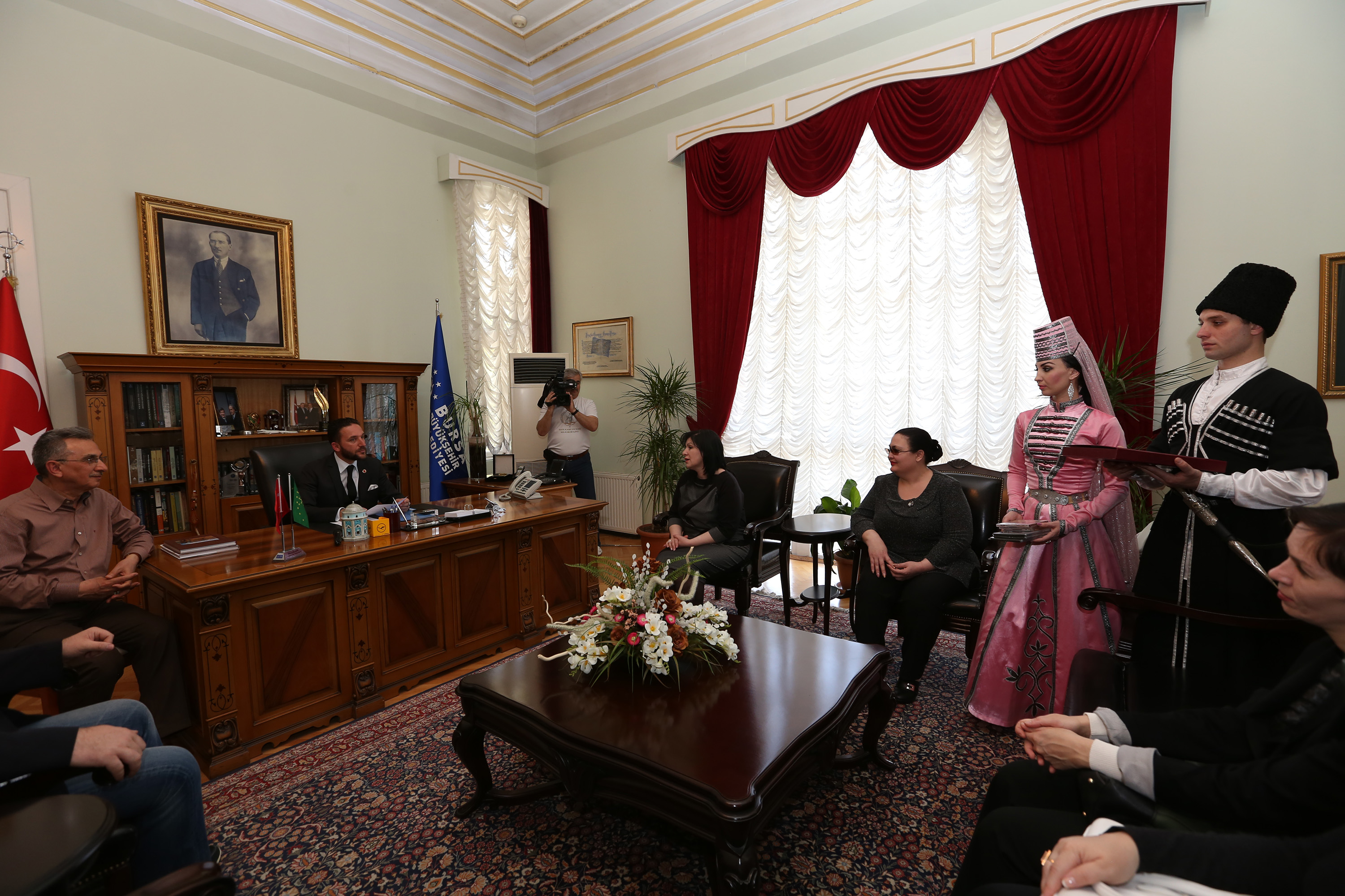 Bursa Çerkes Kültür Derneği Başkanı Levent Turgut ve Adıgey Cumhuriyeti Müzik ve Halk Dansları Topluluğu İslamey, Büyükşehir Belediyesi Başkanvekii Atilla Ödünç ile bir araya geldi. Heykel’deki Tarihi Belediye Binası’nda gerçekleştirilen ziyarette, Bursa ile kültürel bağları güçlendirmek istediklerini anlatan konuklar, tüm vatandaşları, Bursa Çerkes Kültür Derneği’nin 50. yıl kutlamaları nedeniyle 18 Nisan Cumartesi günü (YARIN) saat 20.00’da Atatürk Kongre ve Kültür Merkezi’nde (Merinos AKKM) verecekleri konsere davet ettiler. Büyükşehir Belediyesi Başkanvekii Atilla Ödünç de konuklarına kenti tanıttığı görüşmede, Bursa’da kültüre ve sanata değer verildiğini anlattı. Başkanvekili Ödünç, ziyaretin ardından konuklarına el yapımı Bursa bıçağı ve çini plaket hediye ederken; Adıgey Cumhuriyeti Müzik ve Halk Dansları Topluluğu İslamey de kültürlerine özgü ağıt seslendirdi.
