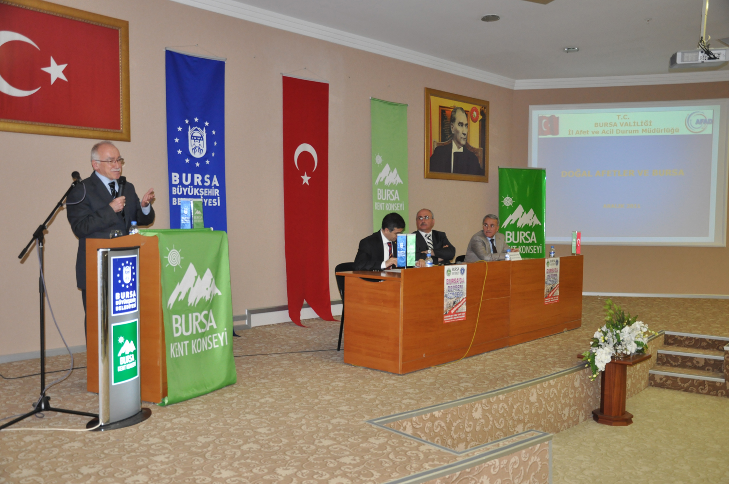 Bursa Valiliği İl Afet ve Acil Durum Müdürü İbrahim Tarı ‘Doğal afetler ve Bursa’ adlı sunum yaptı. Bursa’nın İstanbul’dan daha tehlikeli bir deprem tehlikesi altında olduğunu kaydeden Tarı, yaptıkları çalışmaları anlattı. Mahalle Afet Gönüllüleri projesini Bursa’da başlattıklarını ancak gönüllü bulmakta sıkıntı çektiklerini ifade eden Tarı, halkın bu projeye destek olmasını istedi.