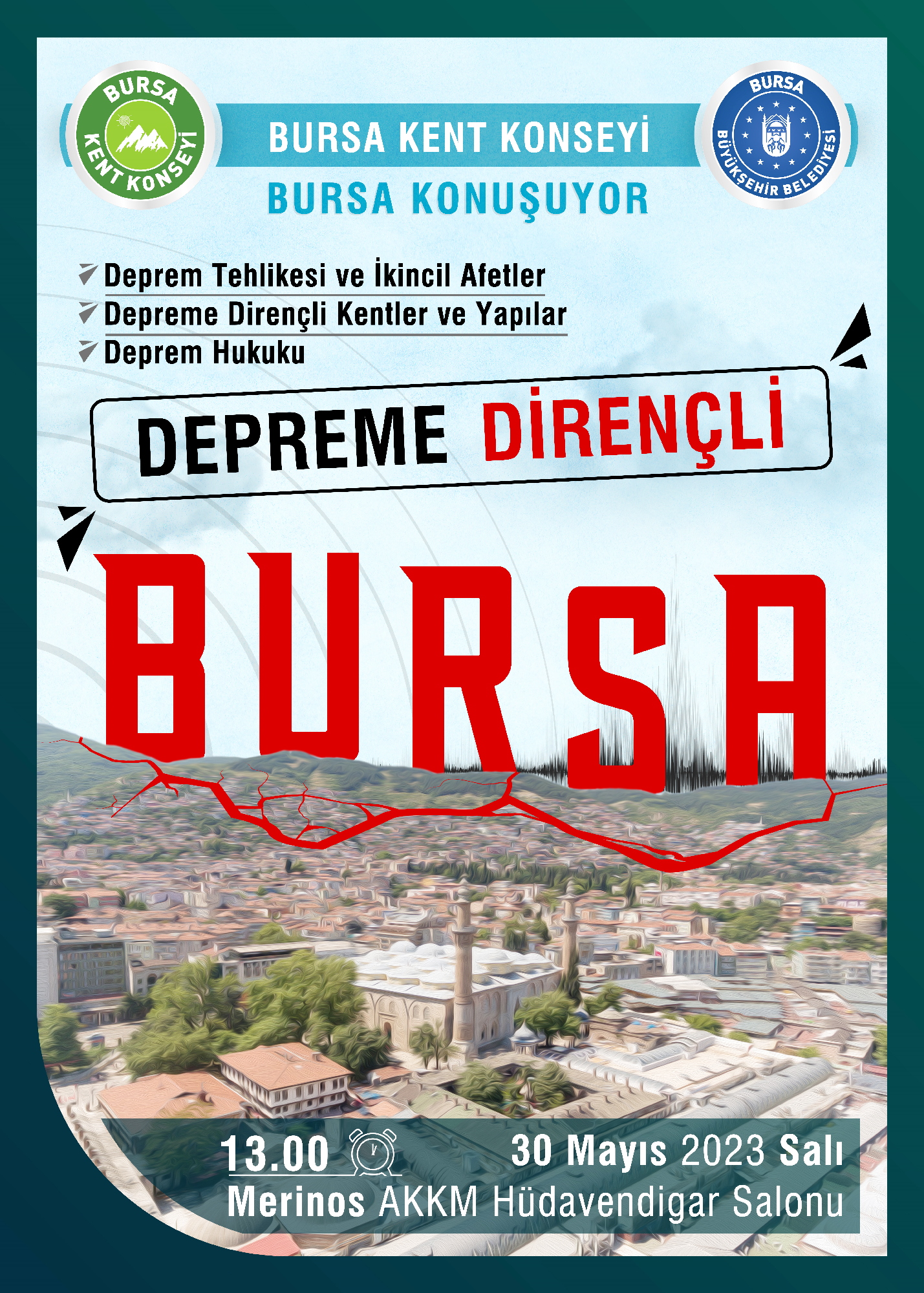 Bursa Büyükşehir Belediyesi’nin katkılarıyla Bursa Kent Konseyi tarafından ‘Depreme Dirençli Bursa’ paneli düzenleniyor. Deprem tehlikesi ve ikincil afetler, depreme dirençli kentler ve yapılar ile deprem hukukunun ele alınacağı ‘Depreme Dirençli Bursa’ paneli alanında uzman isimlerin katılımıyla 30 Mayıs Salı günü Saat 13:00’da Atatürk Kongre Kültür Merkezi Hüdavendigar Salonu’nda yapılacak.