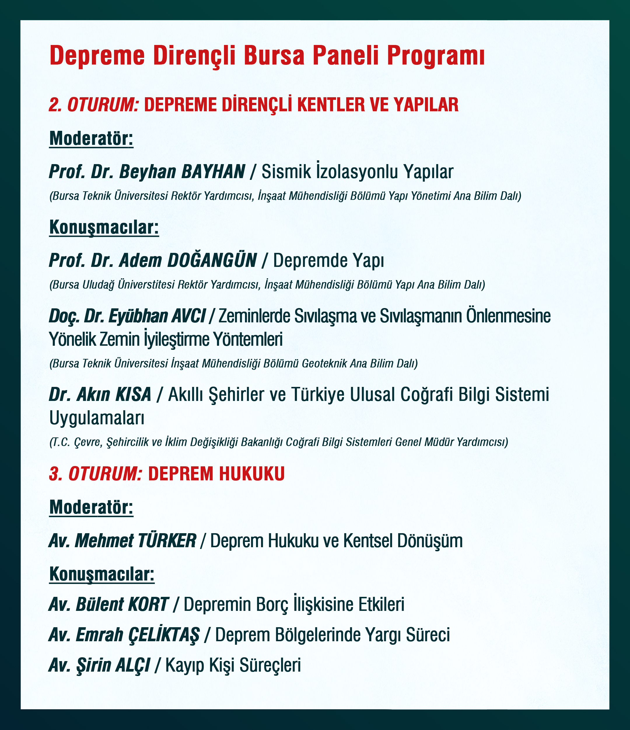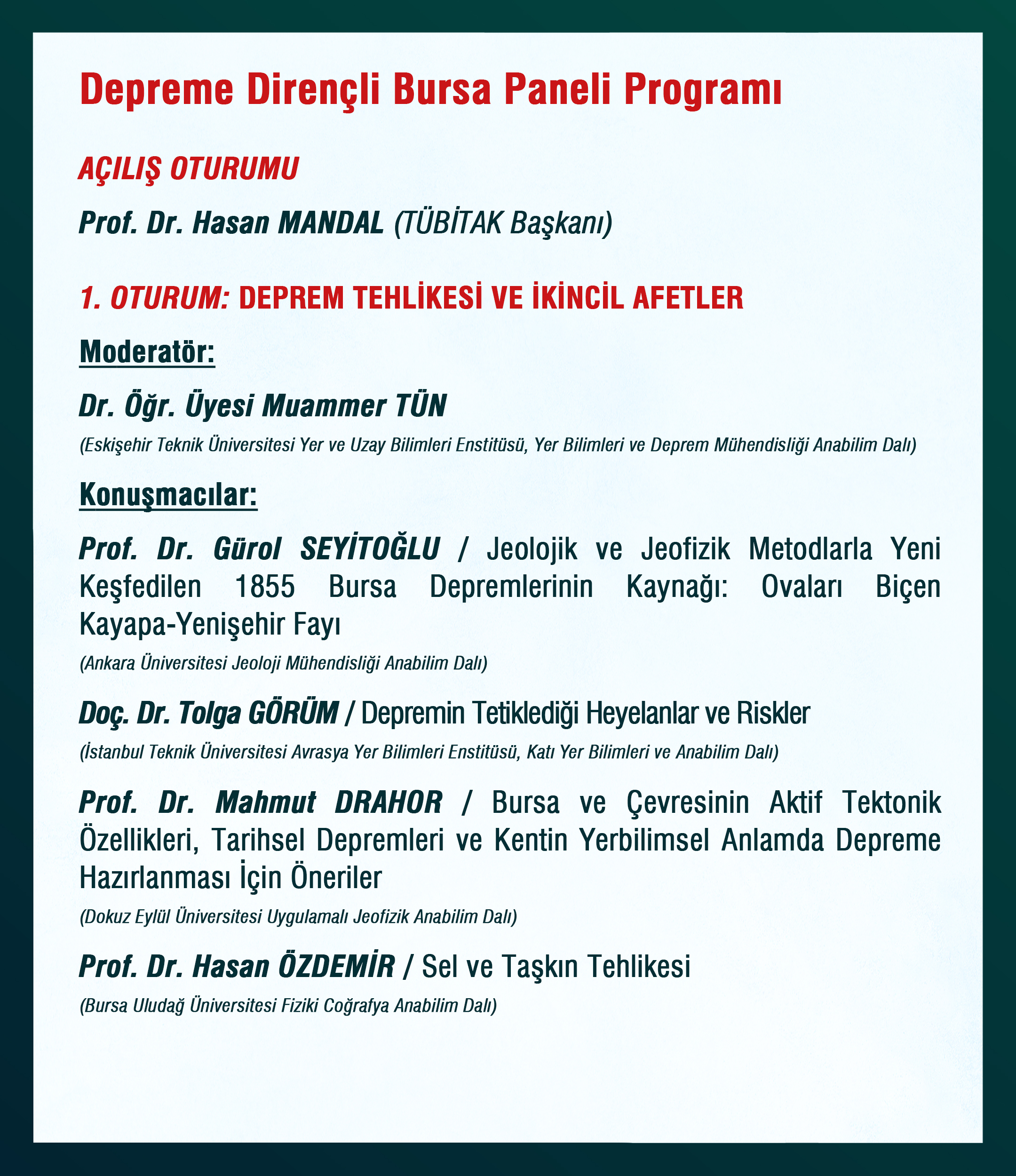 TÜBİTAK Başkanı Hasan Mandal’ın da konuşmacı olarak yer aldığı ‘Depreme Dirençli Bursa’ panelinin programı şu şekilde;