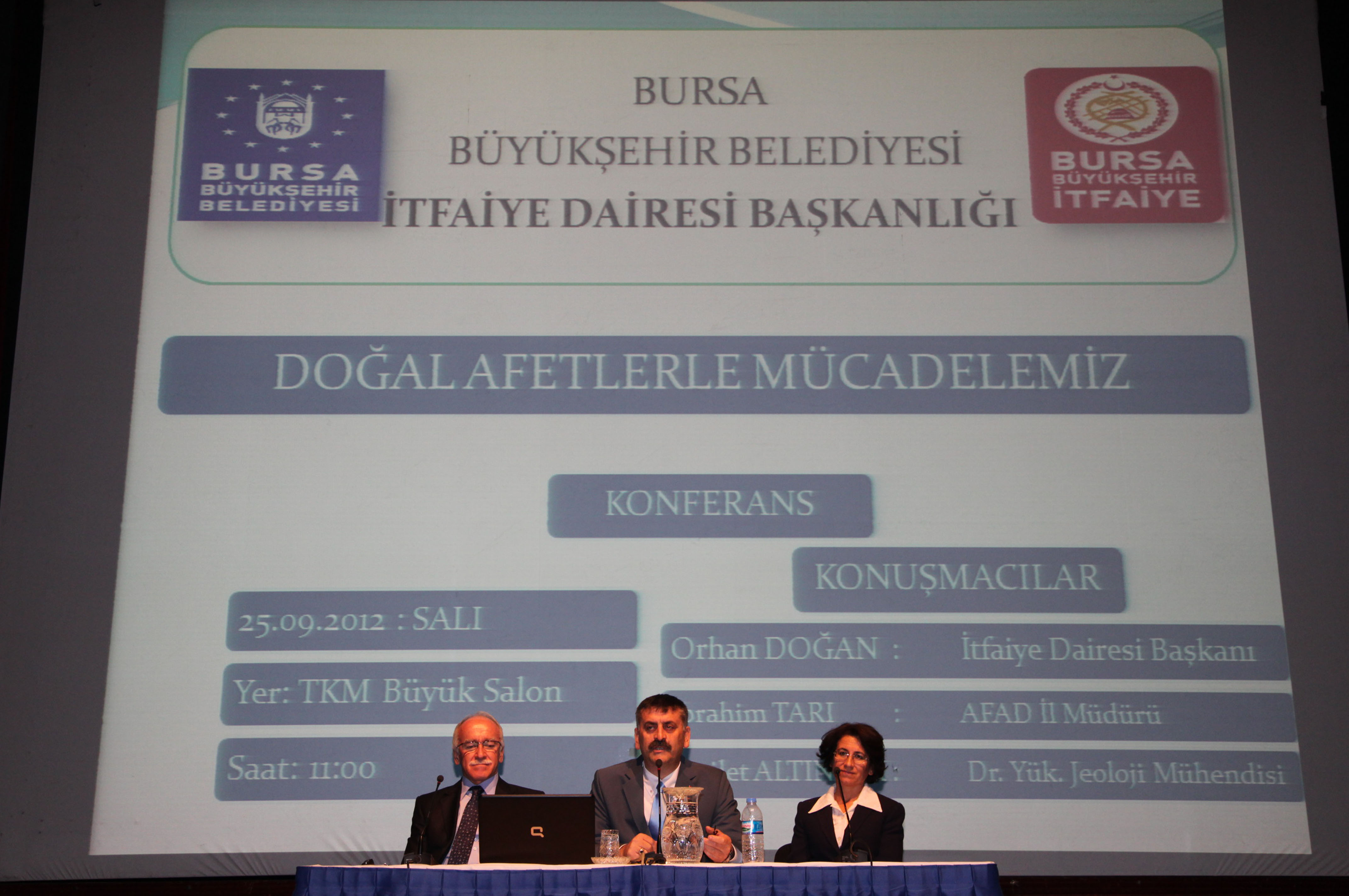 AKOM´un Büyükşehir Belediyesi´nin desteğinde ´İtfaiye Haftası´ nedeniyle düzenlediği ´Doğal Afetlerle Mücadelemiz´ konulu konferans, Tayyare Kültür Merkezi´nde gerçekleştirildi. AKOM Başkan Yardımcısı Orhan Doğan´ın başkanlık ettiği ve İl Afet-Acil Durum Müdürü İbrahim Tarı ile Jeoloji Yüksek Mühendisi Dr. Fazilet Altınışık´ın konuşmacı olarak katıldığı toplantıya; Büyükşehir Belediyesi Başkanvekili Muhsin Özlükurt, eski Milletvekili Faruk Ambarcıoğlu, Yeşil Bursam Derneği Başkanı Muharrem Karabulut, Büyükşehir Belediyesi´nin ilgili birimleri ile sivil toplum kuruluşlarının temsilcileri ve lise öğrencileri katıldı.