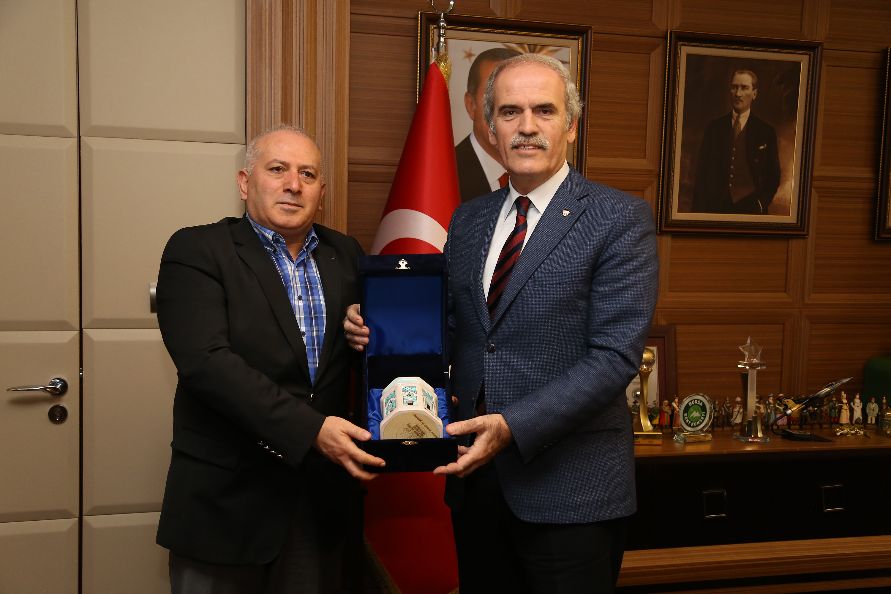 Başkan Altepe, ziyaretin anısına TMMOB İMO Bursa Şube Başkanı Mehmet Albayrak’a porselenden Yeşil Türbe maketi hediye etti.