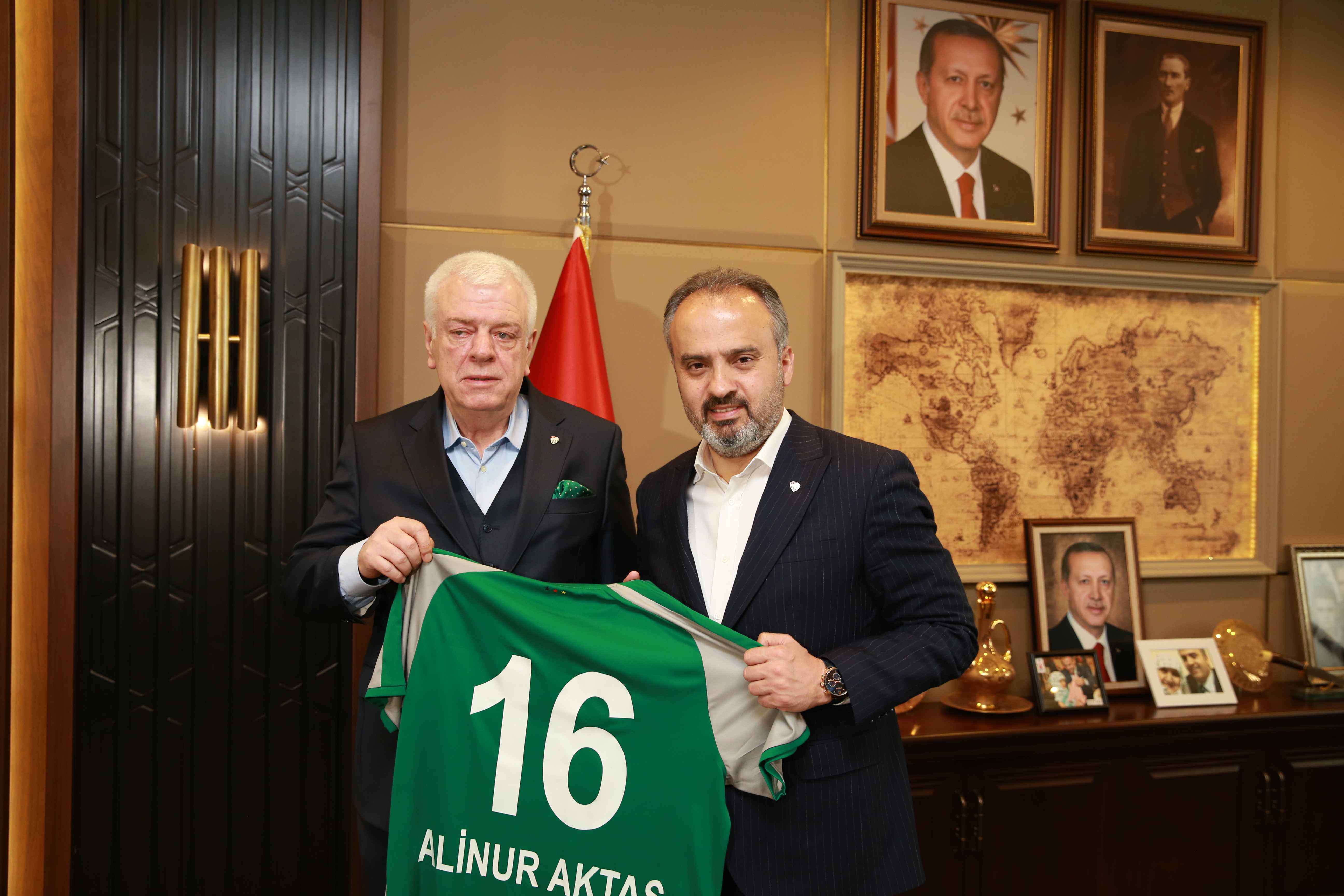 Başkan Aktaş’ı tebrik eden Bursaspor Başkanı Ali Ay ise hem Başkan Aktaş’ın hem de geçmiş dönem Belediye Başkanı Recep Altepe’nin Bursaspor’a büyük destekleri olduğunu söyleyerek, “Aldığımız destek şu ana kadar 50 milyonu geçmiştir. Bunu kamuoyunun da bilmesini istiyorum. Bizim için çok önemli bir destek. İnşallah bundan sonra bu artarak devam edecek ve Bursaspor’u da bu mali konularda daha iyi yerlere getirmek için beraberce uğraş vereceğiz. Bunu kendisinden rica ediyorum. Aktaş’ın ne kadar iyi bir Bursasporlu olduğunuz zaten hepimiz biliyoruz” diyerek Başkan Aktaş’a teşekkür etti. Ziyarette ayrıca, Ay, Aktaş’a adının yazılı olduğu Bursaspor formasını da hediye etti.