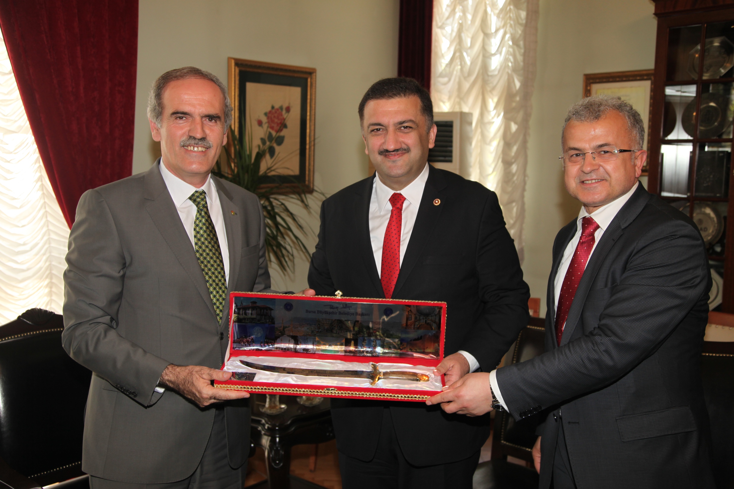 Bursa’da ikinci kez Büyükşehir Belediye Başkanlığı görevine başlayan Büyükşehir Belediye Başkanı Recep Altepe, AK Parti Rize Milletvekili Hasan Karal ve Rize Belediye Başkanı Reşat Kasap ile Tarihi Belediye Binası’nda bir araya geldi.