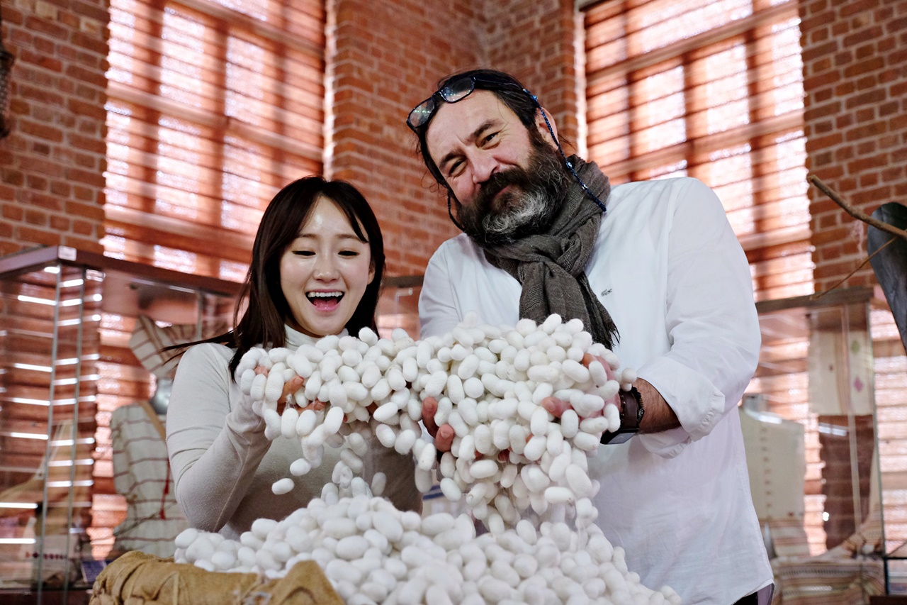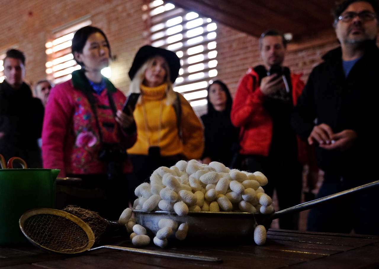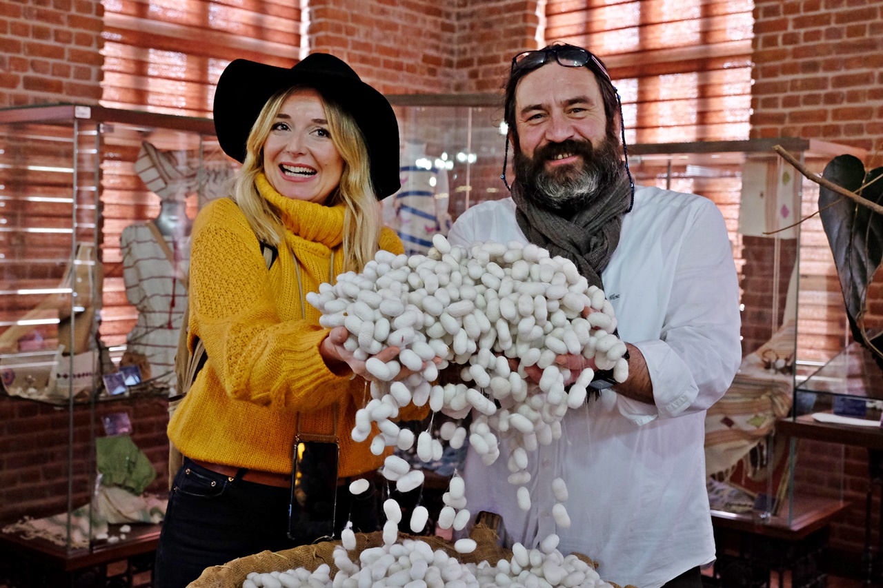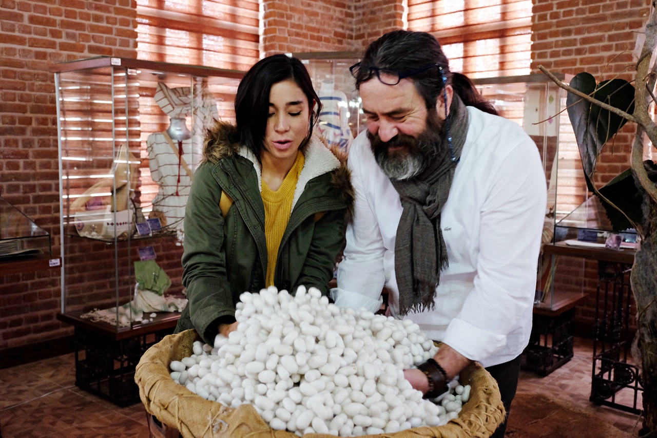 Umurbey İpek ve Tasarım Merkezi Üretim Sorumlusu Mehmet Ünal, ziyaretçilere ipek böceğinin yumurtalardan başlayarak ördüğü kozanın içerisinde bir kelebeğe dönüşünceye kadar geçirdiği aşamaları, kozadan ipeğin nasıl alındığı ve iplik haline gelerek dokuma tezgâhlarında işlendiğini uygulamalı olarak anlatıldı. İpeğin öyküsünü dikkatle dinleyen fenomenleri, her aşamayı görüntüleyip, takipçileri ile paylaştı.