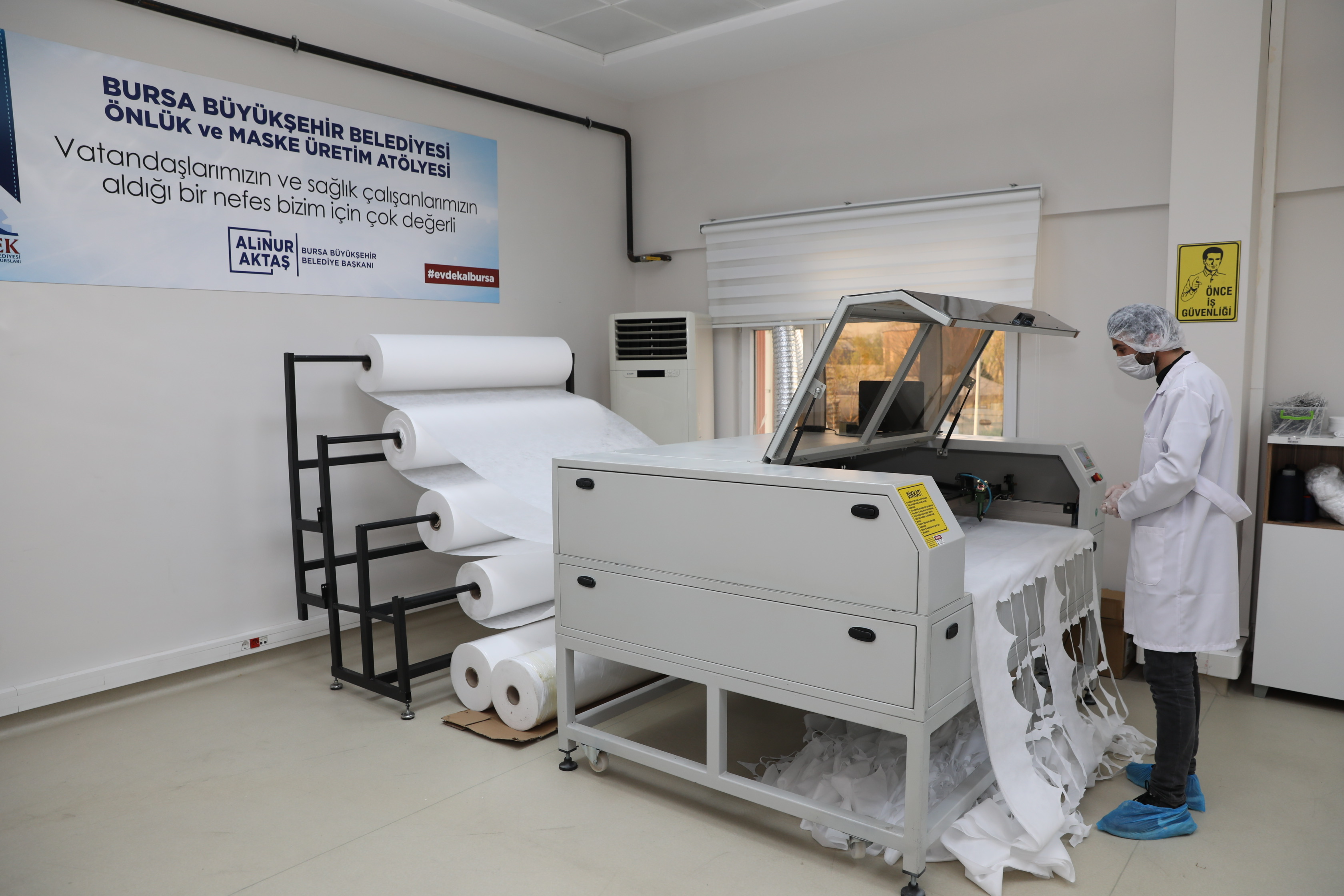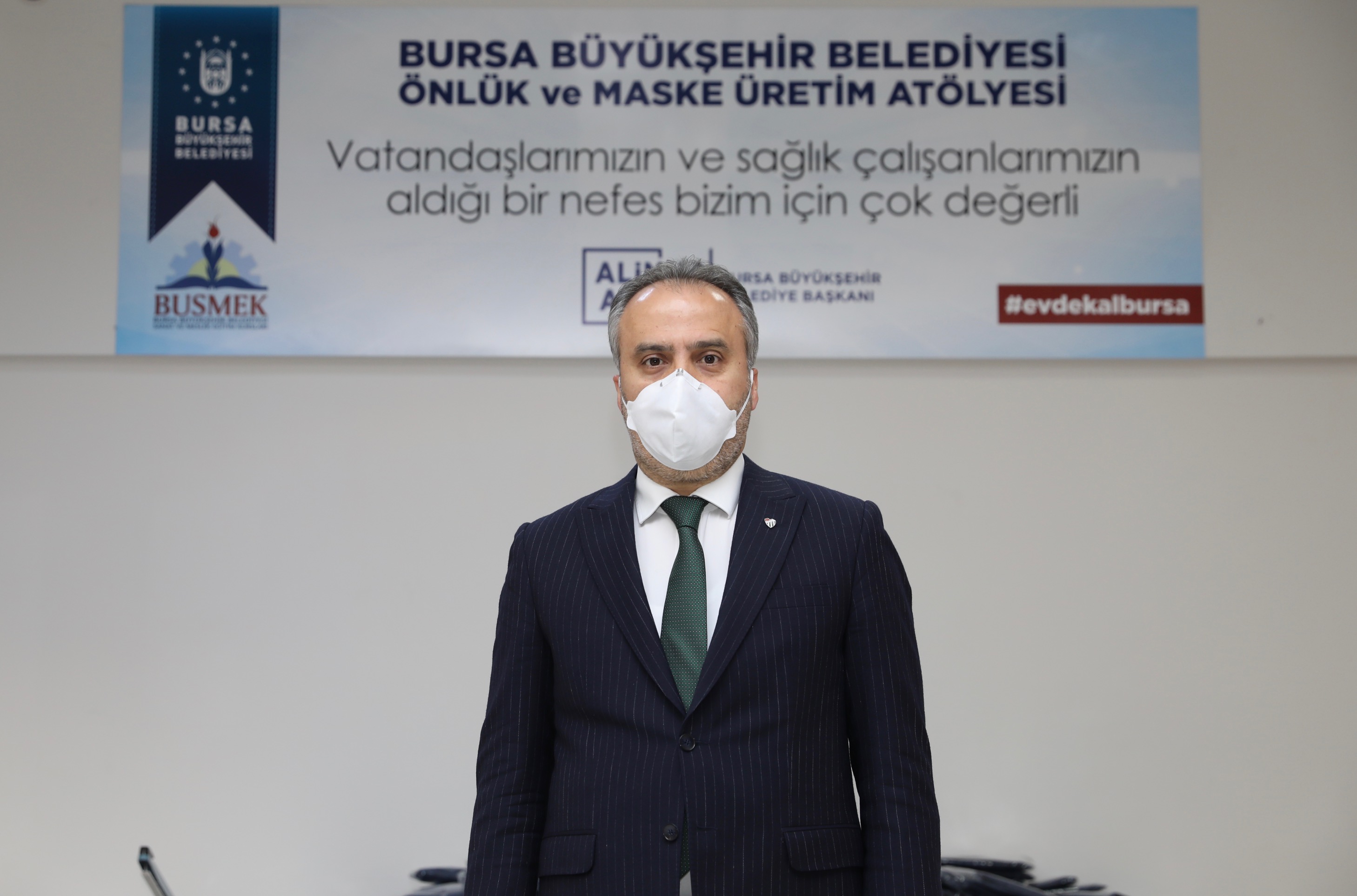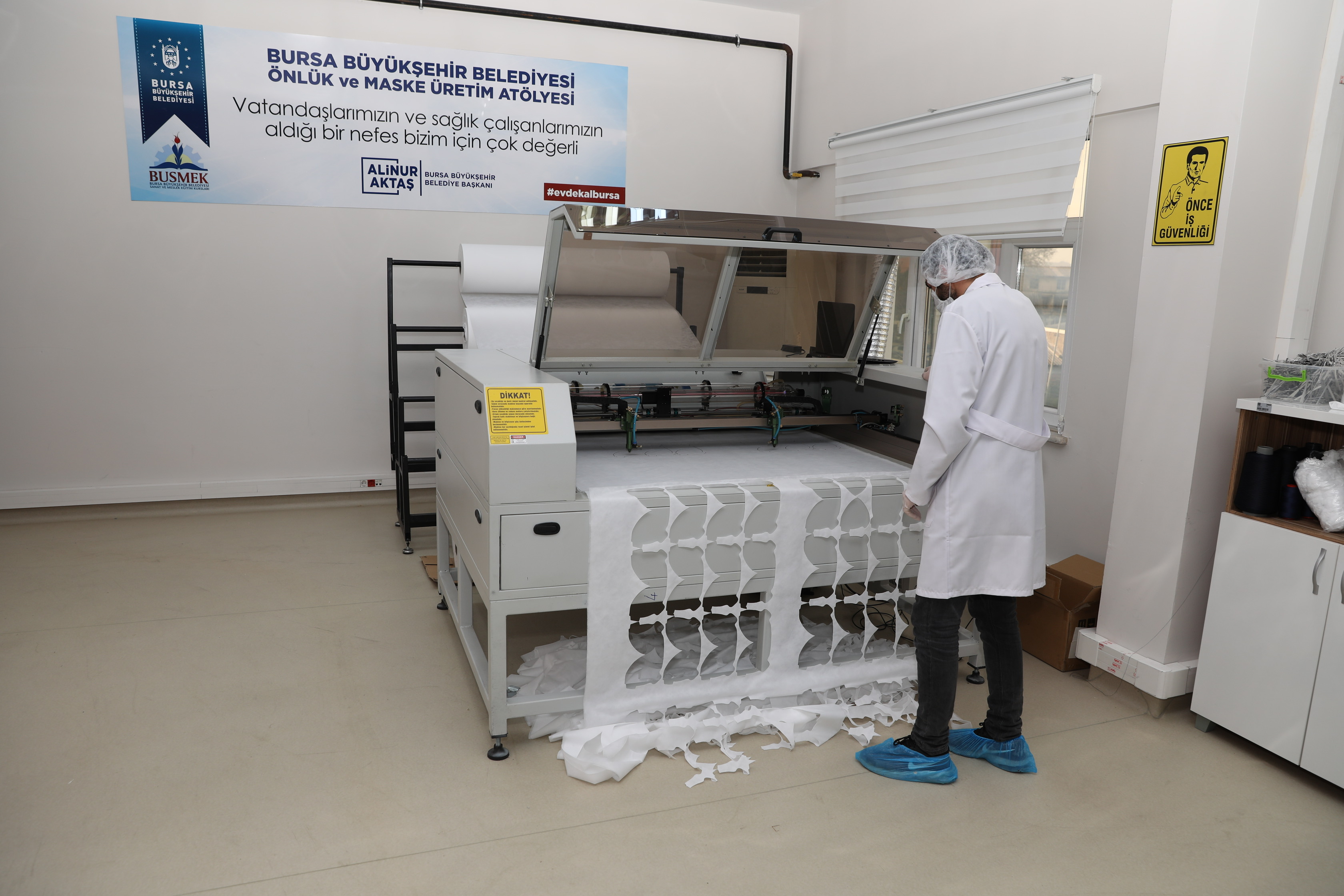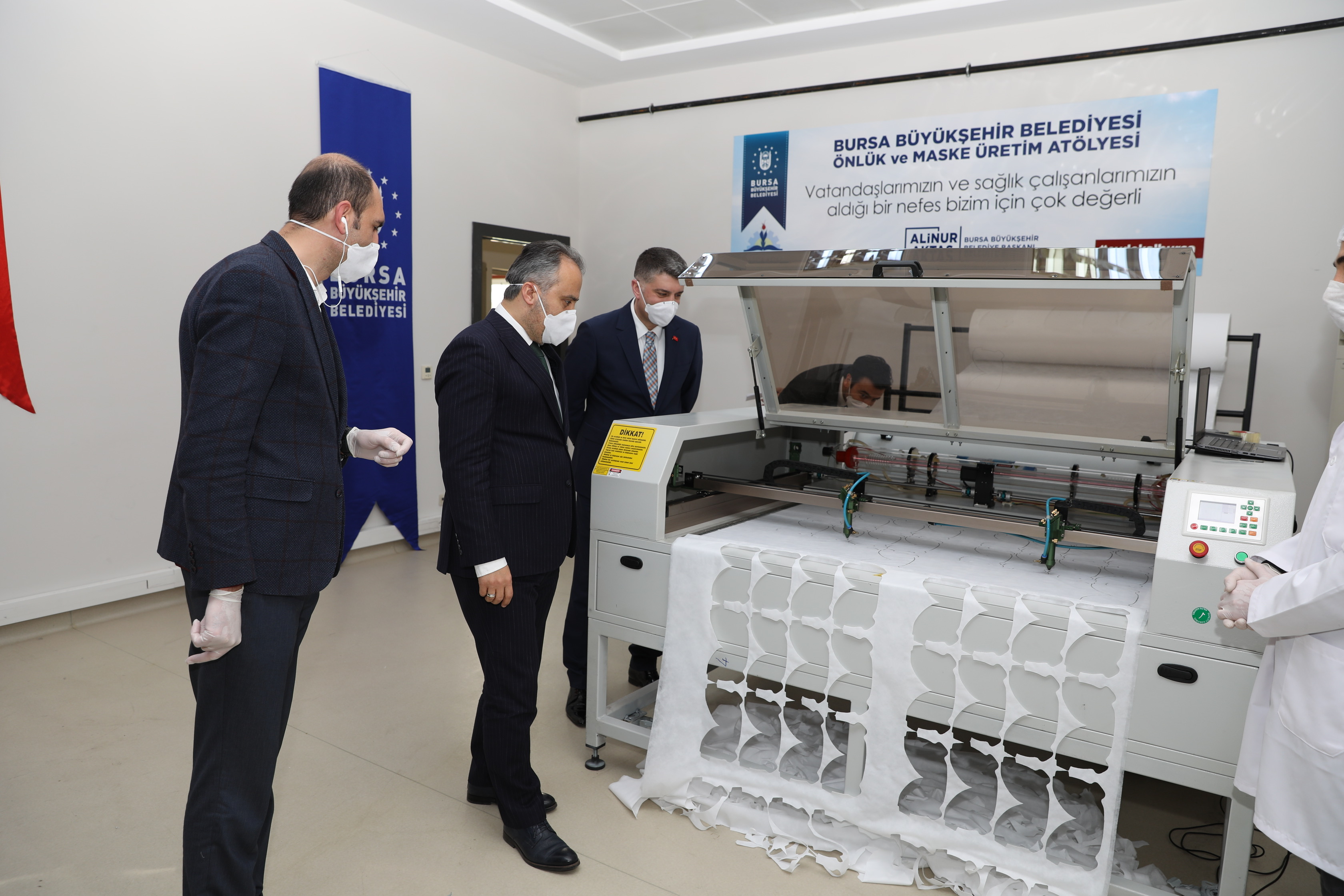 Başkan Alinur Aktaş, salgınla birlikte ortaya çıkan maske ihtiyacının Bursa’da da kendisini gösterdiğini ifade etti. İlk etapta ‘satın alma yoluyla’ temin ettikleri maskeleri, Büyükşehir Belediyesi bünyesinde ve toplu taşıma araçlarında değerlendirdiklerini, daha sonra değişen şartlara bağlı olarak bir üretim tesisi kurulması kararı aldıklarını belirten Başkan Aktaş, “Hemen arkadaşlarımızla birlikte, bir sanayici ağabeyimizin de desteğiyle lazer kesim makinesi satın aldık. BUSMEK’teki öğretmenlerimiz, çalışanlarımız elini taşın altına koydu. Günlük 10 bin adet olarak üretime başladık” diye konuştu.