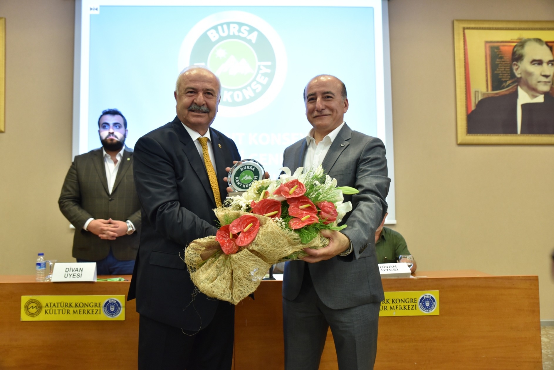 Bursa Kent Konseyi’nin eski başkanlarından merhum Semih Pala’yı da rahmetle yad eden Şevket Orhan, geçmiş dönem başkanı Hasan Çepni’ye ise hizmetlerinden dolayı teşekkür plaketi ve çiçek takdim etti.