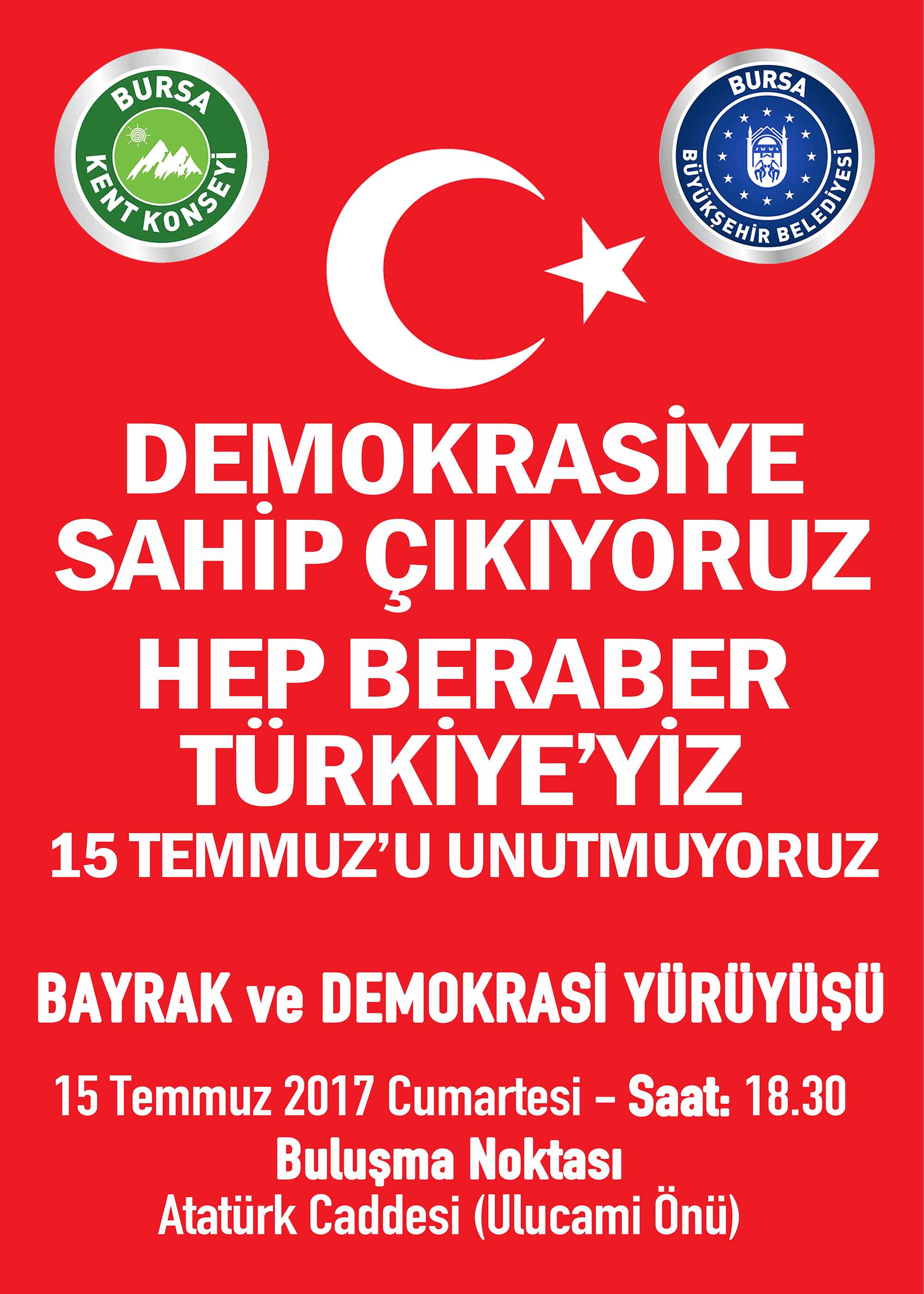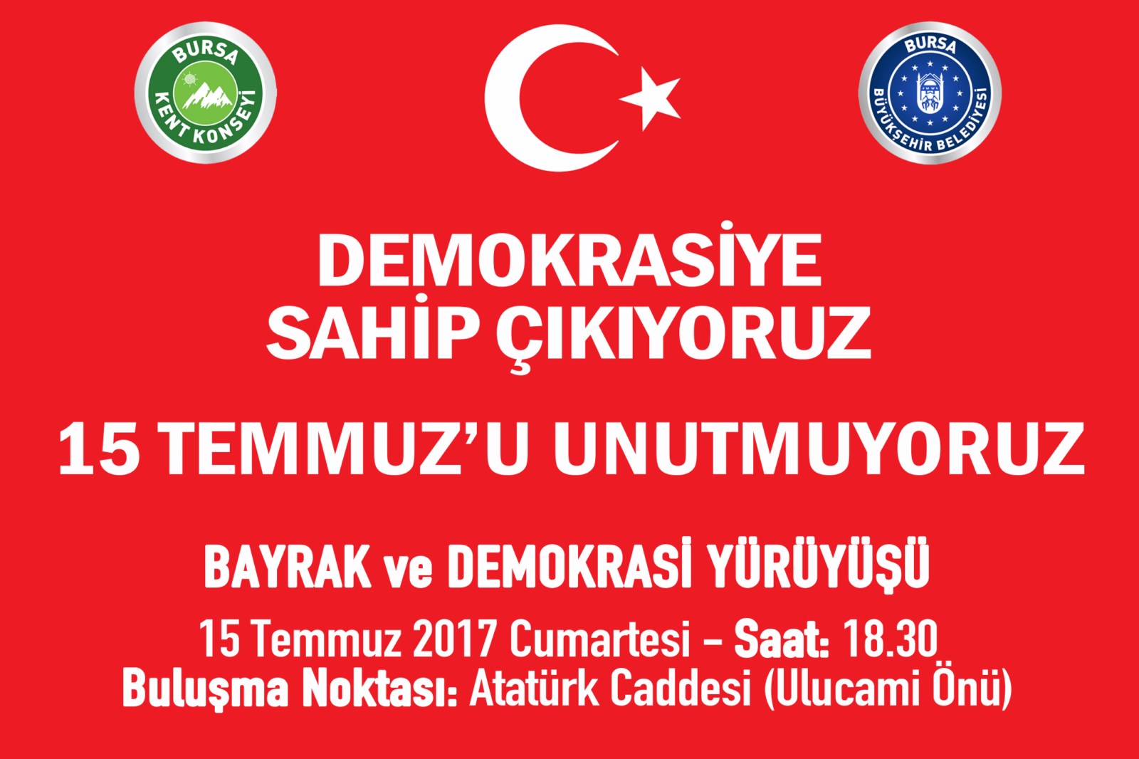 15 Temmuz 2016 günü gerçekleşen FETÖ terör örgütünün hain darbe girişiminin sene-i devriyesinde 15 Temmuz’u unutturmamak amacıyla Bursa Kent Konseyi öncülüğünde, toplumun tüm kesimlerinin katılımıyla 15 Temmuz 2017 Cumartesi günü saat 18.30’da Ulucami önünden başlayarak, Atatürk Caddesi ve Cumhuriyet Caddesi üzerinden geçilerek Şehreküstü 15 Temmuz Demokrasi Meydanı’nda bitecek ‘Bayrak ve Demokrasi Yürüyüşü’ düzenleniyor.
