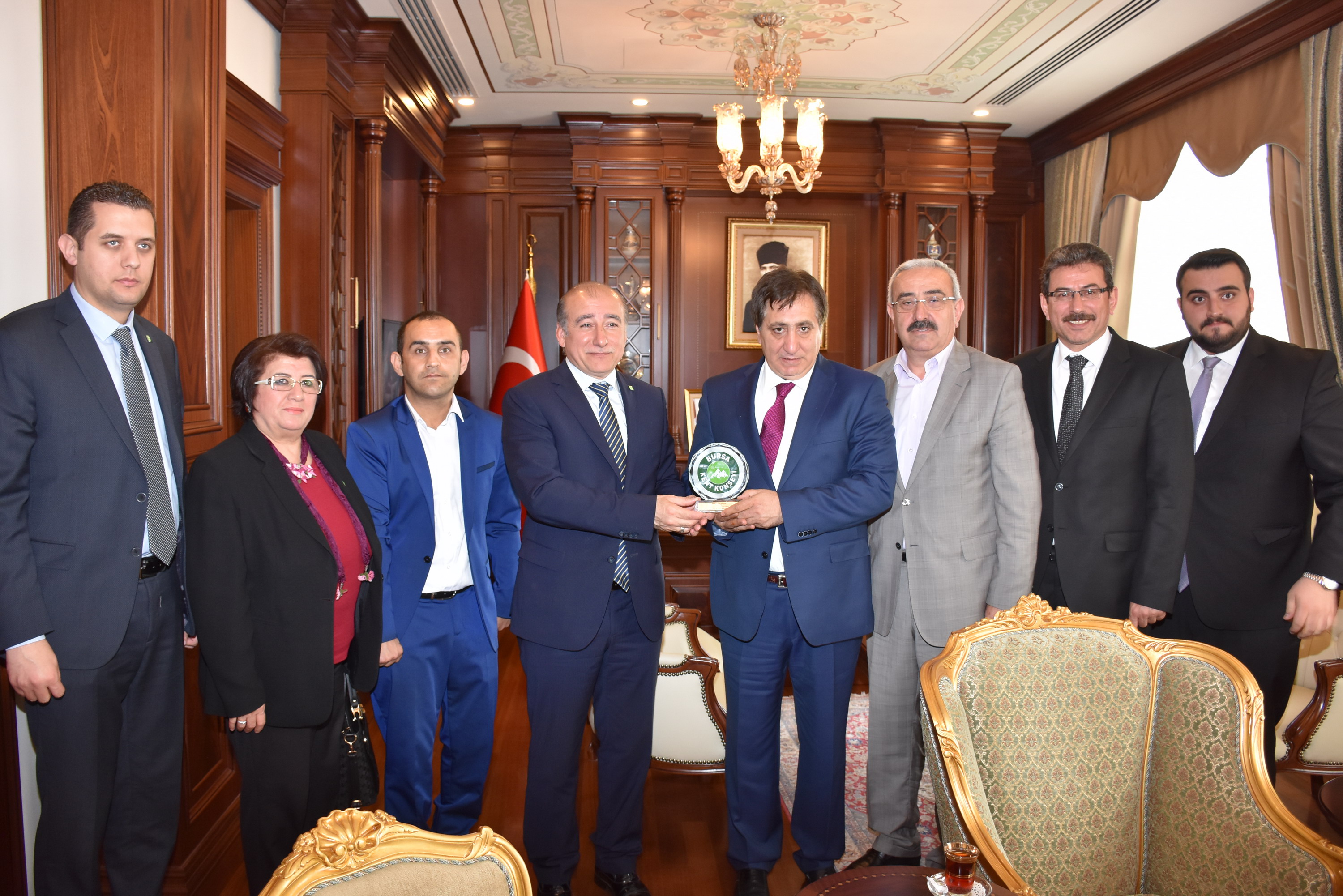Ziyaretin sonunda Bursa Kent Konseyi Başkanı Hasan Çepni, Vali Küçük’e plaket ve Bursa Kent Konseyi yayınlarından set hediye etti.