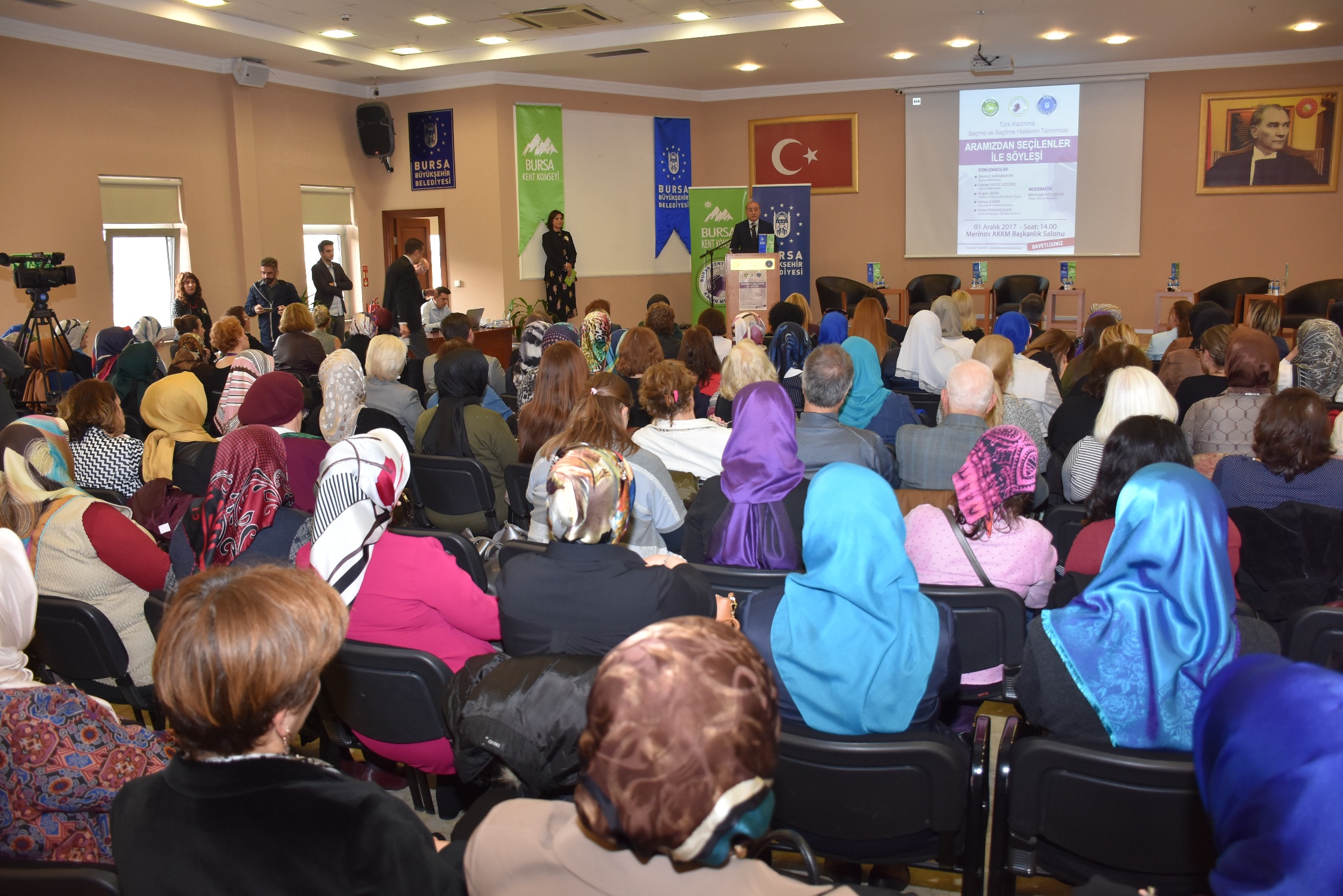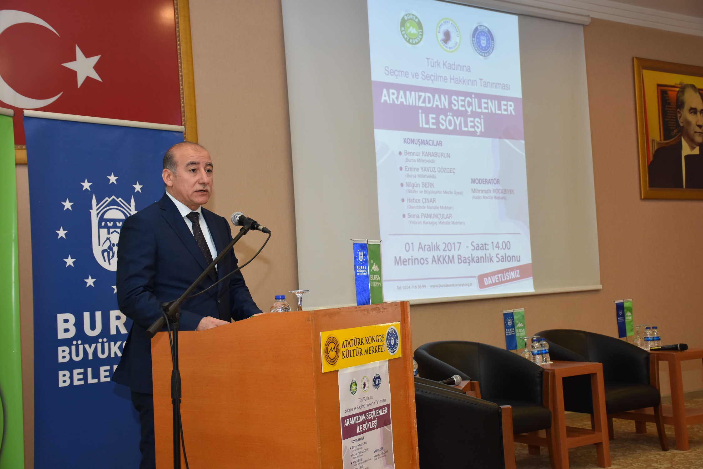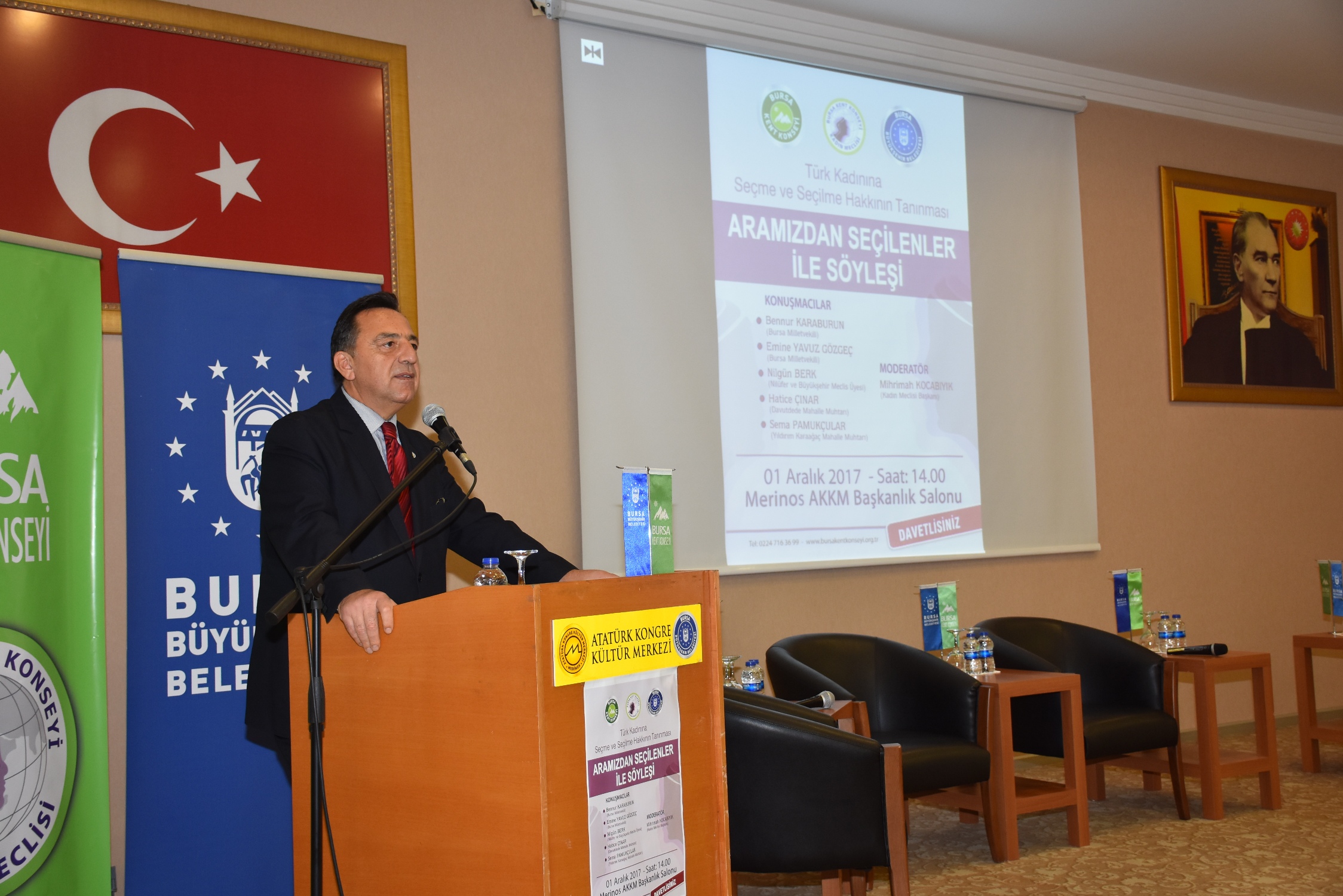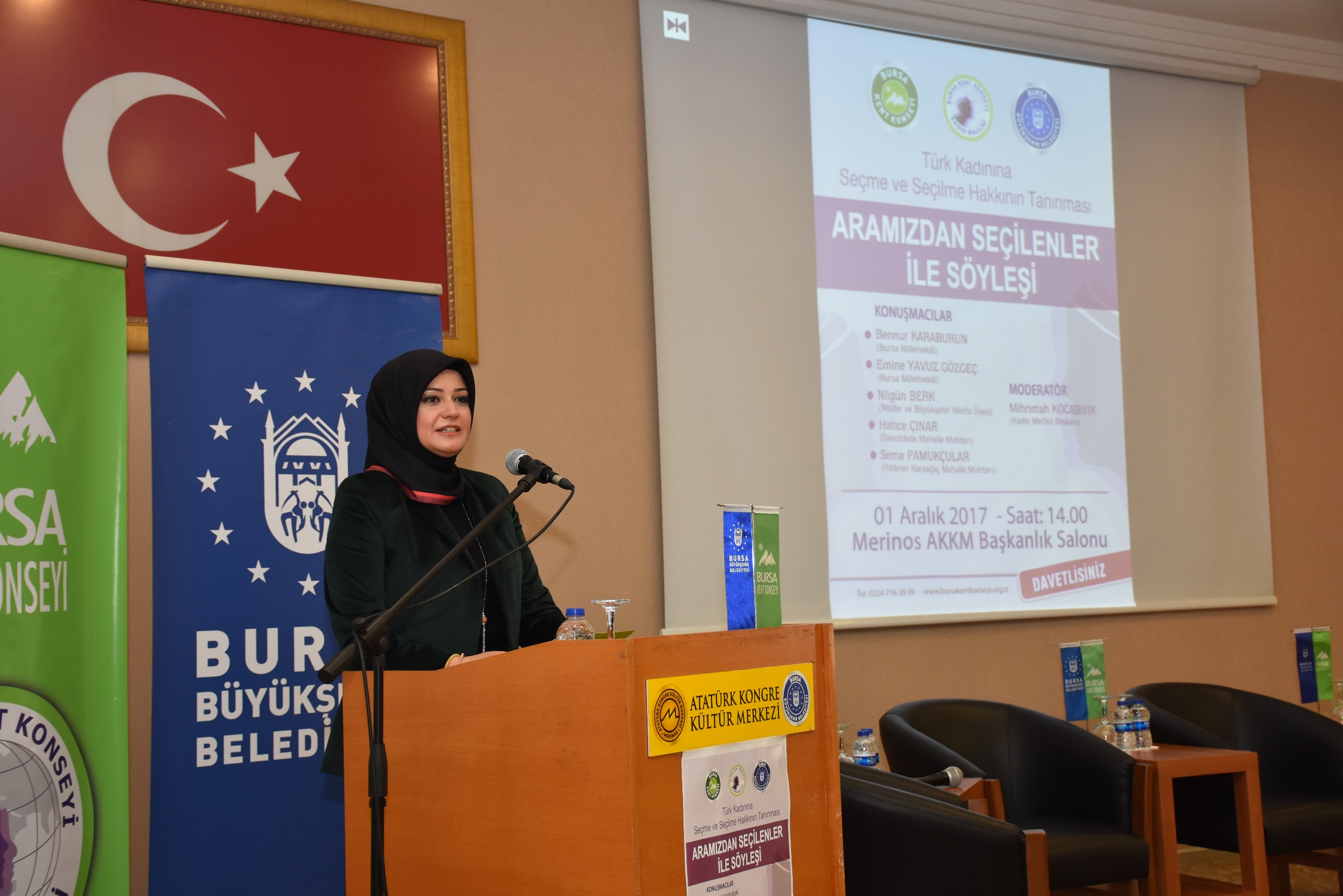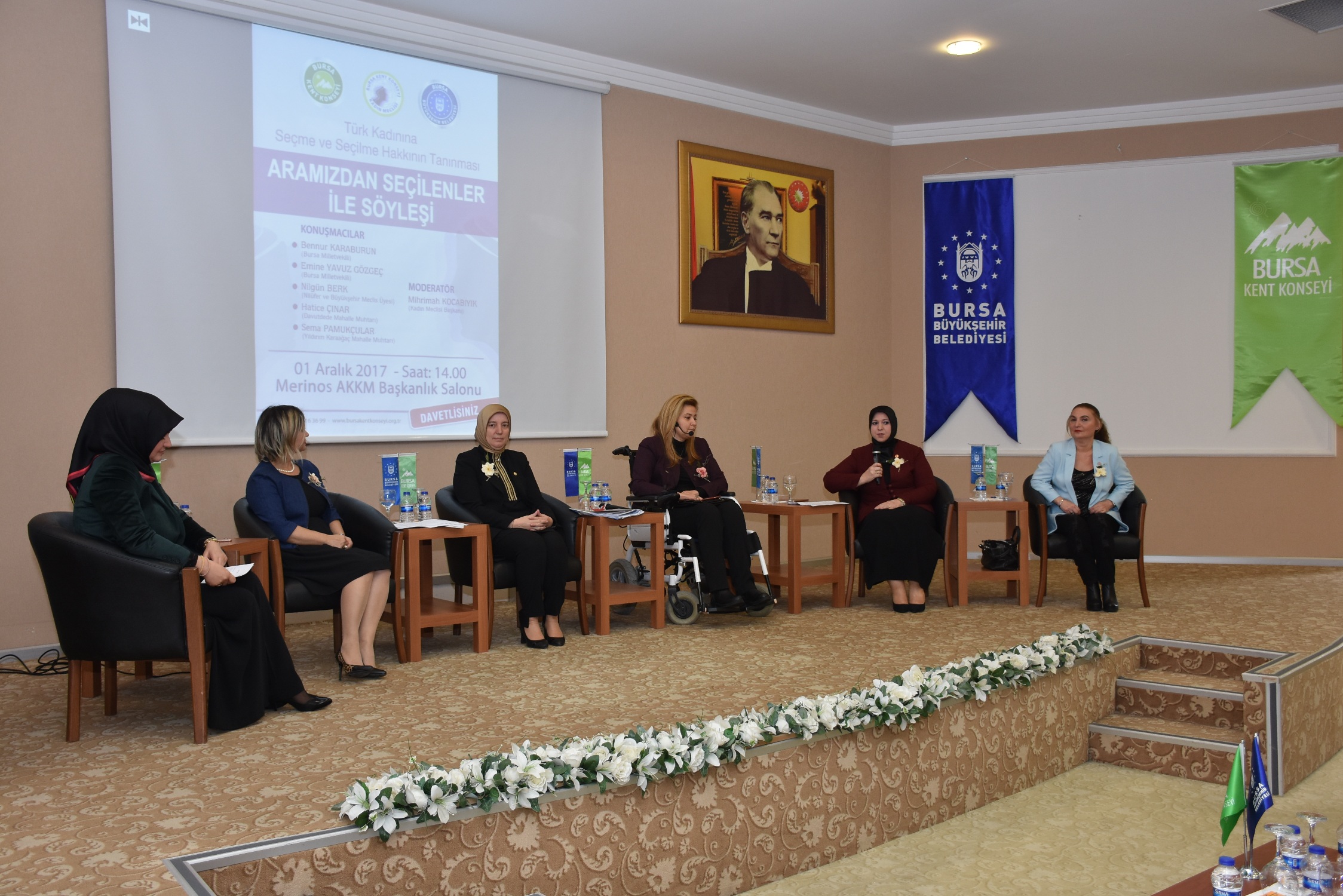 Bursa Kent Konseyi Kadın Meclisi tarafından Türk Kadınına Seçme ve Seçilme Hakkı Verilmesi yıldönümü münasebetiyle düzenlenen ‘Aramızdan Seçilenler ile Söyleşi’ programı, Atatürk Kongre Kültür Kongre Merkezi (Merinos AKKM) Başkanlık Salonu’nda yapıldı. Kadın derneklerinin, sivil toplum kuruluşlarının, kent konseylerinin kadın meclislerinin, muhtarların ve vatandaşların yoğun ilgi gösterdiği programda, kadınların seçme ve seçilme sürecinde yaşadığı zorluklar ve kadın yönetici sayısının arttırılması yönünde yapılabilecek çalışmalar ele alındı.