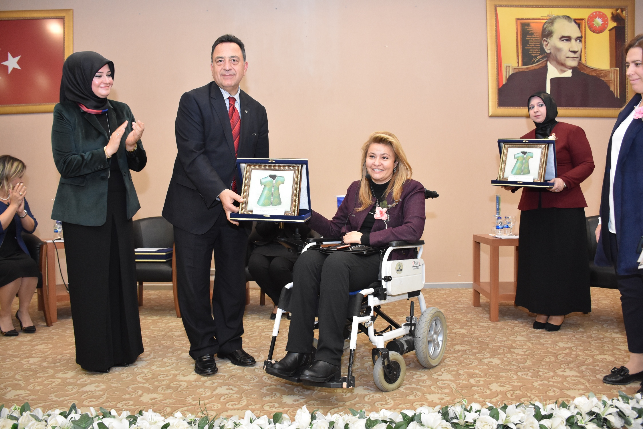 Konuşmaların ardından söyleşi programına geçildi. Bursa Kent Konseyi Kadın Meclisi Başkanı Mihrimah Kocabıyık’in moderatörlüğünde yapılan programın ilk konuşmacısı Bursa Milletvekili Bennur Karaburun oldu. Özgeçmişinden bahseden Bennur Karaburun, 23 yaşına kadar yüzme ve su topu sporuyla uğraştığını, 1996’da bir trafik kazası geçirdiğini ve zorlu bir süreç geçirdiklerini anlattı. Biraz iyileştikten sonra 6 sene boyunca kardeşiyle birlikte çalıştığını, 2000’lerde omurilik felci hastalığıyla ilgili araştırmalar yapmaya başladığını, 2005’te kök hücre ameliyatı olduğunu ifade etti. Bir kez daha ameliyat olması gerekirken önünün tıkandığını dile getiren Karaburun, “Ameliyat sayesinde tekrar yüzmeye başlamıştım. 2012’de birgün tezgahın başında dururken, Başbakanımız Sayın Recep Tayyip Erdoğan’ın geldiğini duydum. Kök hücreden bahsetmek için yola çıktım ve Sayın Başbakanımıza durumu anlattım. Girişimler sonucu 2014’te tekrar ameliyat oldum. 2015’te Cumhurbaşkanımız olarak Bursa’ya gelen Sayın Recep Tayyip Erdoğan ile bir ameliyat daha olmak istediğimi iletmek için görüştüm. O dönemde engelli vatandaşlardan milletvekili başvuru parası alınmayacağı duyuruldu. Annem de bu sefer benimde milletvekili olmamı istedi. Böyle bir umudum yoktu. Cumhurbaşkanımızla görüşeceğimiz gün babama sordum ve o da destek verdi. Görüşme sırasında tekrar ameliyat olmam gerektiğini dile getirdim. Ardından milletvekili olmak istediğimi söyledim. O dönem bakanımız olan Faruk Çelik beyi yanımıza çağırdı. Böylece süreçler sonunda milletvekili oldum” dedi. Karaburun, millete hizmet etme imkanı bulduğu için mutlu olduğunu dile getirdi. Kadınların farklı bakış açıları geliştirebildiğini, parti içerisinde kadına büyük önem verildiğini söyledi. Kadınların öncelikle kendisini geliştirmesi ve güçlendirmesi gerektiğini vurgulayan Karaburun, son dönemde milletvekili yanı sıra büyükelçi ve kaymakamlar arasında da kadın sayısının arttığını söyledi.