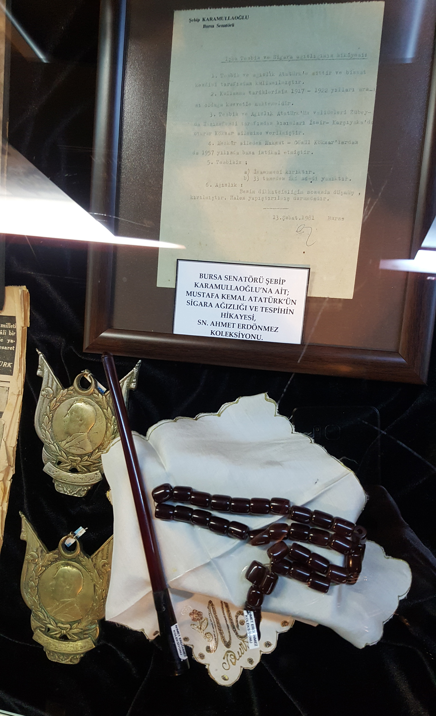 Bursa Senatörü Şebip Karamullaoğlu tarafından 13 Şubat 1981 tarihinde Ahmet Erdönmez’e her 10 Kasım’da sergilemesi şartı ile verilen Atatürk’e ait tesbih ve sigara ağızlığı, Bursa Kent Müzesi’nde görülebilir.