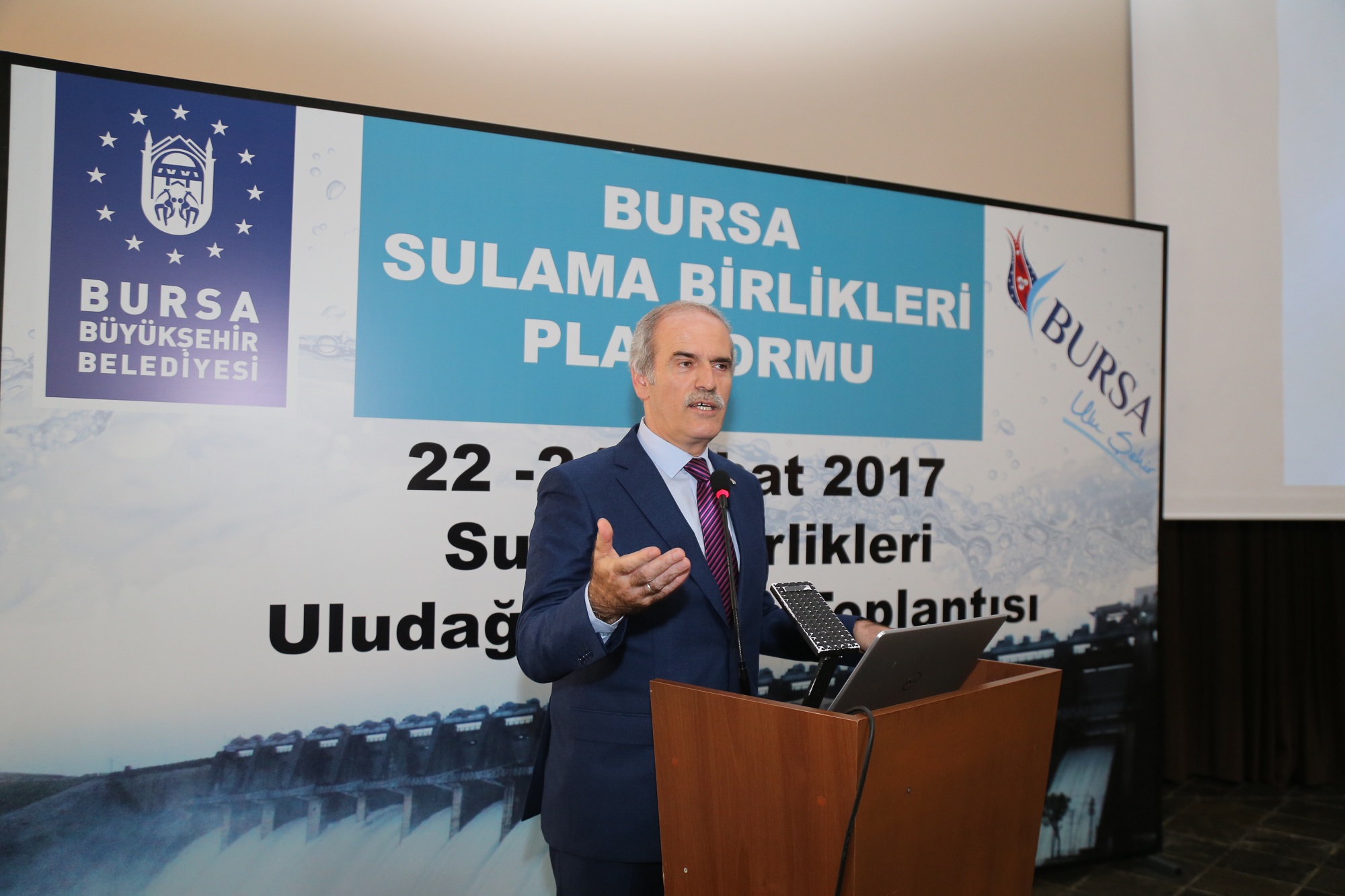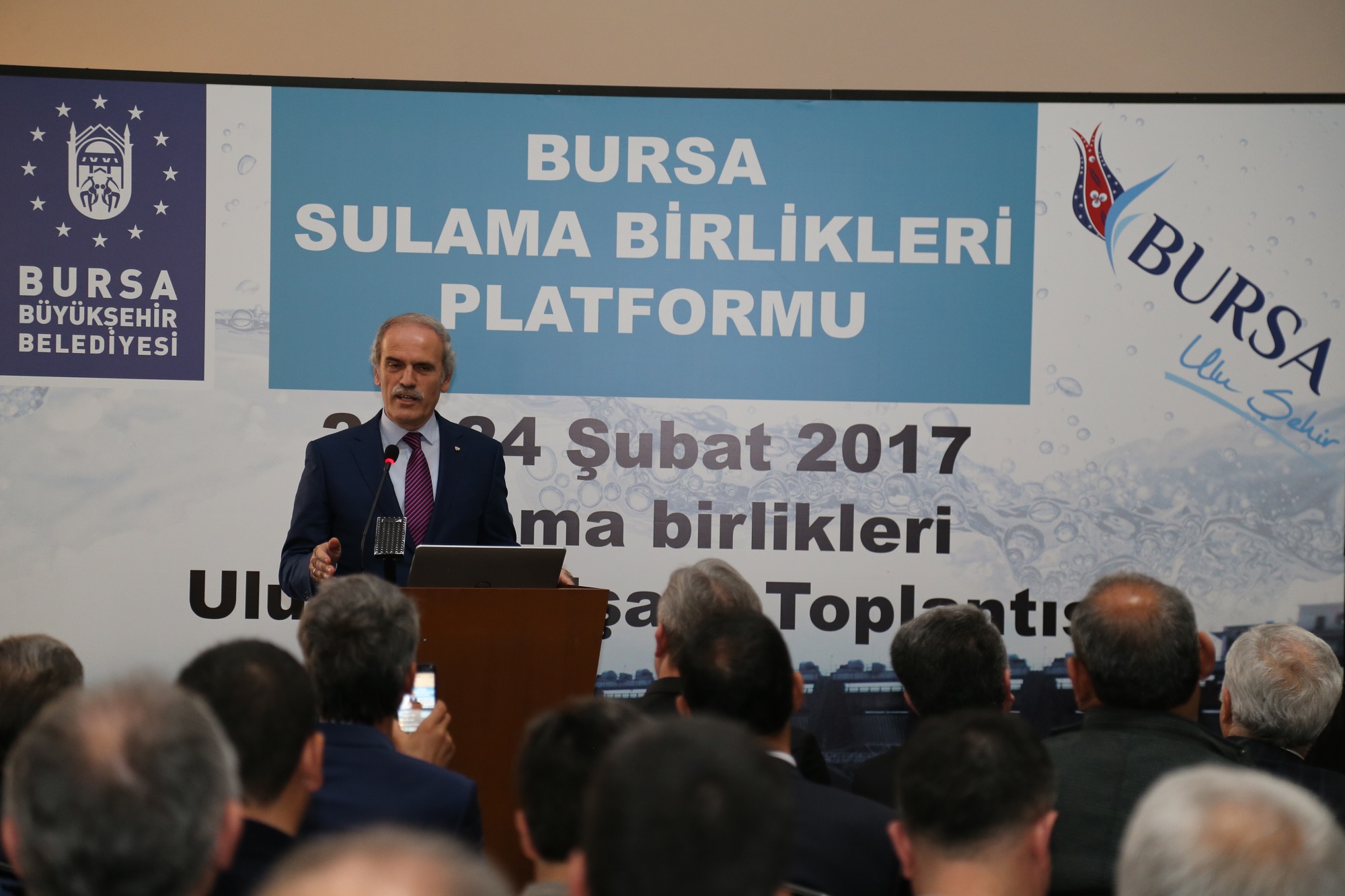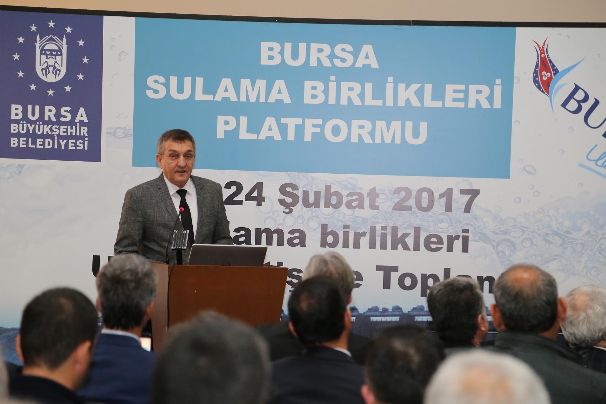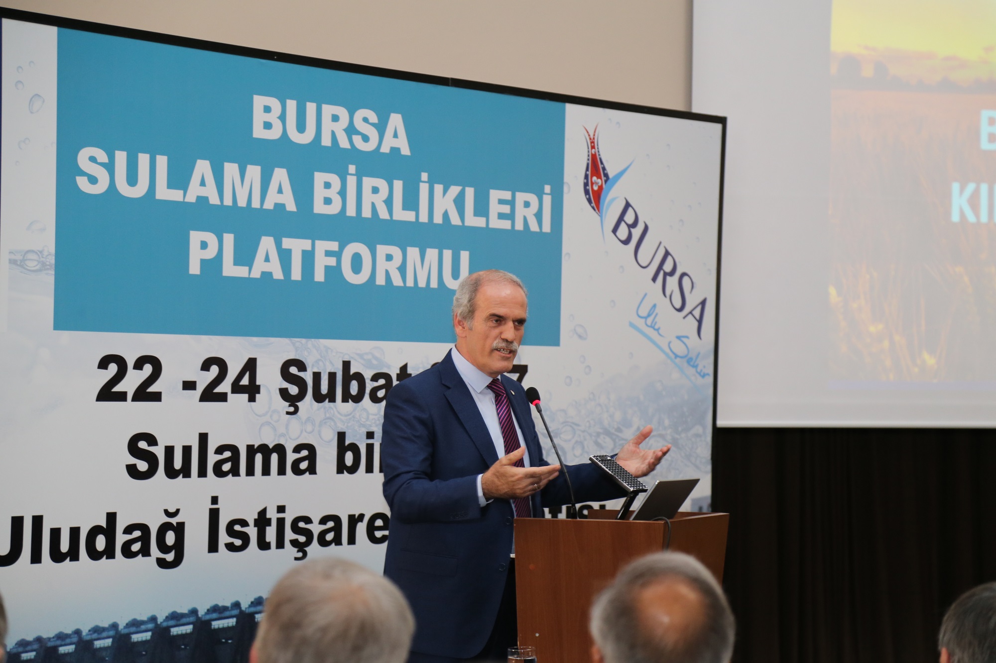 Devlet Su İşleri Genel Müdürlüğü 1. Bölge Müdürü Nazmi Koçak ise katılımcılara teşekkür ederken, Bursa Sulama Birlikleri Platformu adına Karacabey Sulama Birliği Başkanı Sami Özseçen, Türkiye’nin 48 ilinden 190 sulama birliği başkanı ve temsilcilerinin Bursa’da bir araya geldiğini söyledi. Özseçen, dönem dönem yapılan toplantılarında Türk tarımına daha iyi bir sulama hizmeti verebilmek için istişarede bulunduklarını anlatarak, Bursa’da aktif olarak 10 adet sulama birliğinin 650 bin dekar alanda sulama yaptığını belirtti. Özseçen, 37 bin dekar zeytin, 30 bin dekarda her çeşit meyve, 16 bin dekar çeltik ve 48 bin dekar da sebzeden çiçekçiliğe kadar sulama yapıldığını ifade etti. Özseçen, son 20 yılda Bursa sulama birliklerinin kurumsal altyapısının yenilediğini ve bugün çok sıkıntı yaşanmadığını kaydetti. Su kıtlığı olan ülkede tarımda su yetersizliği olduğuna değinen Özseçen, Bursa’da sulama sistemlerinin kapalı sistemlerle yapılması gerektiğine dikkati çekti.