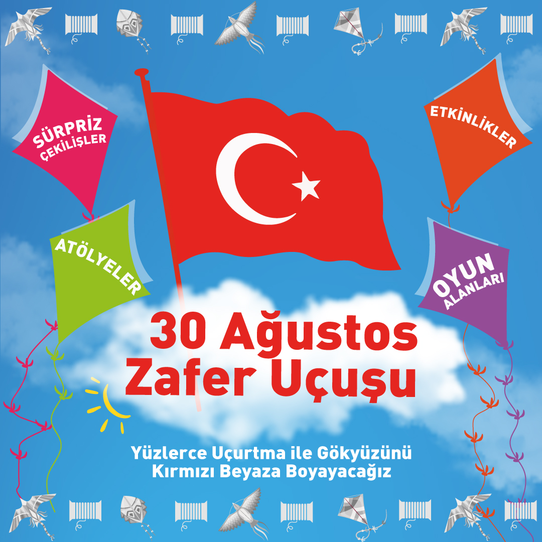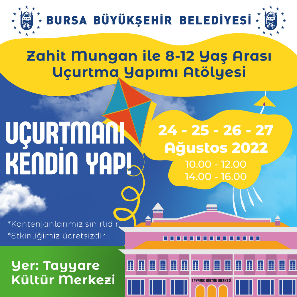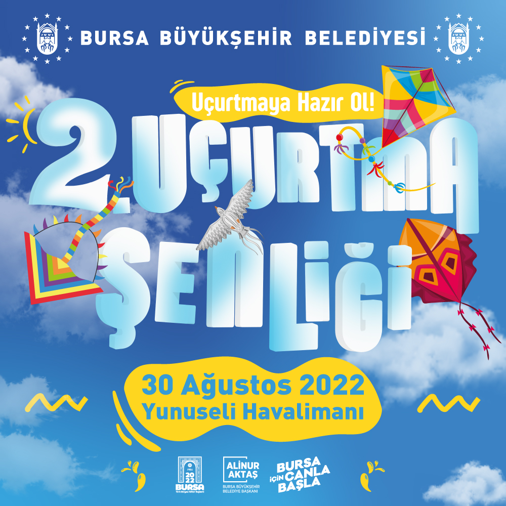 Festival ve şenlik şehri olan Bursa’da 30 Ağustos Zafer Bayramı’nda birbirinden eğlenceli etkinlikler Bursalıları bekliyor. Şüphesiz herkesin çocukluğunda önemli bir yeri olan uçurtmalar tekrar gökyüzündeki yerini alıyor. 24-25-26-27 Ağustos tarihlerinde Tayyare Kültür Merkezi’nde, uçurtma yapım atölyeleri düzenlenecek. Atölyelere, 8–12 yaş arası ‘uçurtmaya merak duyan’ tüm çocuklar katılabilecek. Atölye sonunda tüm katılımcıların birer uçurtması olacak ve katılımcılar yaptıkları uçurtmaları 30 Ağustos’ta düzenlenecek olan Zafer Uçuşunda havalandıracaklar. Yunuseli Havalimanı’ndaki şenlikte; 12:00–21:00 saatleri arasında sürpriz sahne etkinlikleri, atölye stantları, çocuk oyun alanları ve animasyon ekipleri yer alacak. Tam etkinlikler ücretsiz olacak.