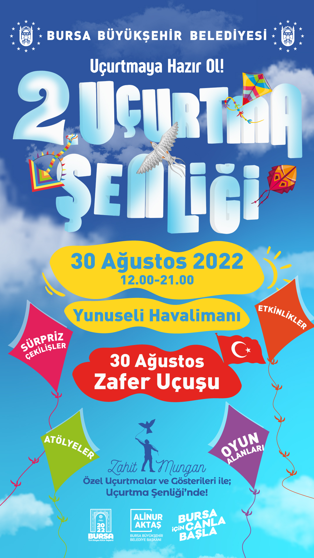 Gün boyu sürecek olan bu etkinlikte gökyüzü hiç boş kalmayacak. Ömrü uçurtmaların peşinde geçen adam olan Zahit Mungan, geçen sene olduğu gibi bu sene de şenlikteki yerini alacak. Dünya çapındaki festivallerde Türkiye’yi temsil eden ve uçurtmayı farklı boyutlara taşıyan Zahit Mungan’ın özel yapım devasa uçurtmaları, gün boyunca Bursalılar için gökyüzünde olacak. Farklı şehirlerden katılım sağlayan uçurtma meraklıları da bu görsel şölene eşlik edecek. 30 Ağustos Zafer Bayramı’nda gökyüzünde herkesi duygulandıracak ve gururlandıracak bir manzara da olacak. “İstikbal göklerdedir!” inancıyla mücadele eden ve bu ülkeyi bize miras bırakan atalarımızın şanlı zaferi, kırmızı beyaz uçurtmaların gökyüzünü kaplayacağı zafer uçuşuyla kutlanacak.