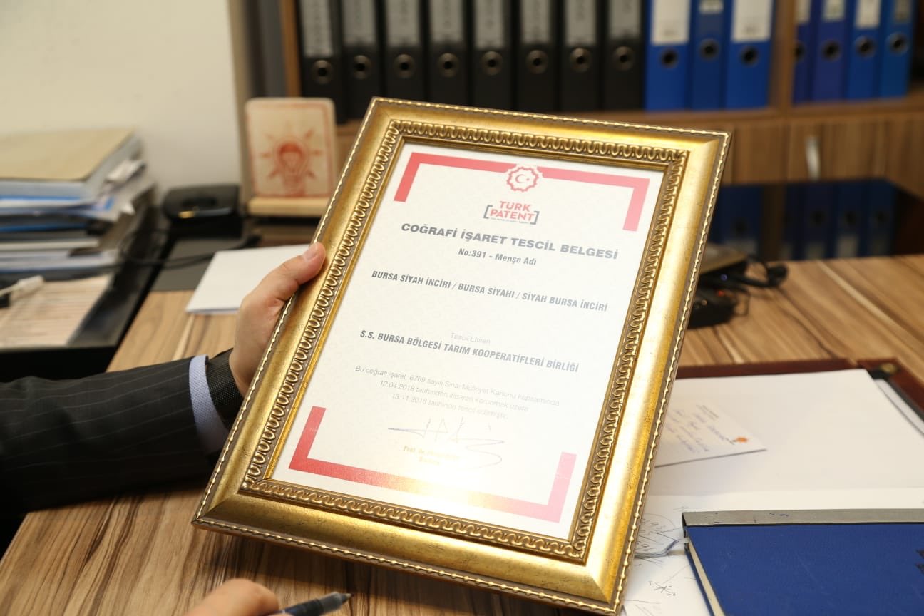 Bursa’da kırsal kalkınmanın sağlanması amacıyla gerek Kırsal Hizmetler Daire Başkanlığı gerekse de Tarım A.Ş. aracılığıyla kaliteli tohumluk temininden, yüksek verimli hayvan ırklarının çiftçilere dağıtılmasına, üretim kalitesinin artırılmasından ürünlere uluslararası pazar bulunmasına kadar her alanda önemli çalışmalara imza atan Bursa Büyükşehir Belediyesi, Bursa’nın bir ürününün daha tescillenmesini sağladı. Büyükşehir Belediyesi iştiraklerinden Tarım A.Ş. desteğiyle tescilli Bursa Siyah İnciri, ‘BlackBursa’ markasıyla uluslararası pazarlarda alıcı bulurken, Bursa Siyah İncirine ‘Coğrafi İşaret Tescil Belgesi’ de alındı. Tarım A.Ş. desteğiyle belgeyi alan Bursa Bölgesi Tarım Kooperatifleri Birliği yöneticileri, Bursa Büyükşehir Belediye Başkanı Alinur Aktaş’ı ziyaret etti.