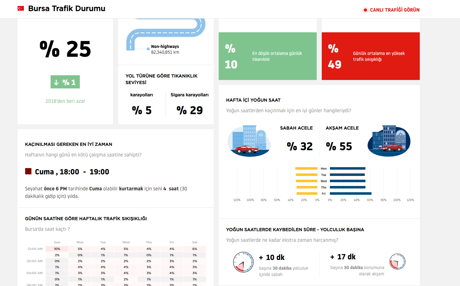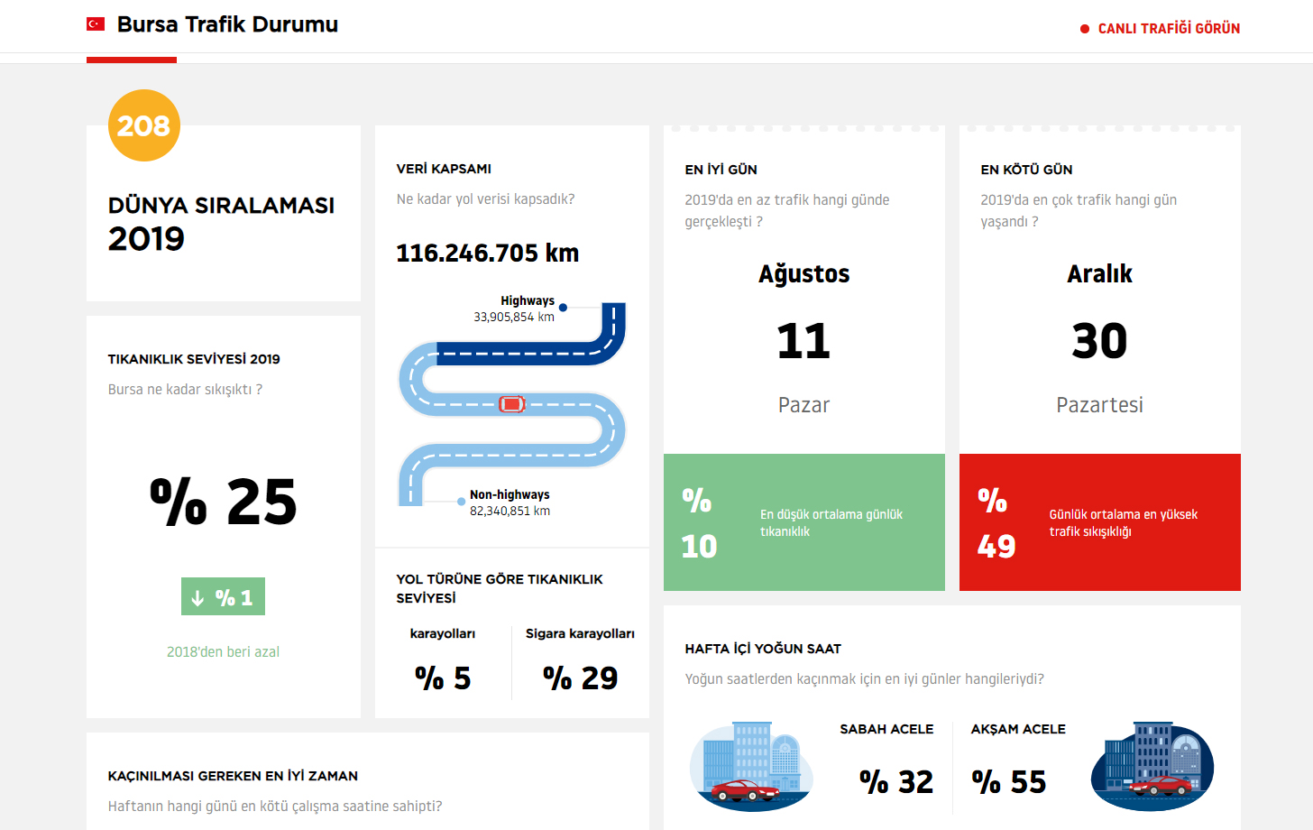 2019 yılı istatistiklerine göre Bursa, trafikteki en rahat gününü 11 Ağustos Pazar günü geçirdi. Bugünde trafikteki en düşük tıkanıklık yüzde 10 olarak ölçüldü. 2019’un en kötü günü ise 30 Aralık Pazartesi olarak istatistiklere yansıdı. Bugündeki en yüksek tıkanıklık ise yüzde 49'a ulaştı. Araştırmada hafta içi sabah ve akşam zirve saatlerde yaşanan trafik verileri de yer aldı. Buna göre sabah zirve yoğunluk yüzde 32, akşam zirve yoğunluk ise yüzde 55 oldu. Bu verilere göre Bursalılar sabah yoğun saatlerde 30 dakikalık yolculuk için ilave 10 dakikayı, akşam saatlerinde ise ilave 17 dakikayı arabalarında geçirdi.