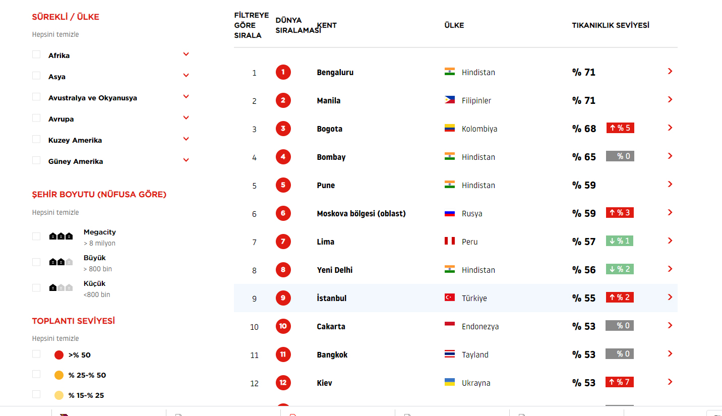 Hollanda merkezli Navigasyon teknolojisi şirketi TomTom'un dünyanın dört bir yanındaki şehirlerin ciddi hareketlilik zorluklarıyla mücadele etmesine yardımcı olmak için oluşturduğu TomTom Trafik Endeksinin 2019 yılı verileri açıklandı. Sürücülere, şehir planlamacılarına, otomobil üreticilerine ve politika yapıcılara 6 kıtadaki 57 ülkenin 416 şehrindeki trafik sıkışıklığı hakkında istatistikler ve bilgiler sunan araştırmada Türkiye'den de 10 kente yer verildi. Trafiğin en sıkışık olduğu kent Hindistan'dan Bengaluru olurken, Filipinler’den Manila ikinci ve Kolombiya’dan Bogota trafiğin en sıkışık olduğu üçüncü şehir oldu. Trafik sıkışıklığının 2019'da yüzde 55 olarak tespit edildiği İstanbul ise Hindistan Yeni Delhi’nin ardından trafiği en sıkışık 9'uncu kent oldu.