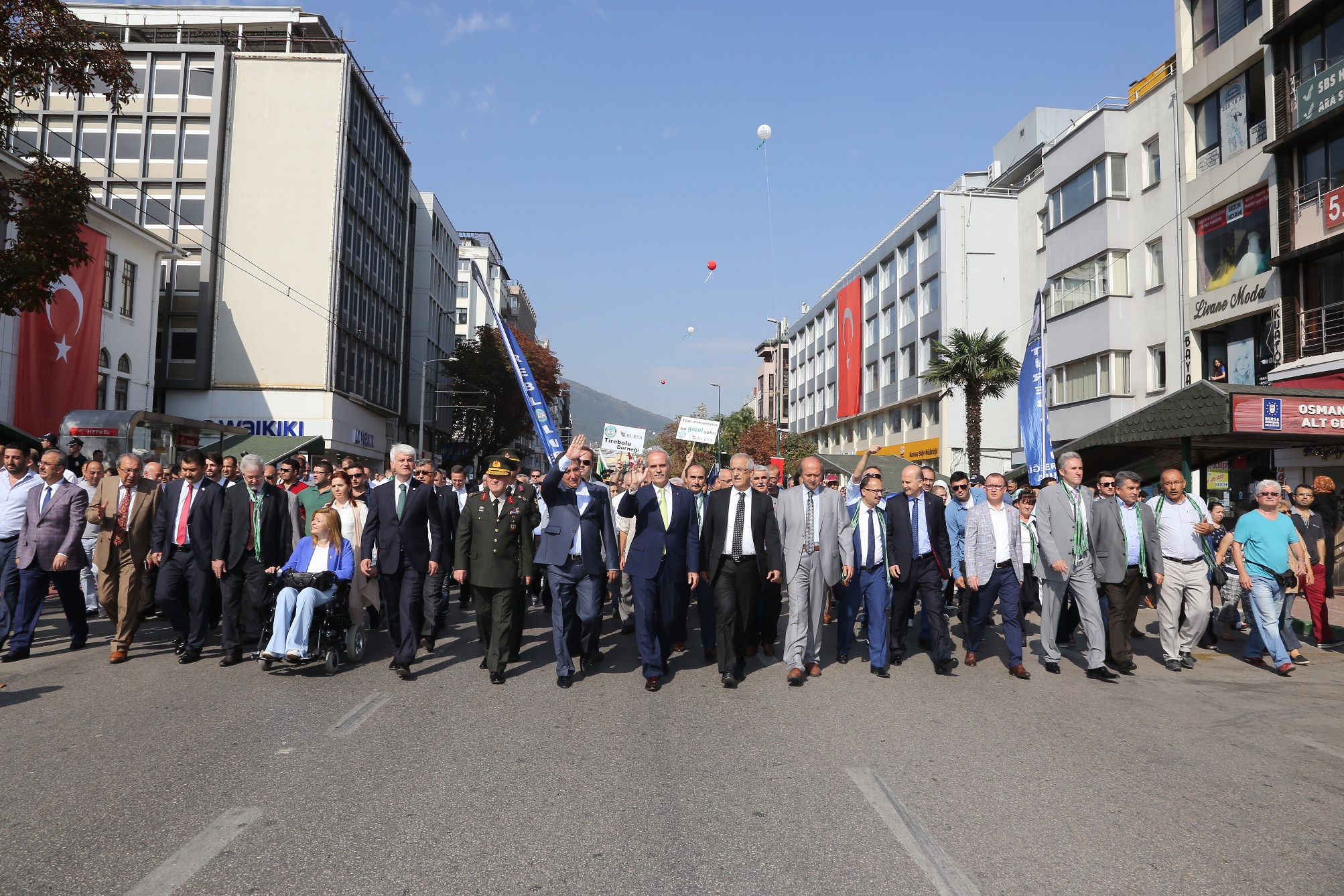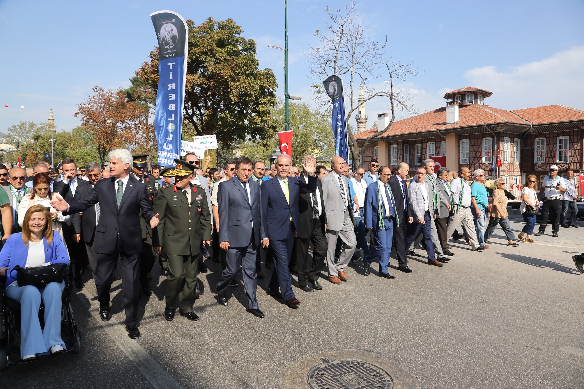 Büyükşehir Belediyesi ve Bursa Valiliği tarafından düzenlenen ‘Bursa’nın Düşman İşgalinden Kurtuluşunun 94. Yılı Kutlama Programı’, bu yıl 11 Eylül’ün pazar gününe denk gelmesi sebebiyle, önceki yılların aksine sabah saatlerinde gerçekleştirildi. Bursa Valisi İzzettin Küçük, Büyükşehir Belediye Başkanı Recep Altepe ve Garnizon Komutanı Tuğgeneral Ahmet Hacıoğlu ile protokol üyeleri, Tophane Saltanat Kapı önünden kortej yürüyüşünü başlatarak kutlamalara start verdi. Türkiye Muharip Gaziler Derneği Bursa Şubesi üyeleri, kılıç kalkan ekibi, mehter takımı ve Büyükşehir Belediye Bandosuyla birlikte marşlar eşliğinde Tophane yamaçlarından Atatürk Caddesi’ne inen protokol üyeleri, Atatürk Anıtı’na çelenk bırakarak saygı duruşunda bulundu. Kutlamalar daha sonra Heykel Kent Müzesi önünde kurulan platformda devam etti.
