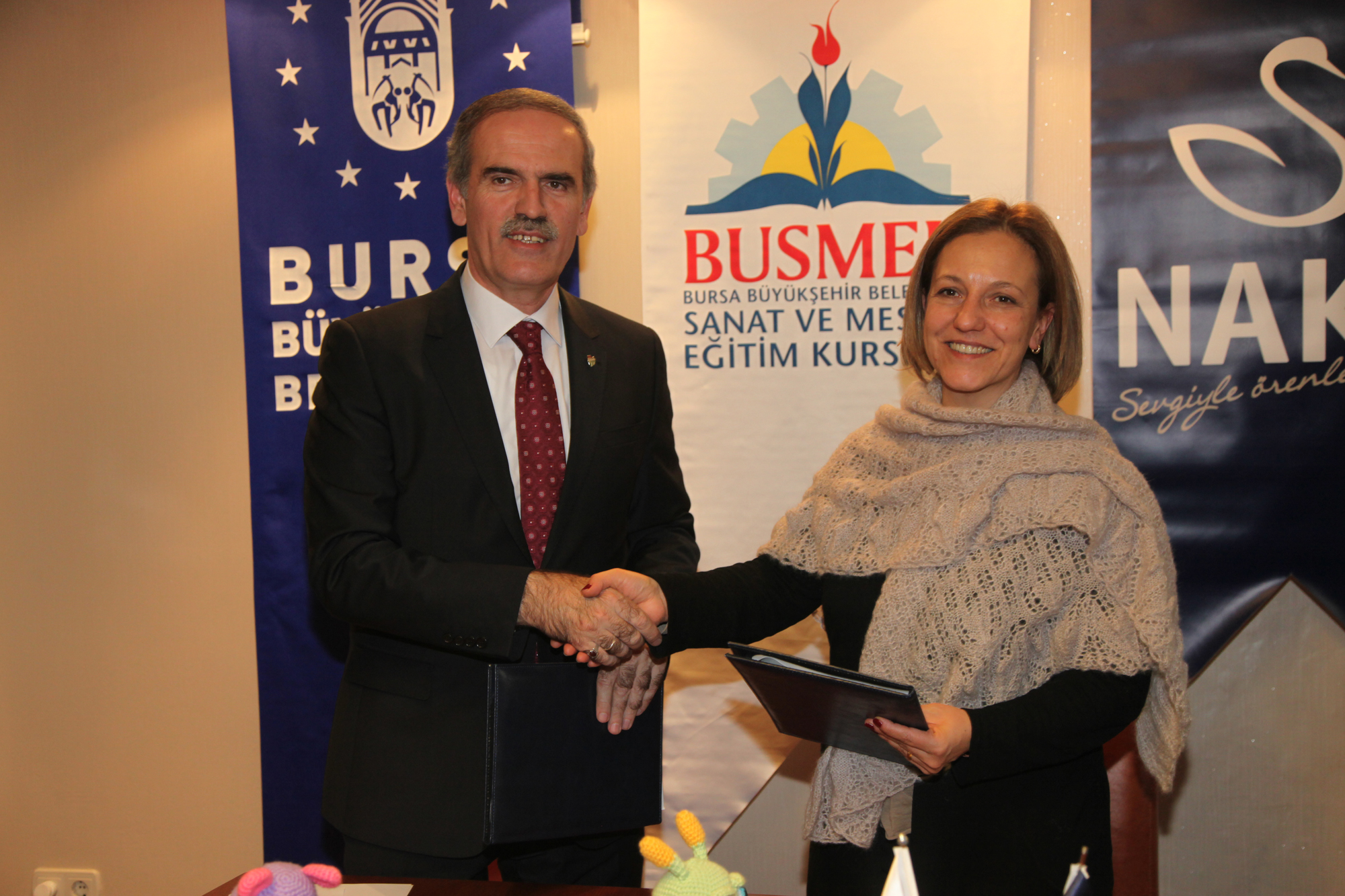 BUSMEK´in örgü kursları açması ve NAKO´nun da açılan kurslara iplik desteği sağlamasına ilişkin protokol, Büyükşehir Belediye Başkanı Recep Altepe ile NAKO Genel Müdür Yardımcısı Özlem Karakaş arasında imzalandı. BUSKİ´deki başkanlık makamında yapılan protokole, BUSMEK ve NAKO yetkilileri katıldı.