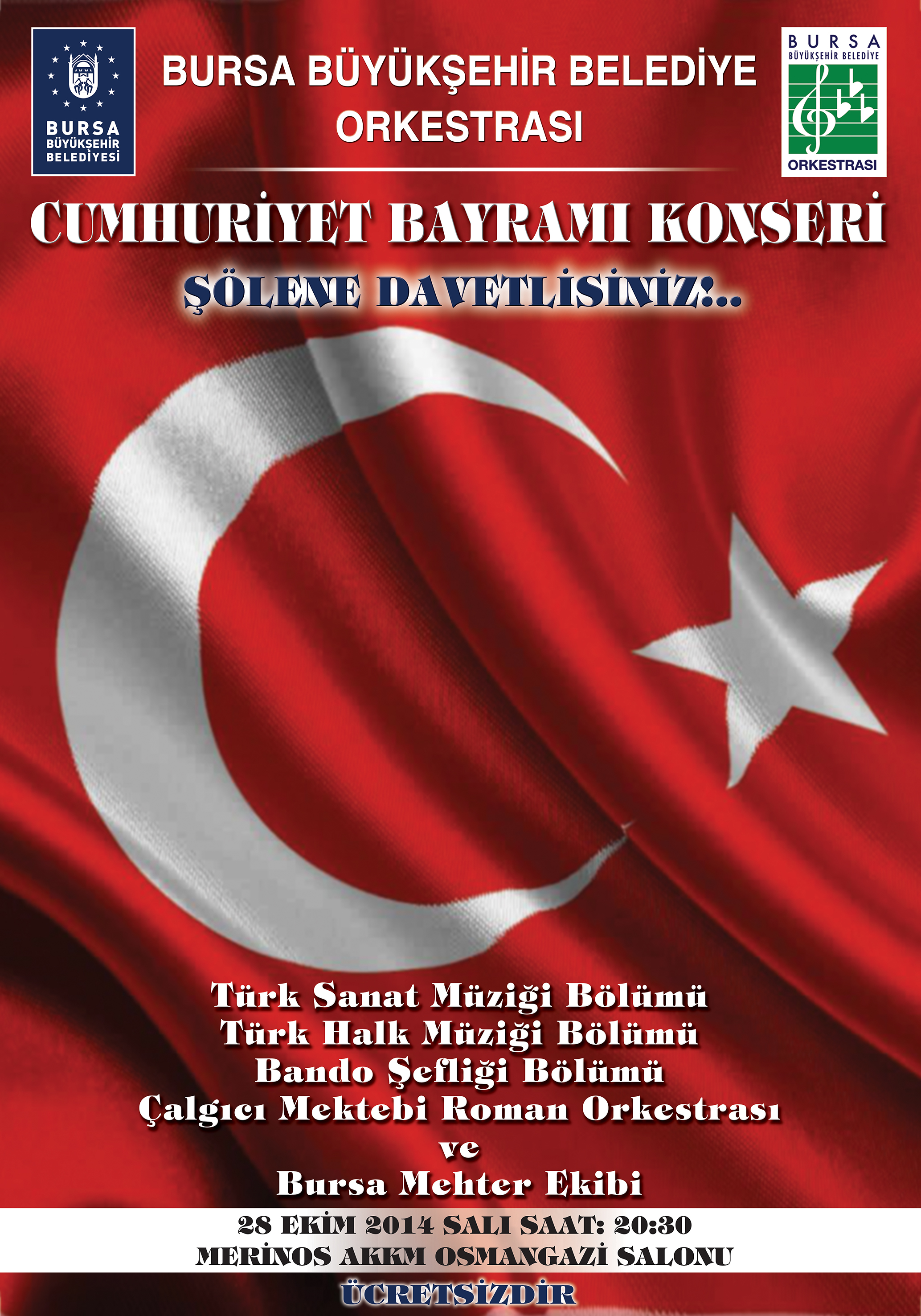 - Büyükşehir Belediyesi Orkestrası’nın sunacağı ‘Cumhuriyet Bayramı Konseri’nde Büyükşehir Belediye Orkestrası Türk Sanat Müziği ve Türk Halk Müziği bölümleri, Bursa Mehter Ekibi, Bando şefliği ve Çalgıcı Mektebi Roman Orkestrası sahneye çıkacak.