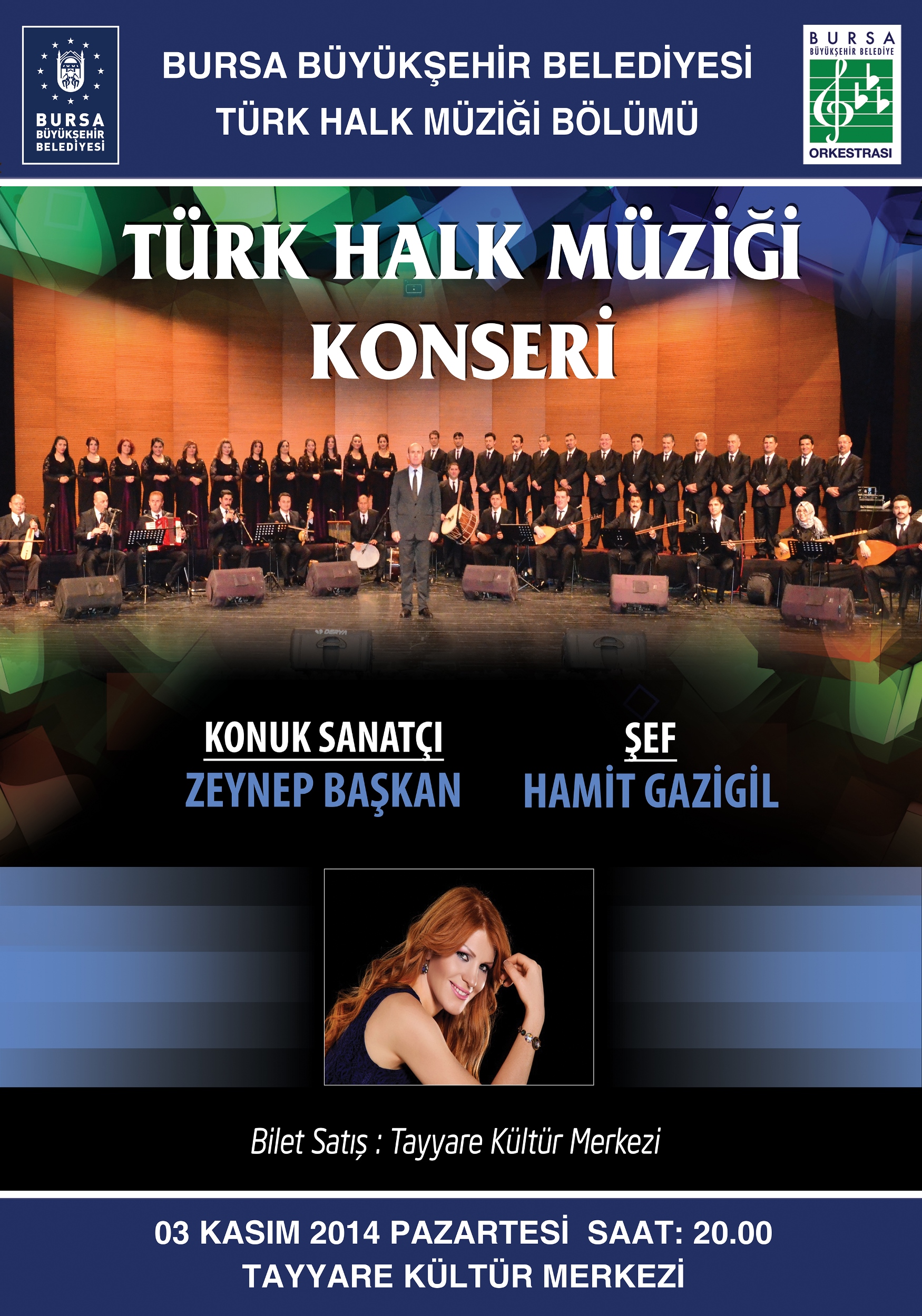 Bursa Büyükşehir Belediyesi Orkestrası Türk Halk Müziği Bölümü de 2014 – 2015 sanat sezonuna, 3 Kasım Pazartesi günü saat 20.00’da Tayyare Kültür Merkezi’nde vereceği konserle başlayacak. Hamit Gazigil’in şefliğinde gerçekleştirilecek olan konserde sevilen sanatçı Zeynep Başkan konuk solist olarak sahneye çıkacak.
