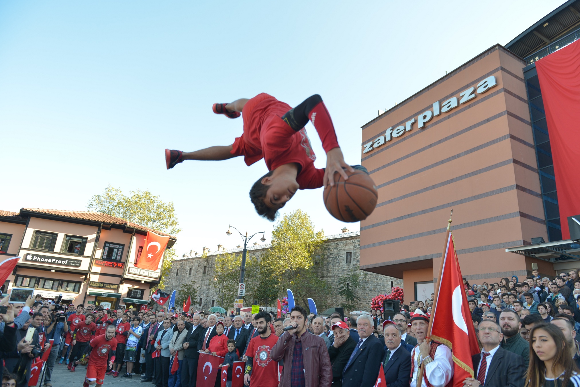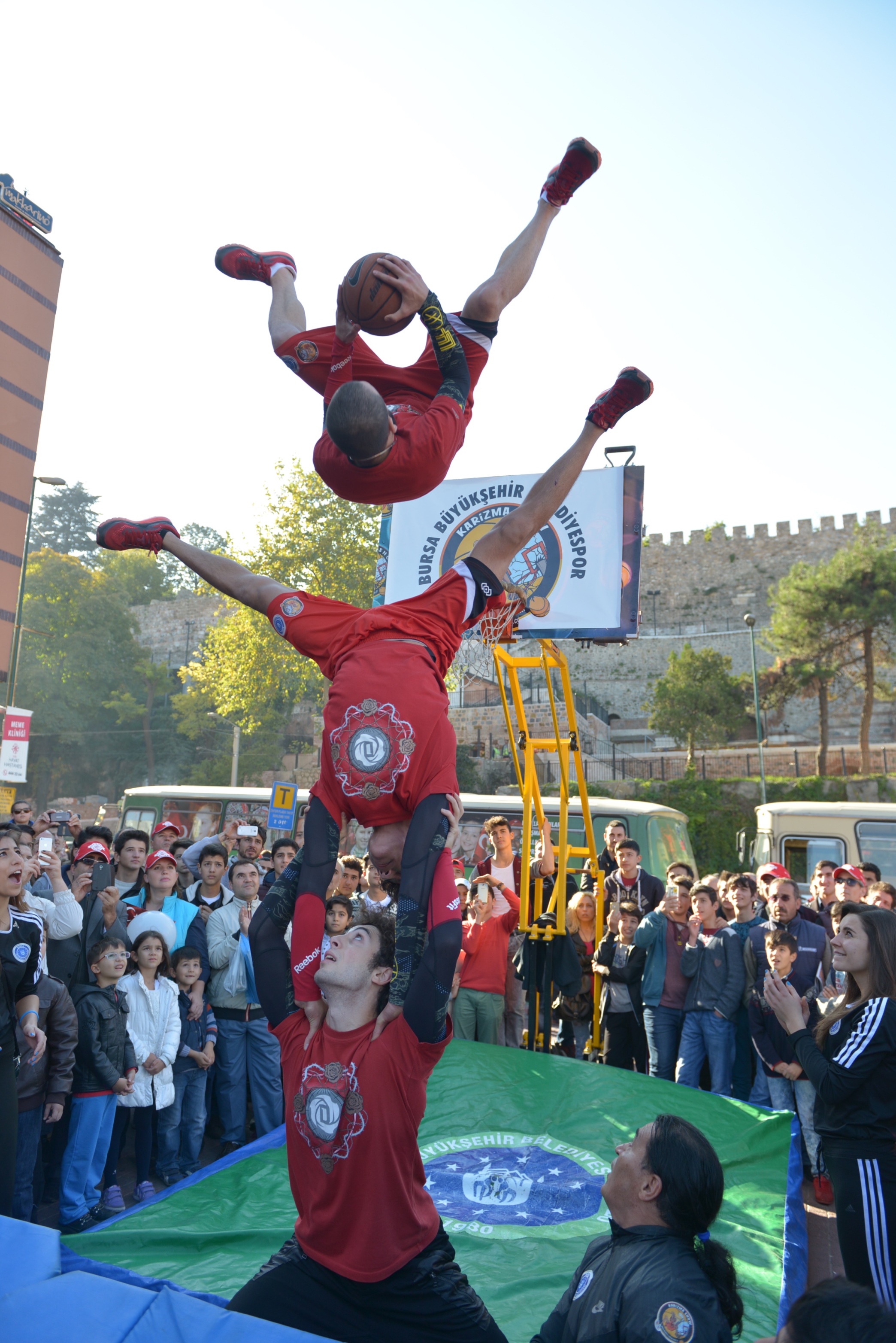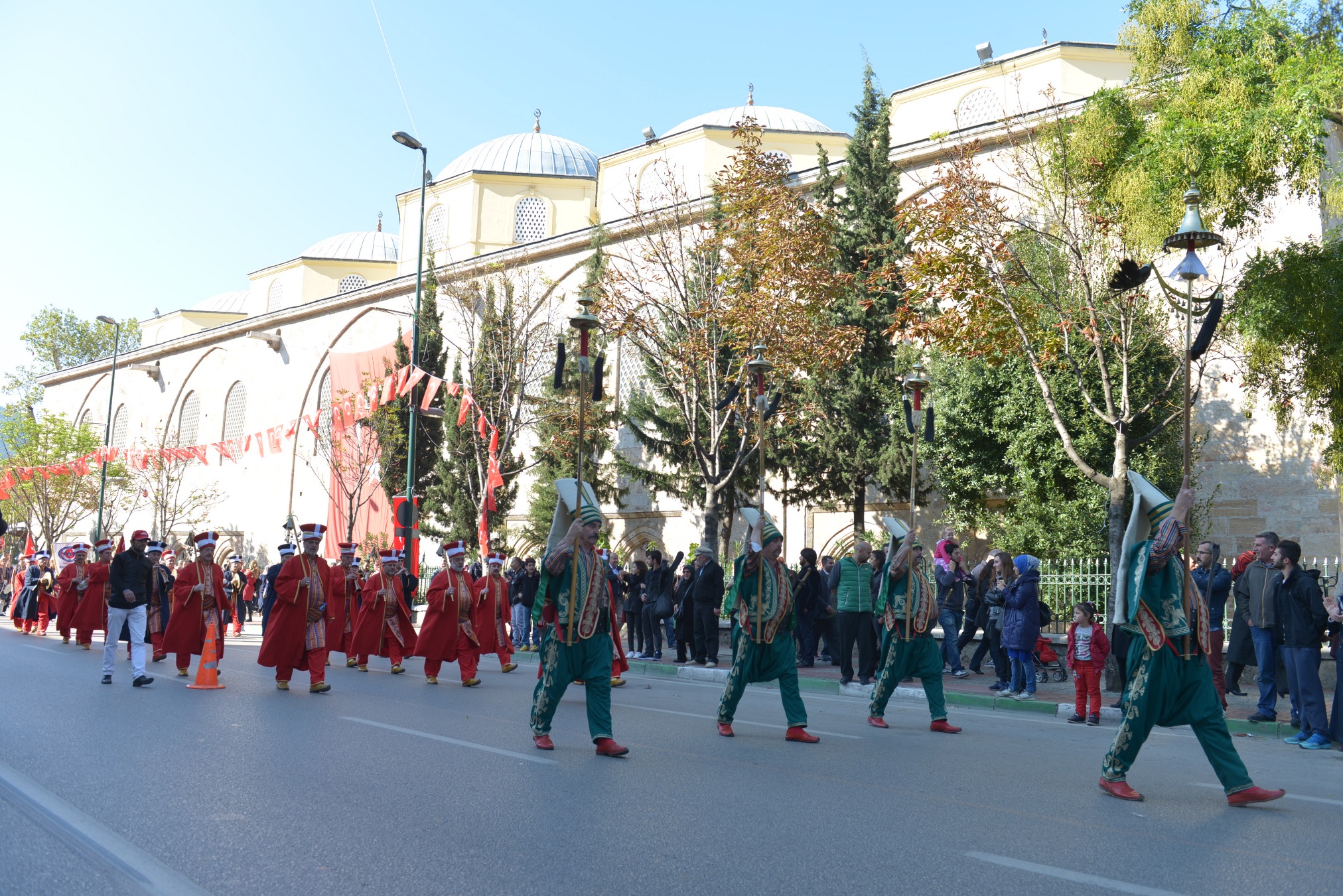 Büyükşehir Belediye Bandosu, Bursa Mehter Takımı, Yeşil Bursa Kılıç Kalkan Ekibi ve Türkiye Muharip Gaziler Derneği Bursa Şubesi mensuplarının da eşlik ettiği yürüyüş, Tophane’deki Saltanat Kapı önünden başladı. Ellerinde Türk bayrakları ve pankartlarla kortej halinde Heykel’e inen grup, İnönü ve Cumhuriyet caddelerinden geçerek Zafer Plaza önüne geldi. Burada Büyükşehir Belediyespor Kulübü’ne bağlı faaliyet gösteren ve yetenekleriyle adını Guinnes Rekorlar Kitabı’na adını yazdıran ‘Karizma Şov’ grubu üyeleri basketbol gösterisi yaptı. Spor akrobatlarının gerçekleştirdiği zorlu hareketler, protokol üyeleri ile vatandaşları büyüledi. Zafer Plaza önüne kadar devam eden etkinlik boyunca bazı vatandaşlar, ellerinde Türk bayrakları ve alkışlarla yaşanan coşkuya ortak oldu. Büyükşehir Belediye Bandosu, Bursa Mehter Takımı ve Yeşil Bursa Kılıç Kalktan ekibi, yürüyüş boyunca çaldığı marşlarla seyredenleri heyecanlandırdı.