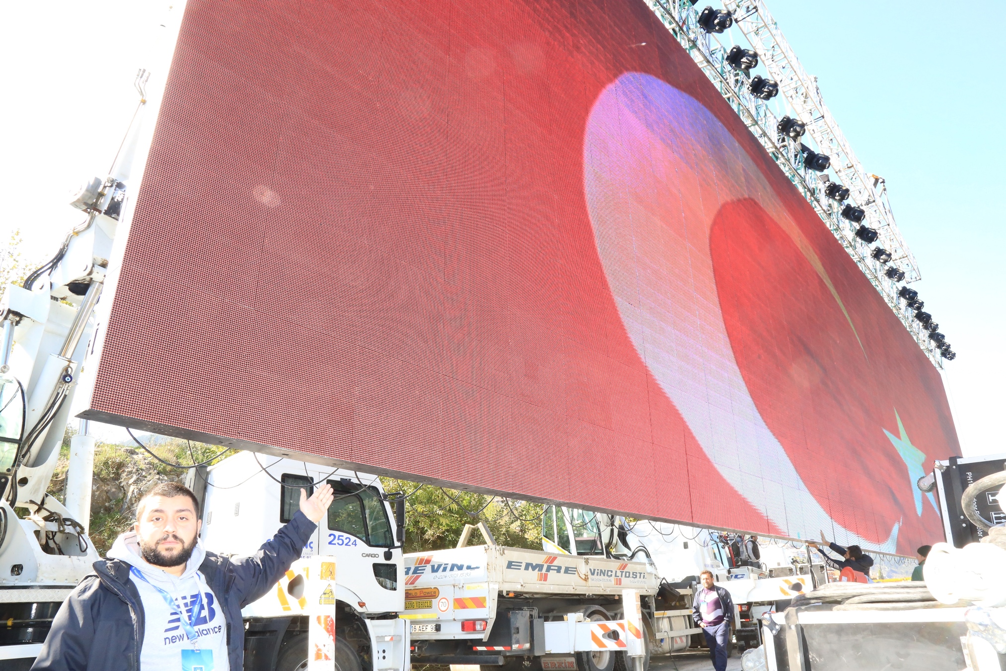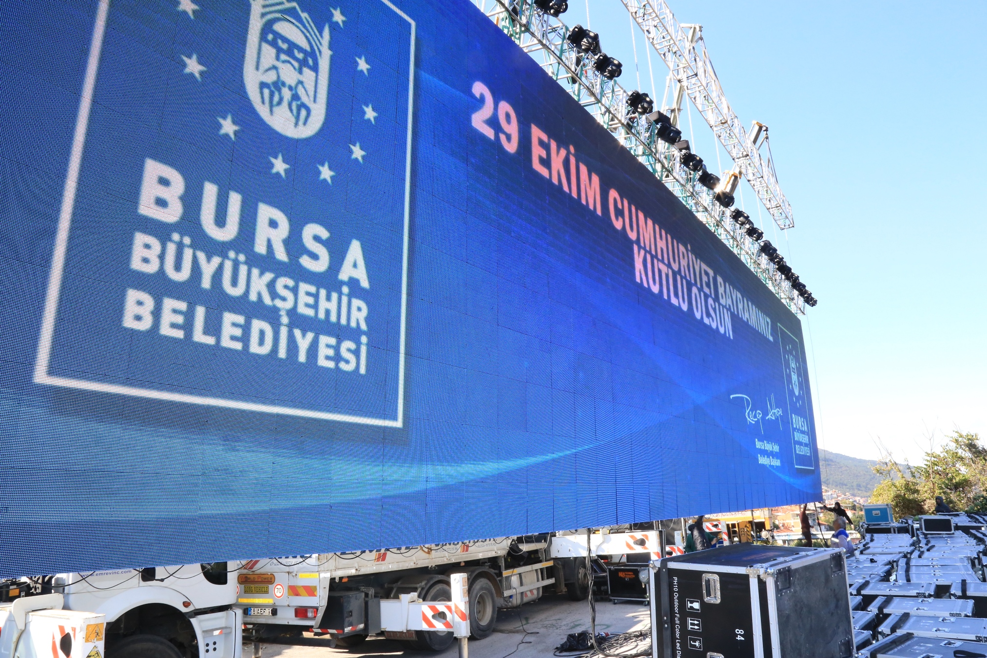 Öte yandan etkinlikler kapsamında Hünkar Köşkü’ne 260 metrekare büyüklüğünde dev bir ekran kuruldu. Ağırlıklı olarak dev bir Türk Bayrağı’nın yansıtıldığı ekran, ovanın hakim her noktasından izlenebildi. Dev ekranda gün boyunca, Cumhuriyet Bayramı ile Büyükşehir Belediye Başkanı Recep Altepe’nin Cumhuriyet’e dair mesajları yer aldı.