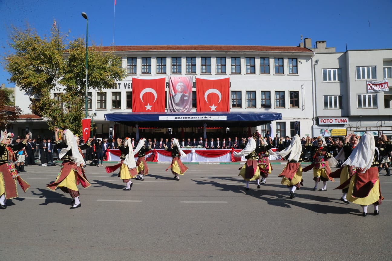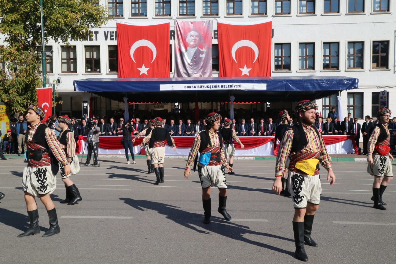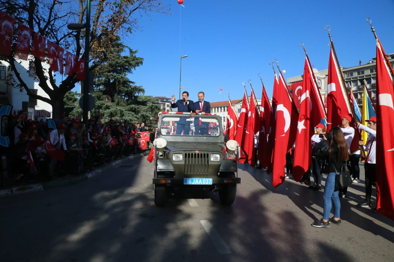 29 Ekim Cumhuriyet Bayramı resmi töreni, Bursa Valiliği’nde gerçekleştirildi. Bursa Valisi İzzettin Küçük ile Bursa Büyükşehir Belediye Başkanı Alinur Aktaş, tebrikleri kabul etti. Vali Küçük ile Başkan Aktaş, Atatürk Anıtı önünde gerçekleştirilen törende de halkın bayramını kutladı. İstiklal Marşı’nın okunması ve Türk Bayrağı’nın göndere çekilmesinin ardından Bursa Valisi İzzettin Küçük, ‘29 Ekim Cumhuriyet Bayramı’nın anlam ve önemine dikkati çeken bir konuşma yaptı. Şiirlerin okunduğu, halk dansları ve kılıç kalkan ekibinin gösterisiyle renklenen program tören geçişi ile sona erdi. Resmi geçit törenini takiben Cumhuriyet yürüyüşü gerçekleştirildi. Yürüyüşe katılan vatandaşlar, Atatürk Anıtı önünden başlayarak İnönü Caddesi ve Cumhuriyet Caddesi’nden Zafer Meydanı’na kadar yürüdü. Vatandaşlar, Türk Bayrakları eşliğinde yürürken, marşlar da söyleyerek Cumhuriyet Bayramı’nın coşkusunu doyasıya yaşadı.