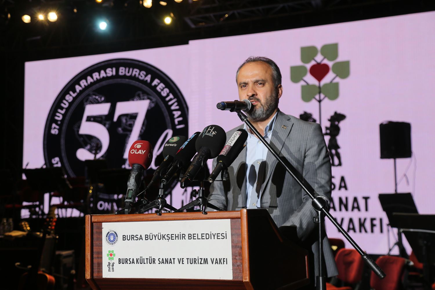 Büyükşehir Belediye Başkanı Alinur Aktaş, festivalin açılış töreninde yaptığı konuşmada, ‘Uluslararası Bursa Festivali’nin 1962 yılından bu yana gerçekleştirilen bir gelenek olduğunu söyledi. Kentin önemli bir değeri haline gelen etkinliğin Bursa’nın tanıtımına bir kez daha büyük katkı sağlayacağını vurgulayan Başkan Aktaş, “Burası tüm özelliklerinin yanında bir kültür sanat şehridir. Şehrin en güzel geleneklerinden biri olan ‘57. Uluslararası Bursa Festivali, muhteşem bir konserle başlıyor. 20 Temmuz’a kadar da alanında usta sanatçılar bizim için buraya geliyor” dedi.