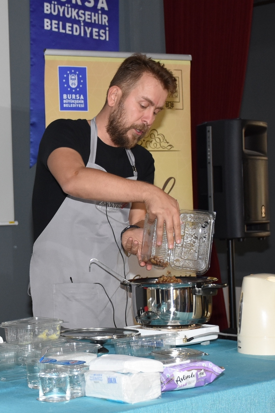 Bursa Büyükşehir Belediyesi tarafından şehre ve Türkiye’nin vakıf kültürüne kazandırdığı Vakıf Kültürü Müzesi, Geçmişten günümüze aşurenin tarihi ve tarifi” konulu programa ev sahipliği yaptı. Ünlü Şef ve Yazar Ömür Akkor’un konuşmacı olarak katıldığı söyleşiye, özellikle kadınlar büyük ilgi gösterdi. Aşurenin tarihçesini ve Müslümanlar için önemini anlatan Ömür Akkor, aynı zamanda sahnede aşure yaparak birebir inceliklerini anlattı. Özellikle Türklerde mutfak kültürünün önemli olduğunu anlatan Ömür Akkor, Osmanlı zamanında sayısız aşure çeşidi uygulandığını belirtti. Klasik 7 malzemenin dışında 20’den fazla malzemenin aşurelerde kullanıldığını anlatan Akkor, “Aşurenin etlisinden tuzlusuna, tereyağlısına kadar her türlüsü denenmiş. Tuzlusuna keşkek denmiş. Fatih Sultan Mehmed’in aşure de kimyonu tercih ettiği söylenir. Hatta bir rivayete göre Peygamber Efendimiz zamanında da aşurede kimyon kullanılmış. Hatta aşurenin bir cennet nimeti olduğu söylenir” dedi.