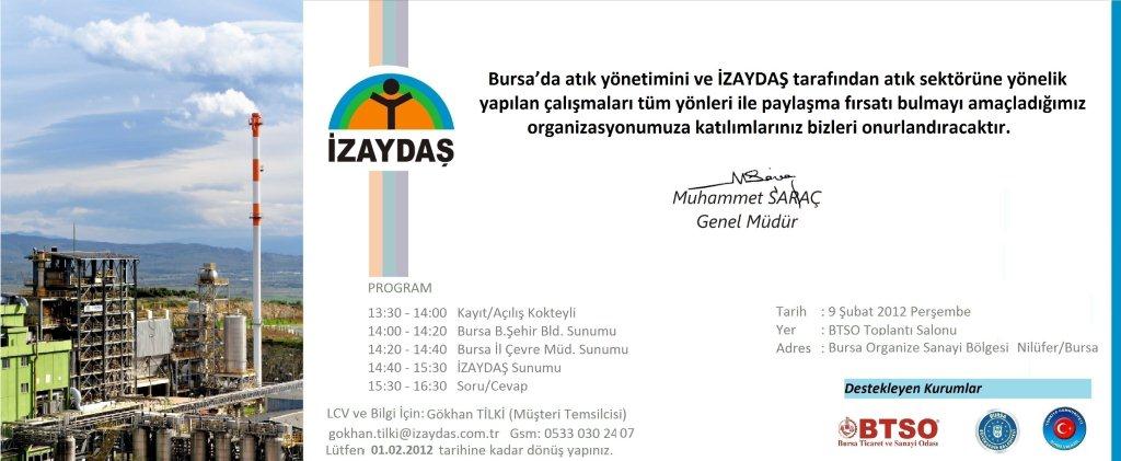 ‘Temiz Çevre Temiz Toplum’ ilkesiyle çalışmalarına yön veren İzmit Atık ve Artıkları Arıtma Yakma ve Değerlendirme A.Ş. (İZAYDAŞ) tarafından hayata geçirilecek olan programda, Bursa’da atık yönetimi ve atık sektörüne yönelik yapılan tüm çalışmaların değerlendirileceği bilgi paylaşımı toplantısı, 9 Şubat Perşembe günü saat 13.30’da Bursa Ticaret ve Sanayi Odası (BTSO) toplantı salonunda gerçekleştirilecek.
