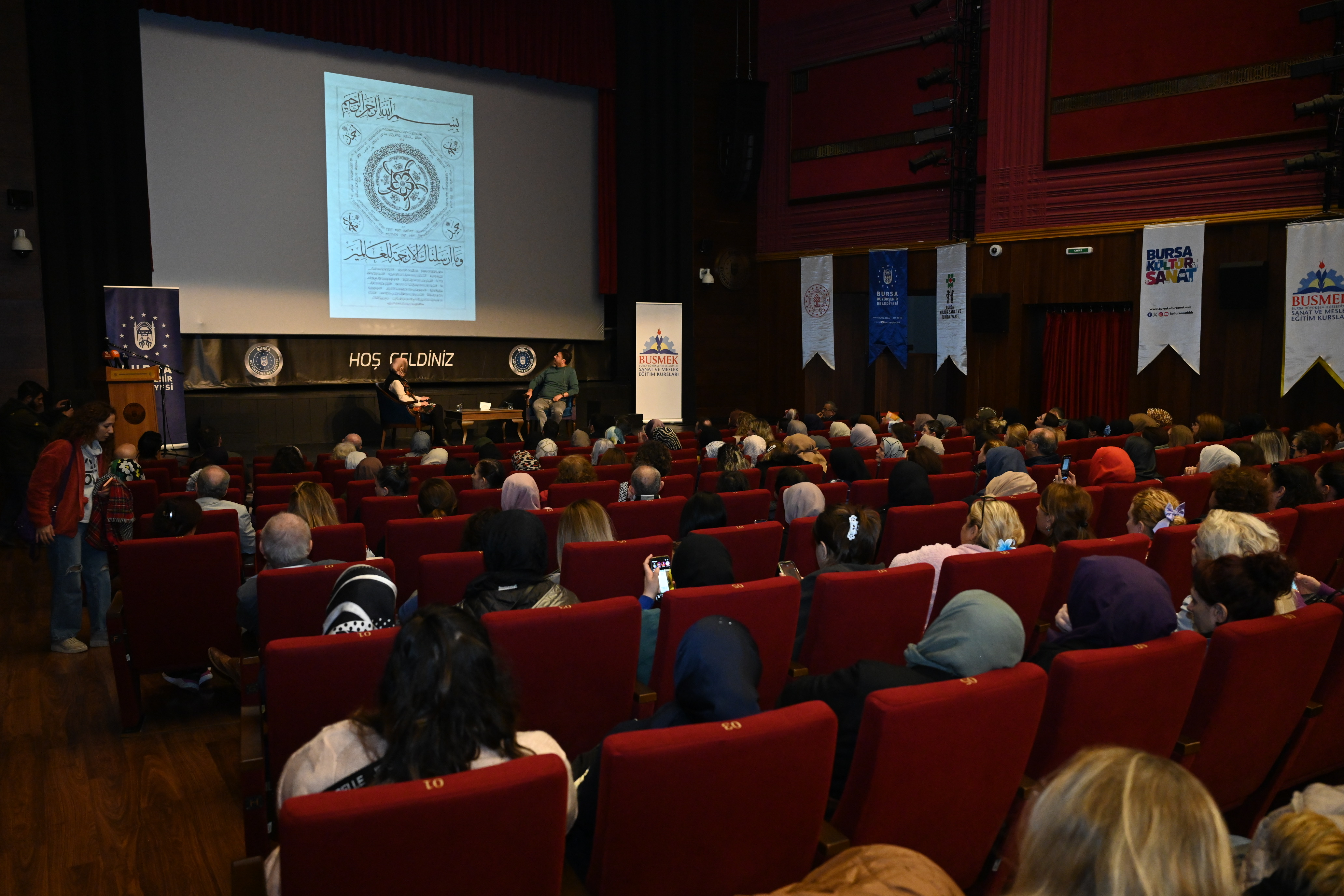 Bursa’dan altyapıdan spora kadar birçok alanda çalışmalarını aralıksız sürdüren Bursa Büyükşehir Belediyesi, şehrin kültürel ve sanatsal hayatına katkı sunmaya da devam ediyor. Adeta bir halk üniversitesine dönüşen BUSMEK marifetiyle ücretsiz sanat ve meslek eğitimlerinin yanı sıra hüsnühat, tezhip, ebru ve minyatür gibi Türk İslam El Sanatlarına da gereken önemi veren Büyükşehir Belediyesi, geleneksel Türk-İslam El Sanatlarını yaşatma vizyonuyla düzenlediğimiz faaliyetlere ‘Hilye-i Şerif ve İsm-i Nebi Sergisi’ni de ekledi. BUSMEK sanatçıları tarafından büyük emekle hazırlanan 31 nadide eserden oluşan sergi, 13-18 Kasım tarihleri arasında Tayyare Kültür Merkezi’nde ziyaret edilebilecek. Sergi öncesinde Ankara Hacı Bayram Veli Üniversitesi’nden Öğretim Görevlisi Asiye Kafalıer Dönmez ve Marmara Üniversitesi’nden Hattat Prof. Dr. Fatih Özkafa’nın katılımıyla düzenlenen panele de sanatseverler büyük ilgi gösterdi.
