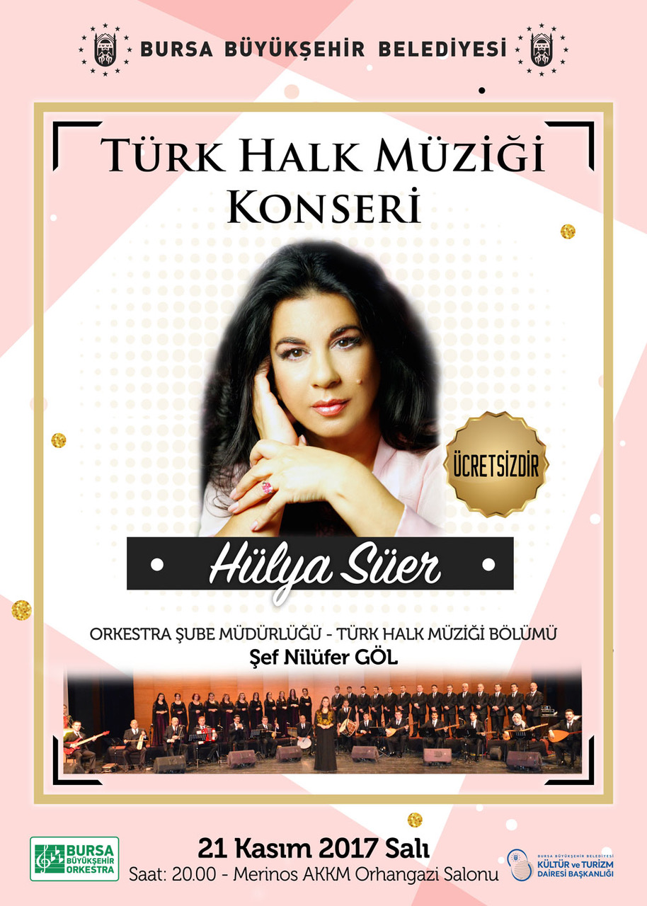 BURSA – Bursa Büyükşehir Belediyesi Orkestra Şube Müdürlüğü Türk Halk Müziği Bölümü’nün ünlü sanatçı Hülya Süer’i ağırlayacağı muhteşem konser, 21 Kasım Salı günü saat 20.00’da Atatürk Kongre Kültür Merkezi (Merinos AKKM) Orhangazi Salonu’nda gerçekleştirilecek.