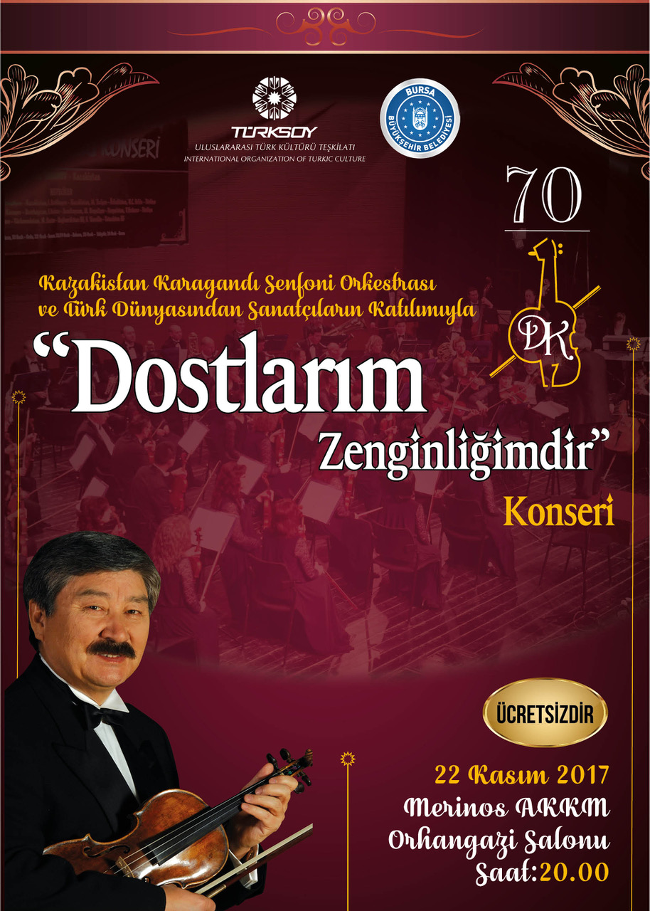 Diğer yandan, Bursa Büyükşehir Belediyesi ve TÜRKSOY tarafından, Kazakistan Karagandı Senfoni Orkestrası ve Türk Dünyasından sanatçıların katılımıyla gerçekleştirilecek ‘Dostlarım Zenginliğimdir’ konseri ise 22 Kasım Çarşamba günü saat 20.00’da Merinos AKKM Orhangazi Salonu’nda gerçekleştirilecektir.