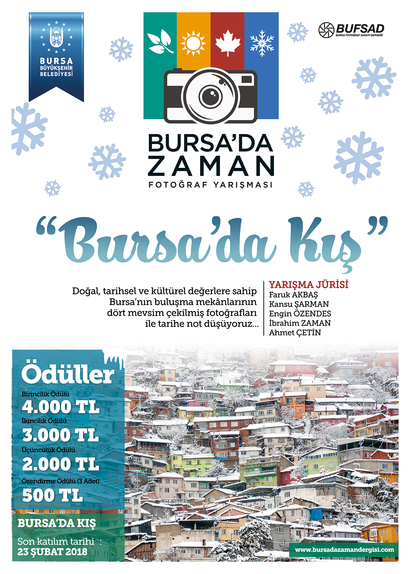 Bu yıl Bursa’nın buluşma mekanlarını konu alan fotoğraf yarışmasının ‘Kış Kategorisi’ne başvurular başladı. Son katılım tarihinin 23 Şubat 2018 olduğu bu etapta da yarışmaya başvurular www.bursadazamandergisi.com adresine yapılacak. Fotoğraf sanatçısı Faruk Akbaş, Fotoğraf sanatçısı Engin Özendes, ATLAS Dergisi Genel Yayın Yönetmeni Kansu Şarman, Fotoğraf sanatçısı İbrahim Zaman ve Fotoğraf sanatçısı Ahmet Çetin’den oluşan Seçici Kurul 24 Şubat 2018’de değerlendirmeyi yapacak, sonuçlar 27 Şubat 2018’de açıklanacak ve 03 Mart 2018’de de ödül töreni gerçekleştirilecek.